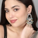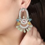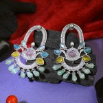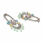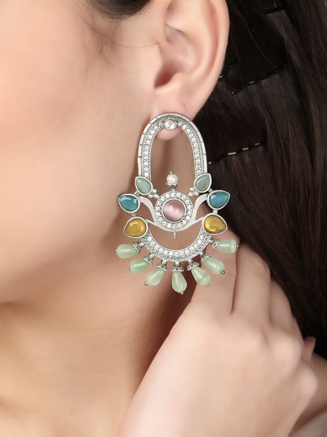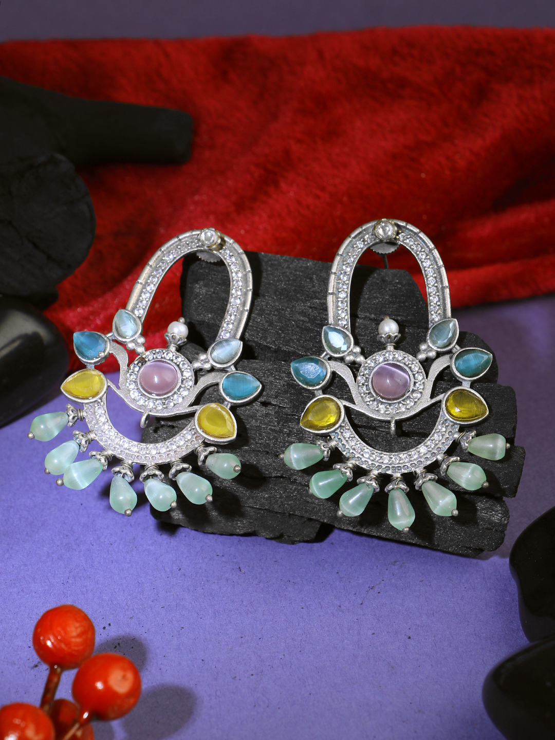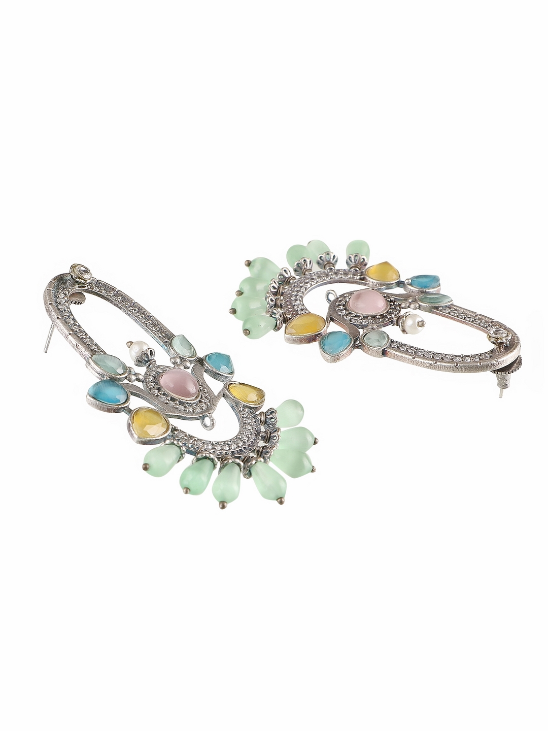 Oxidised Multi Stone-Studded Colorful Pearl-Tessels Drop Earrings. Our Silver plating is long lasting and non allergic to skin,and has artificial stones,Secured with a fraction Back closure.