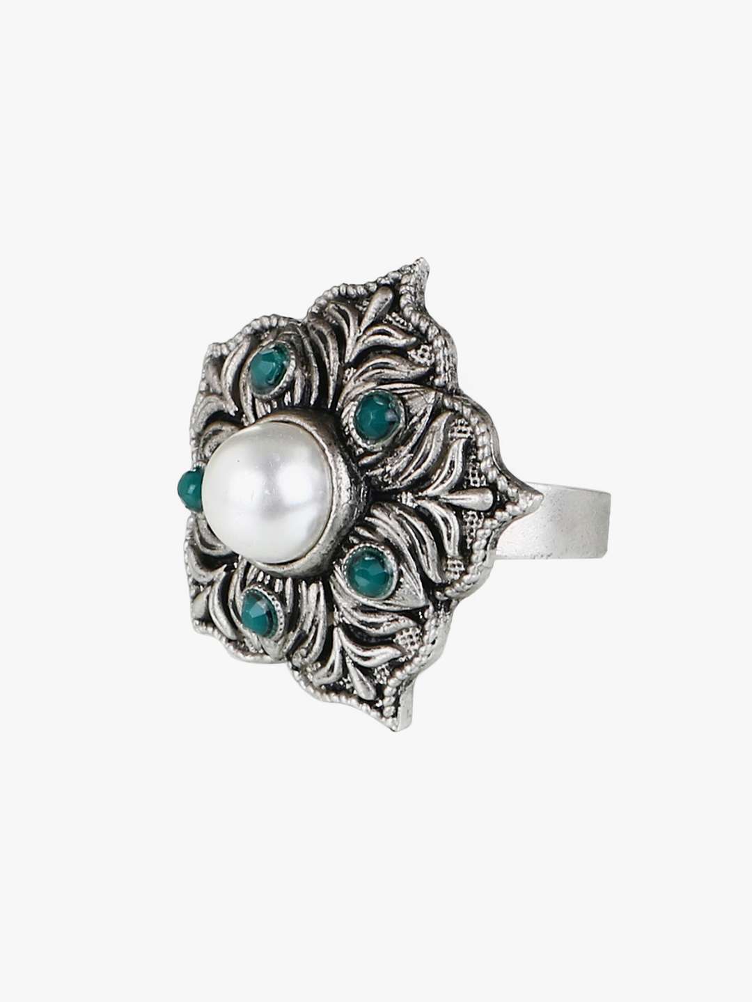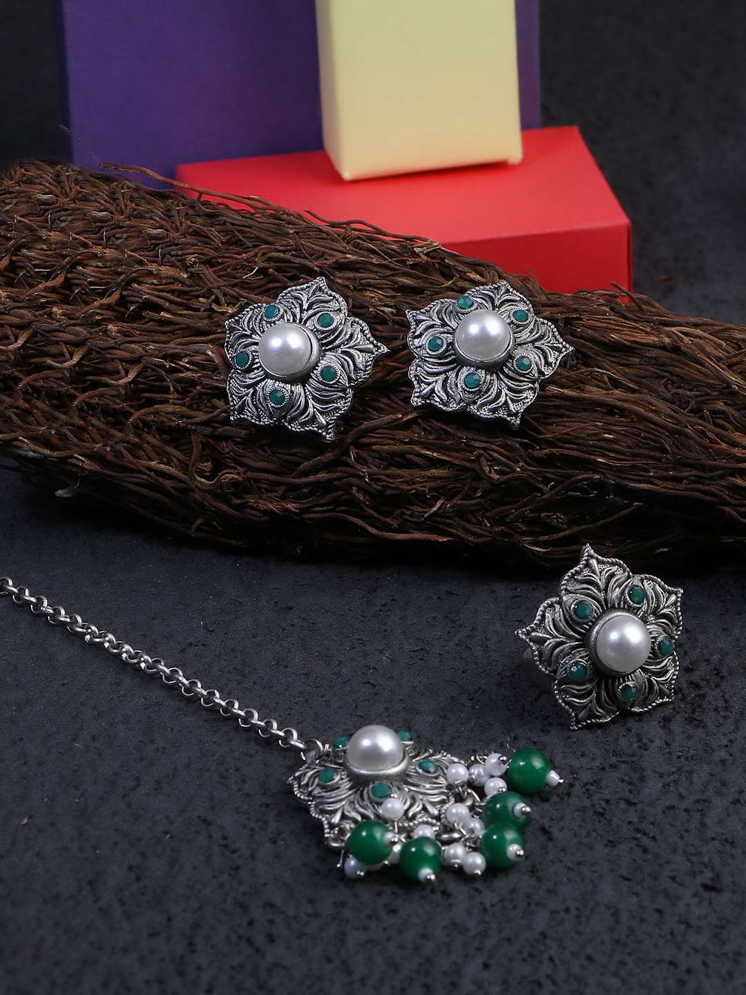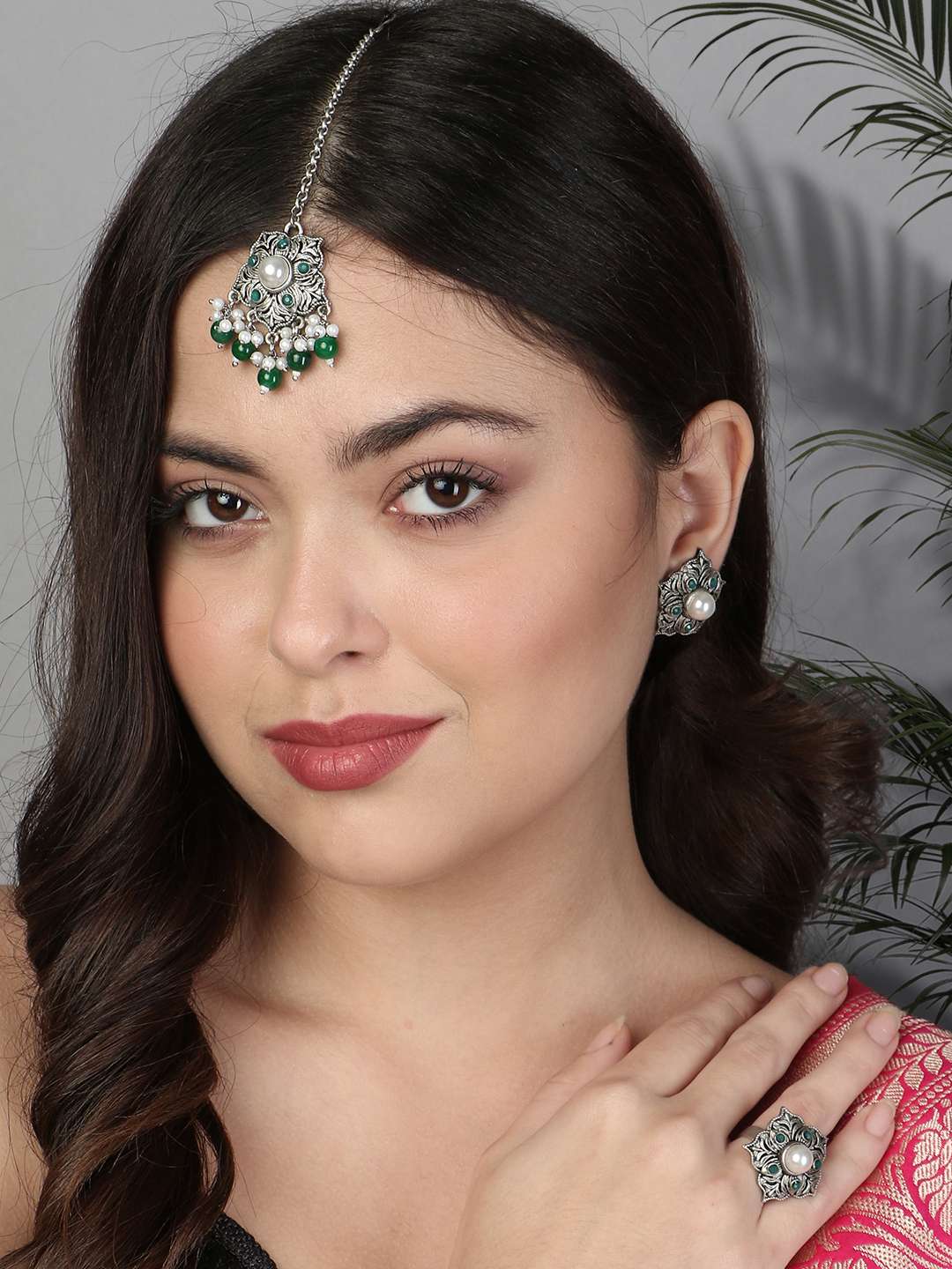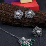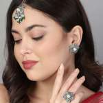 Combo of 3 Silver-Plated Earring, Maangtika and ring. Our Silver plating is long lasting and non allergic to skin,and has artificial stones,Secured with a fraction Back closure.