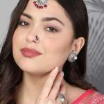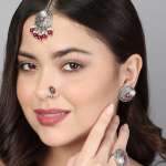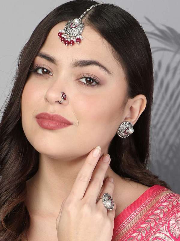 Combo of 4 Silver-Plated Aritifical Jewellery Maangtika ring Studs and NosePin. Our Silver plating is long lasting and non allergic to skin,and has artificial stones,Secured with a fraction Back closure.