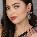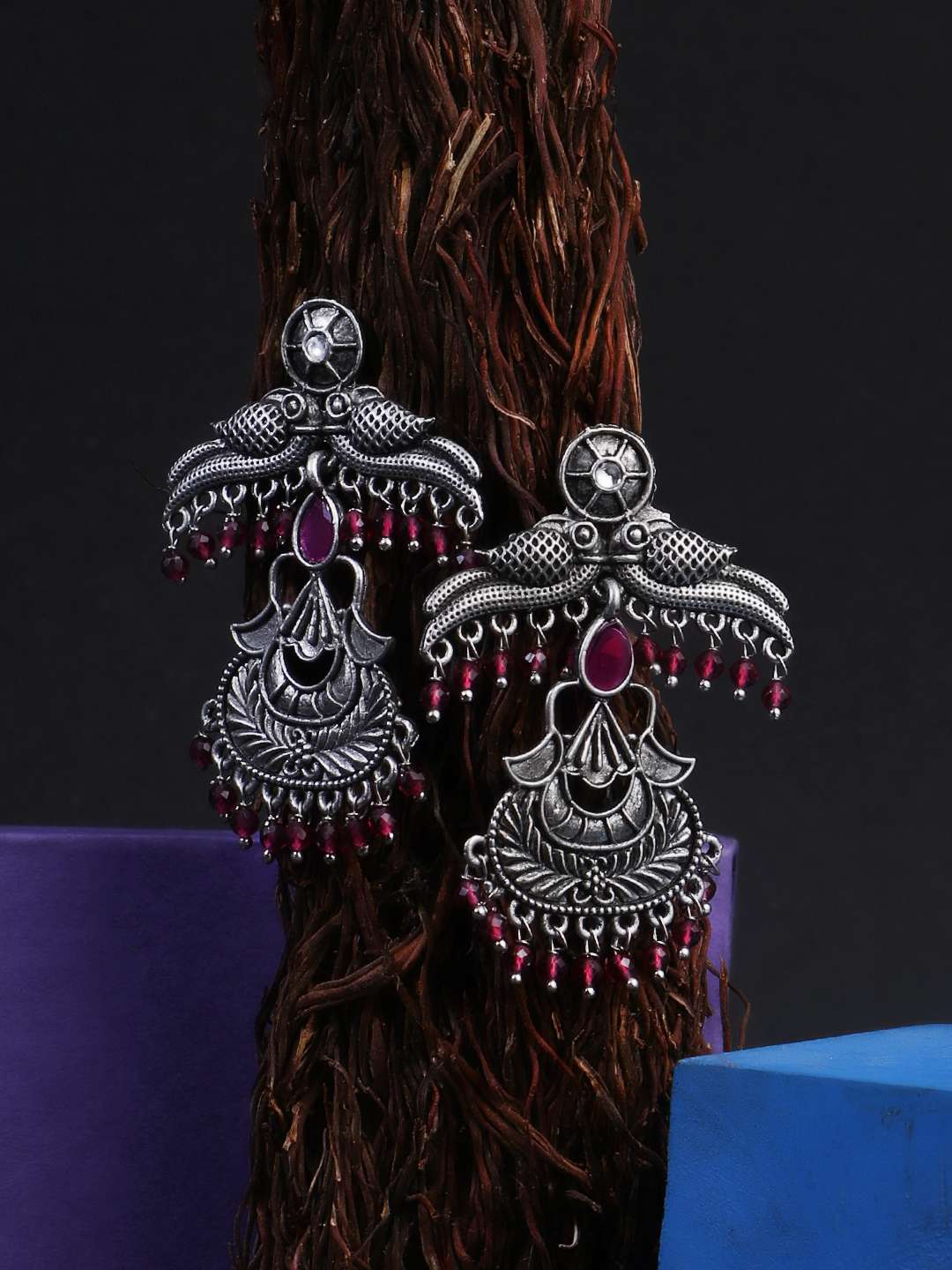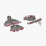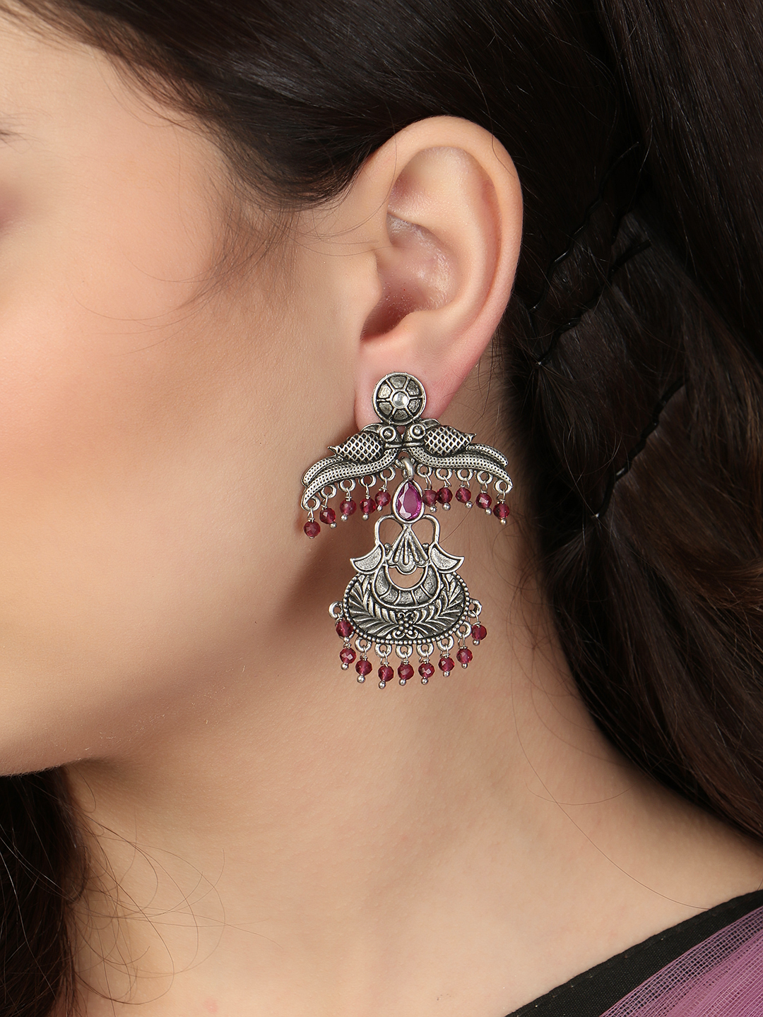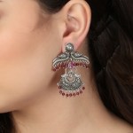 Oxidised Pink Stone-Studded Pearl-Tessel Peacock-Temple Earrings. Our Silver plating is long lasting and non allergic to skin,and has artificial stones,Secured with a fraction Back closure.