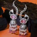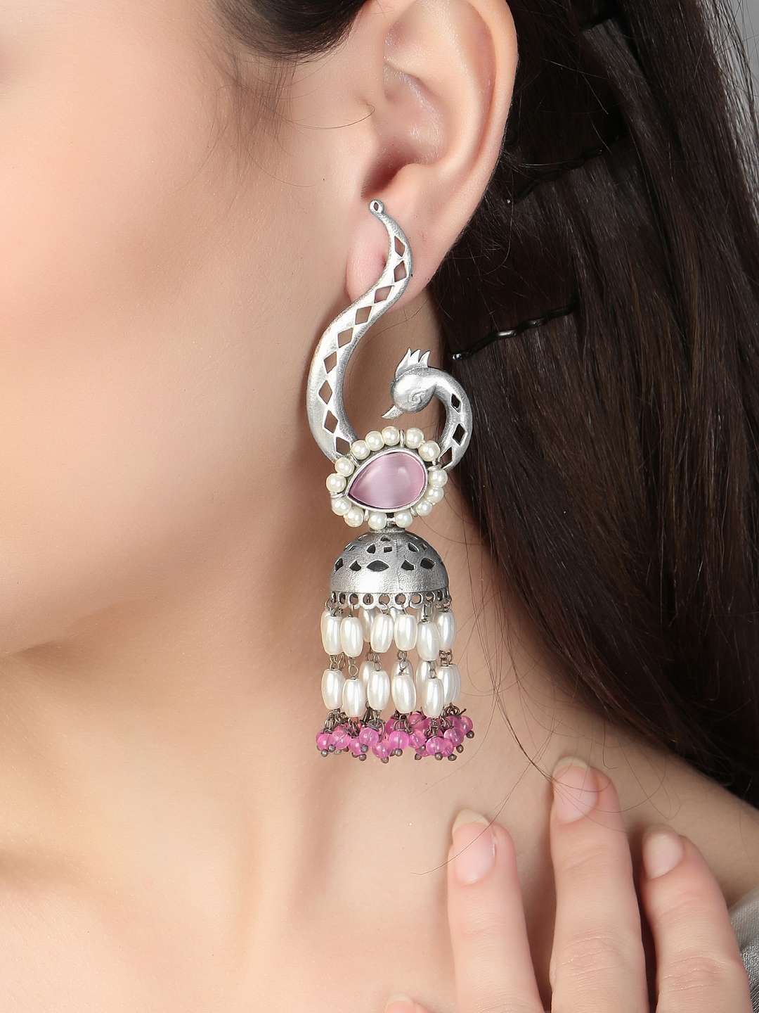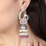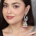 Oxidised Pink & White Stone-Studded Pink & White Pearl-Tessels Earrings Our Silver plating is long lasting and non allergic to skin,and has artificial stones,Secured with a fraction Back closure.