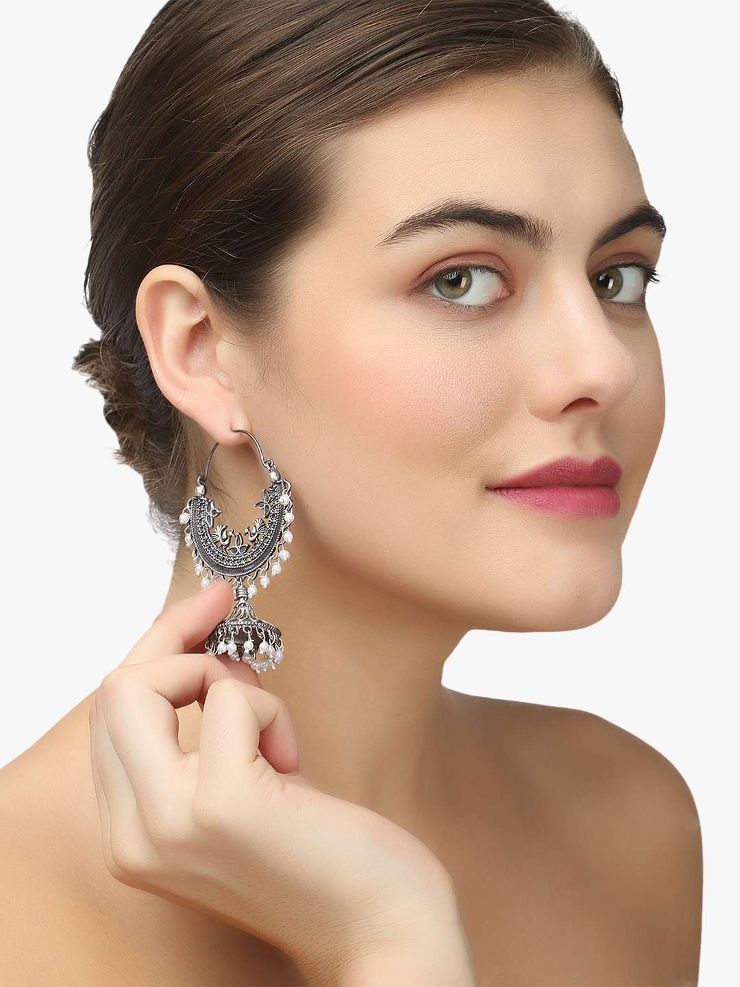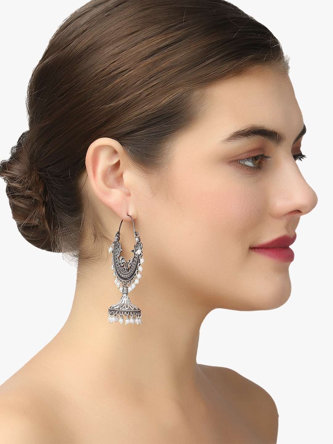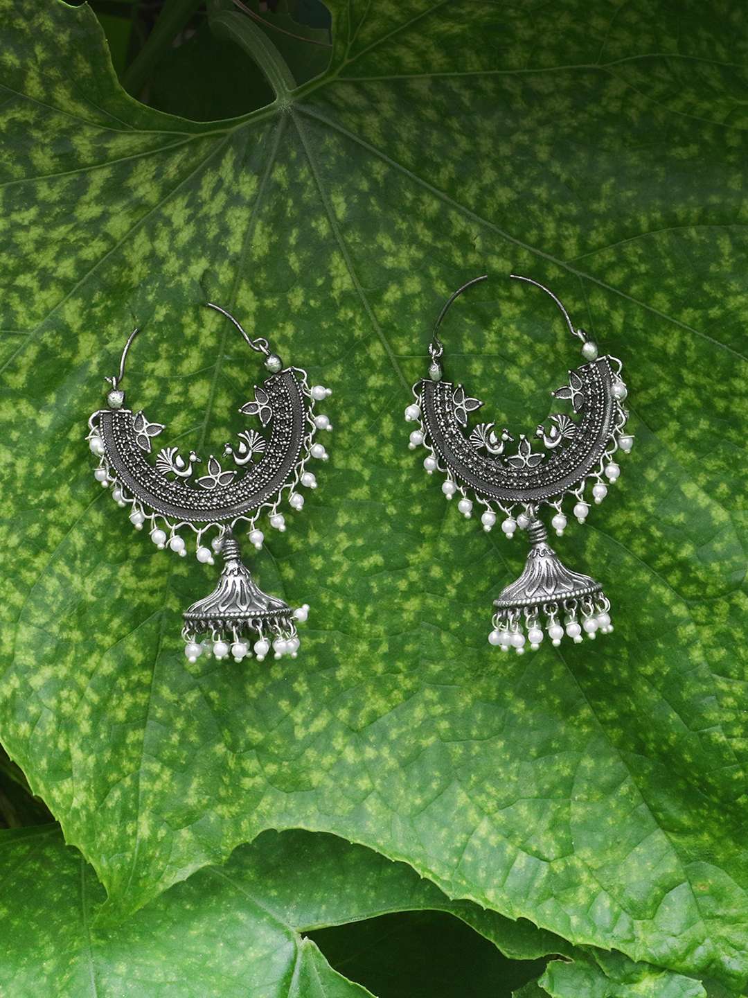 Women Oxidised Silver-Plated Chaandbaali Jhumkas Copper Jhumki Earring,Silver-plated,our Silver plating is long lasting and non allergic to skin,and has artificial stones,Secured with a post and back closure.