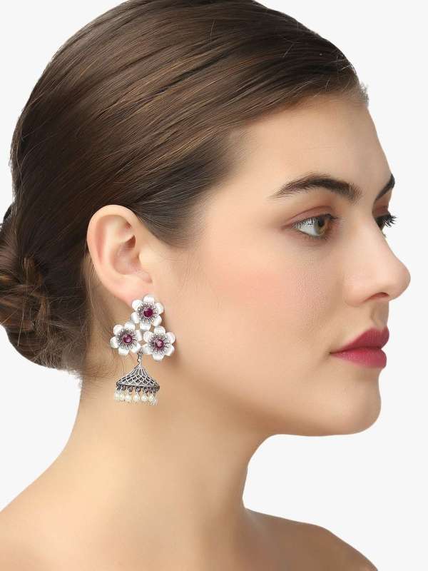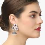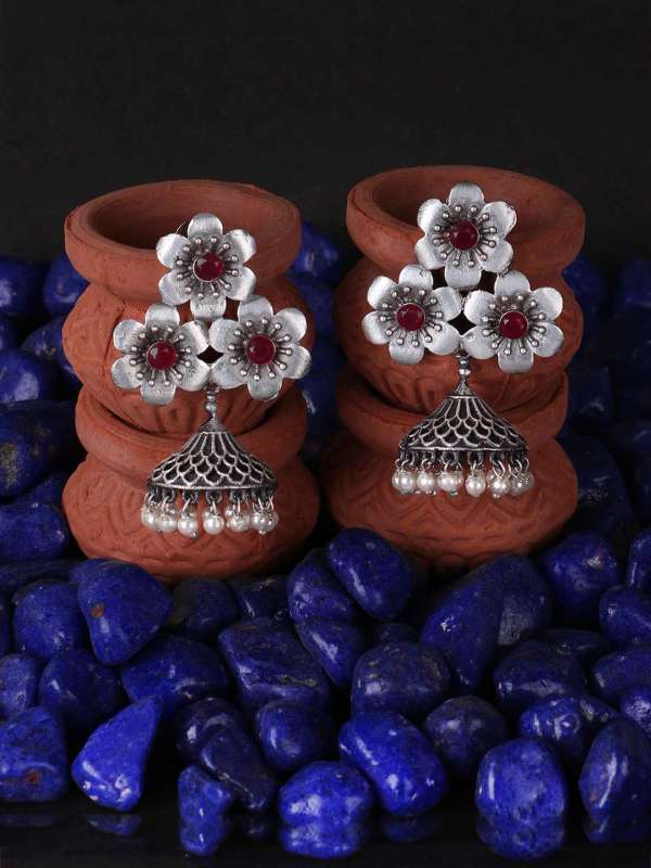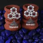 Women Oxidised Silver-Plated Flower Shape Jhumkas Copper Jhumki Earring,Silver-plated,our Silver plating is long lasting and non allergic to skin,and has artificial stones,Secured with a post and back closure.