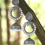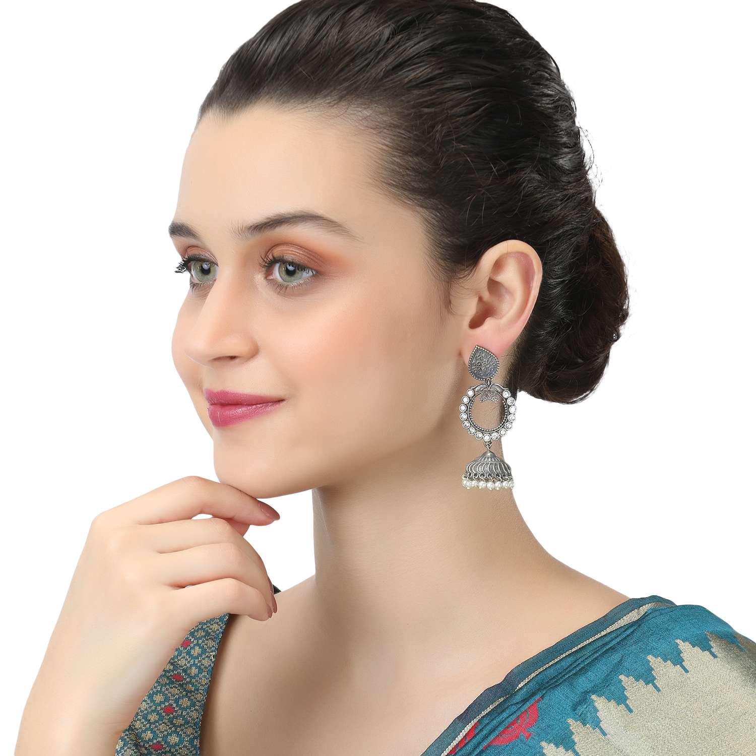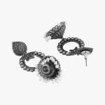 Oxidised silver-plated and stone-studded dome shaped Jhumki,Secured with a post and back and clip closure, Silver-plated, our Silver plating is long lasting and non allergic to skin,and has artificial stones,Secured with a post and back closure.