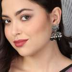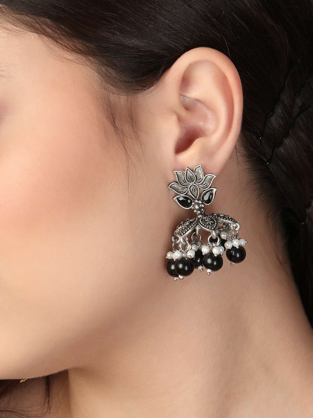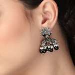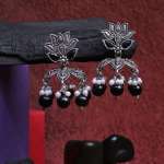 Oxidised Stone-Studded Pearl-Tessel Jhumki. Our Silver plating is long lasting and non allergic to skin,and has artificial stones,Secured with a fraction Back closure.