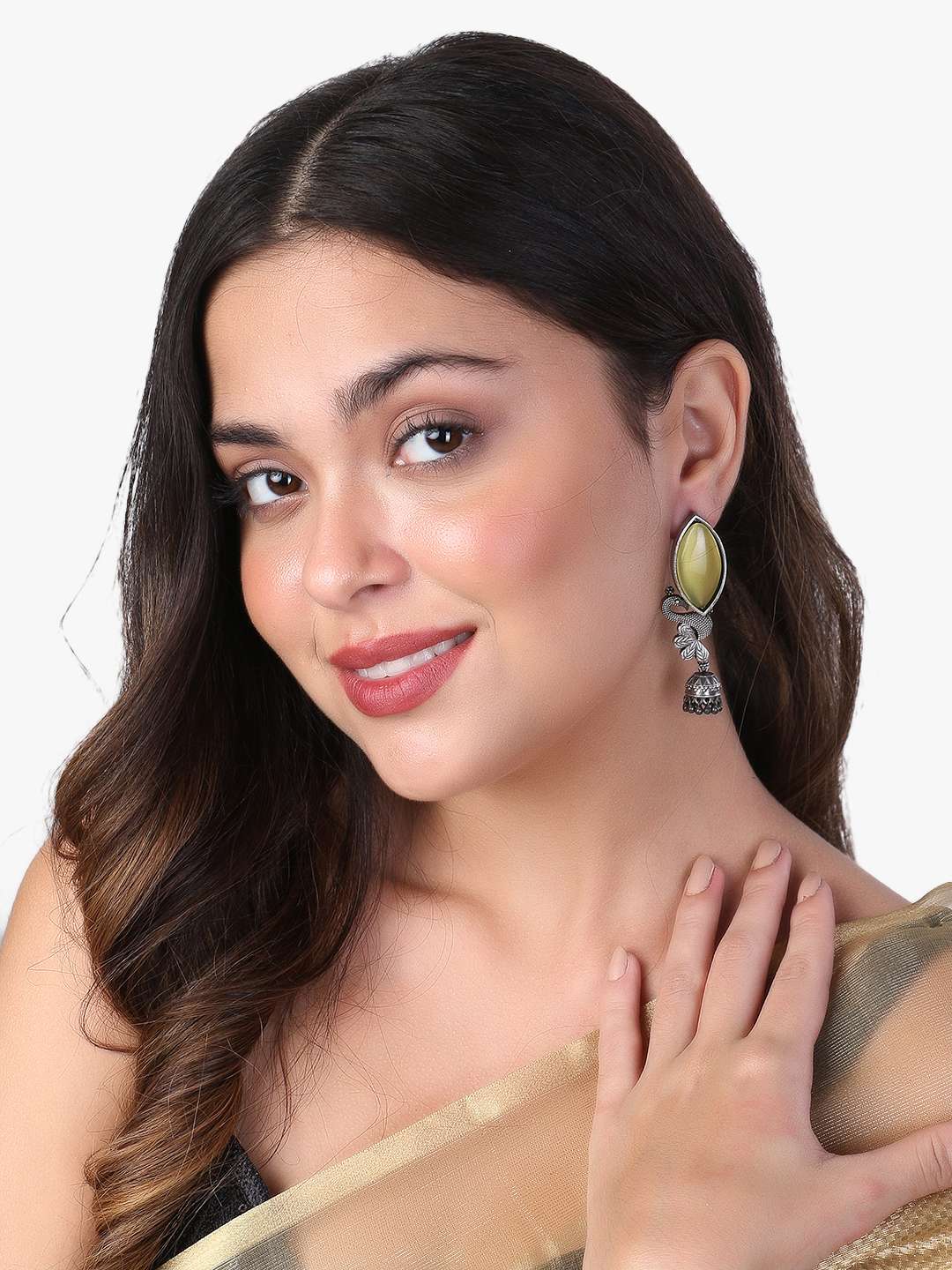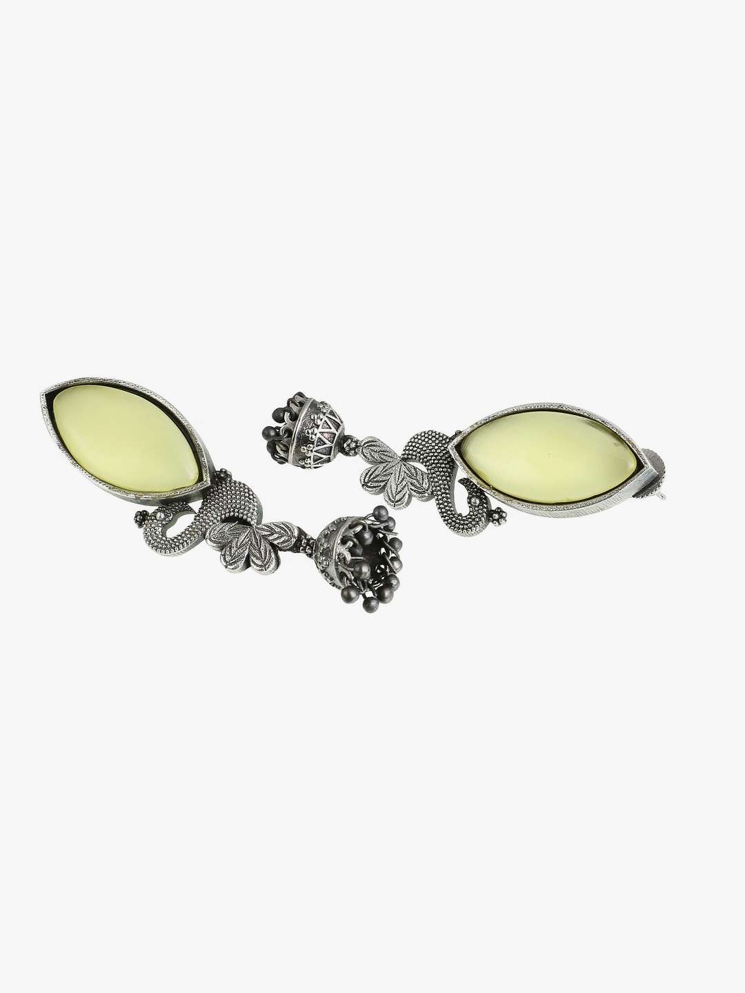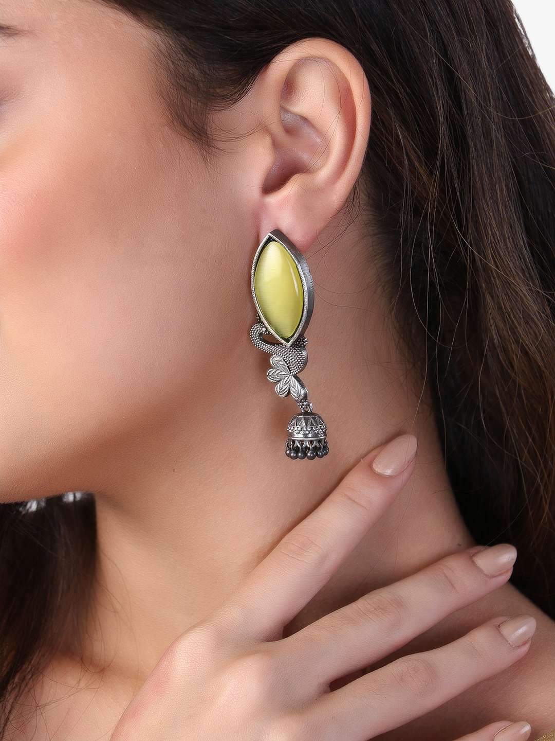 Women Silver Plated Handcrafted Yellow Stone-Studded Peacock Dome Jhumki ,Silver-plated,our Silver plating is long lasting and non allergic to skin,and has artificial stones,Secured with a Post back closure.