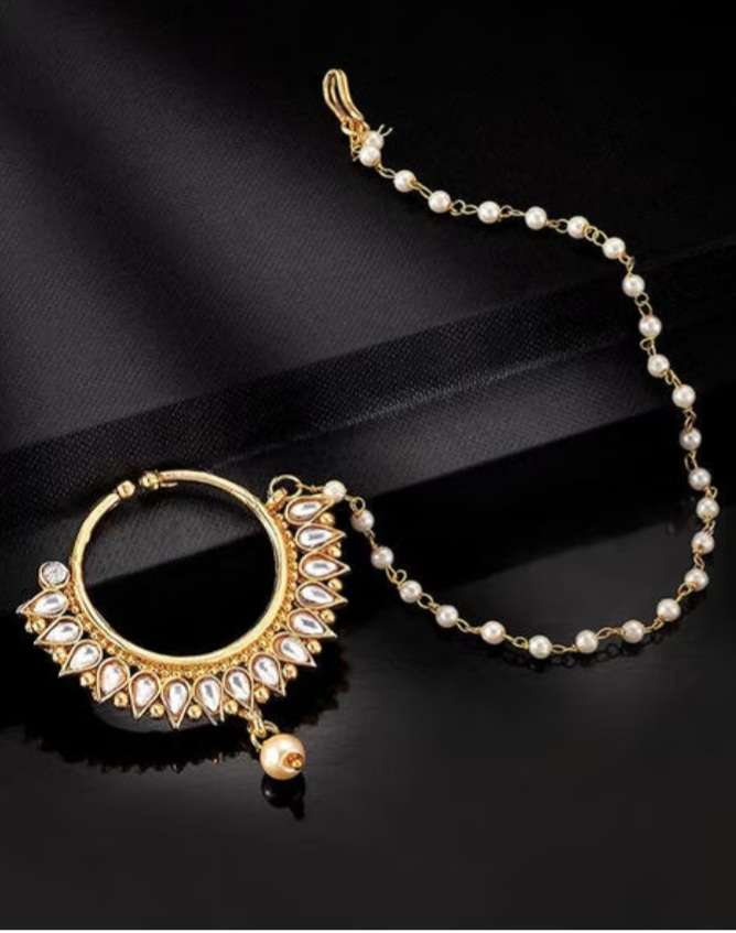 Peora Gold Plated Pearl Ad Nose Ring/Nath Pearl Chain Padmavati Jewellery