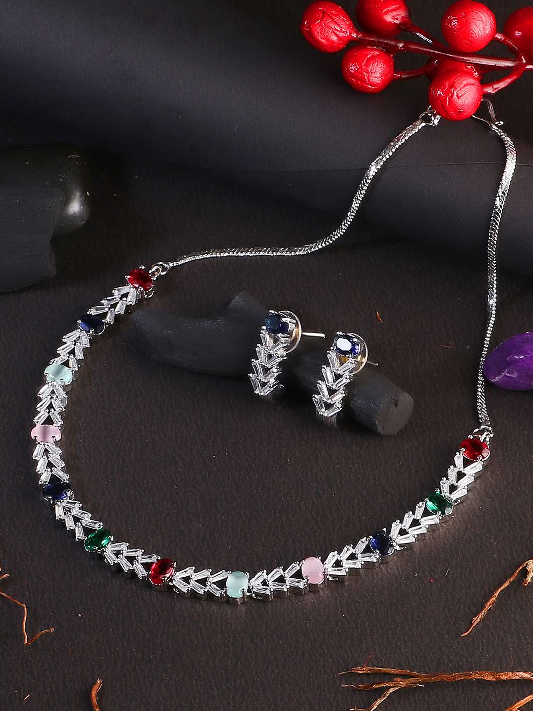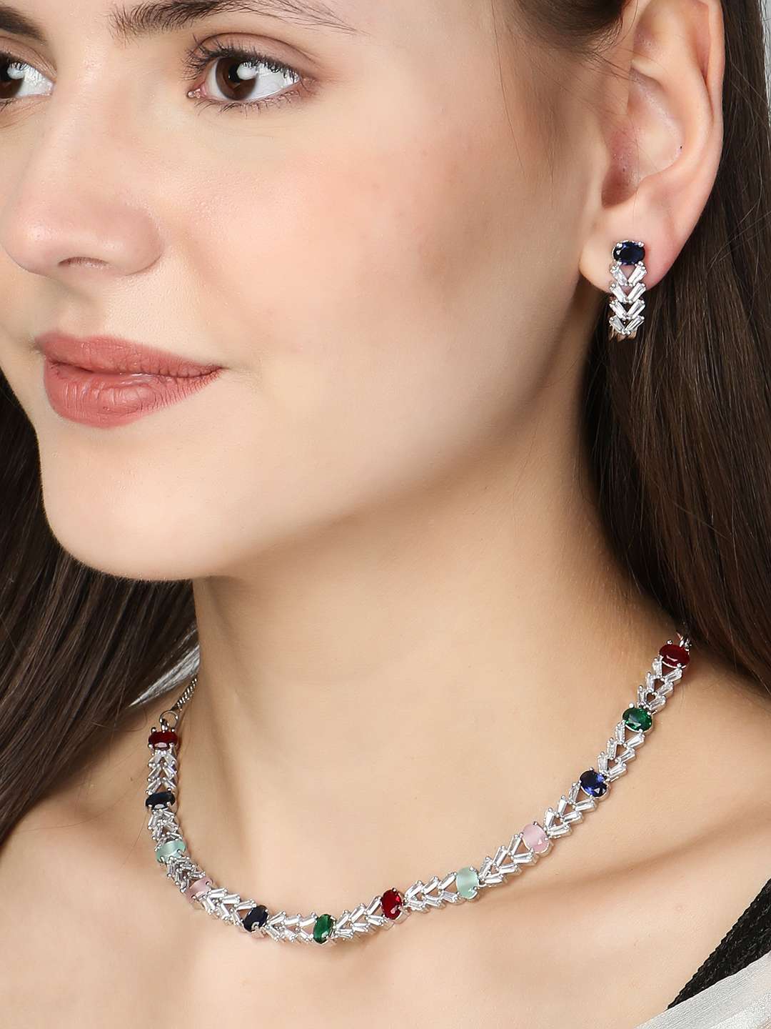 Rodium-Plated Stone -Studded Necklace & Earring Set This jewellery set consist Stone Rodium-plated and stranded with S-Hook closure.,our Rodium plating is long lasting and non allergic to skin.