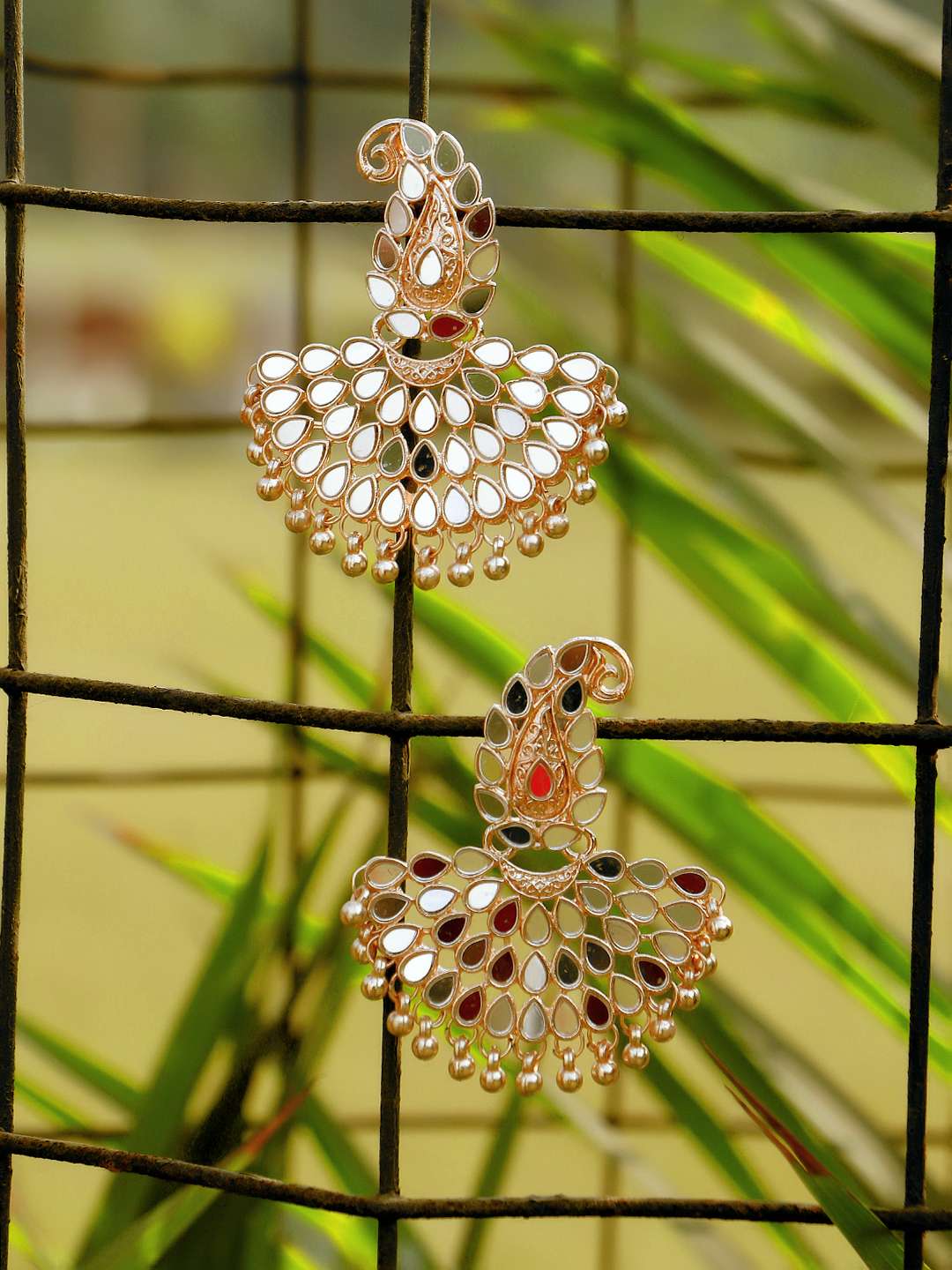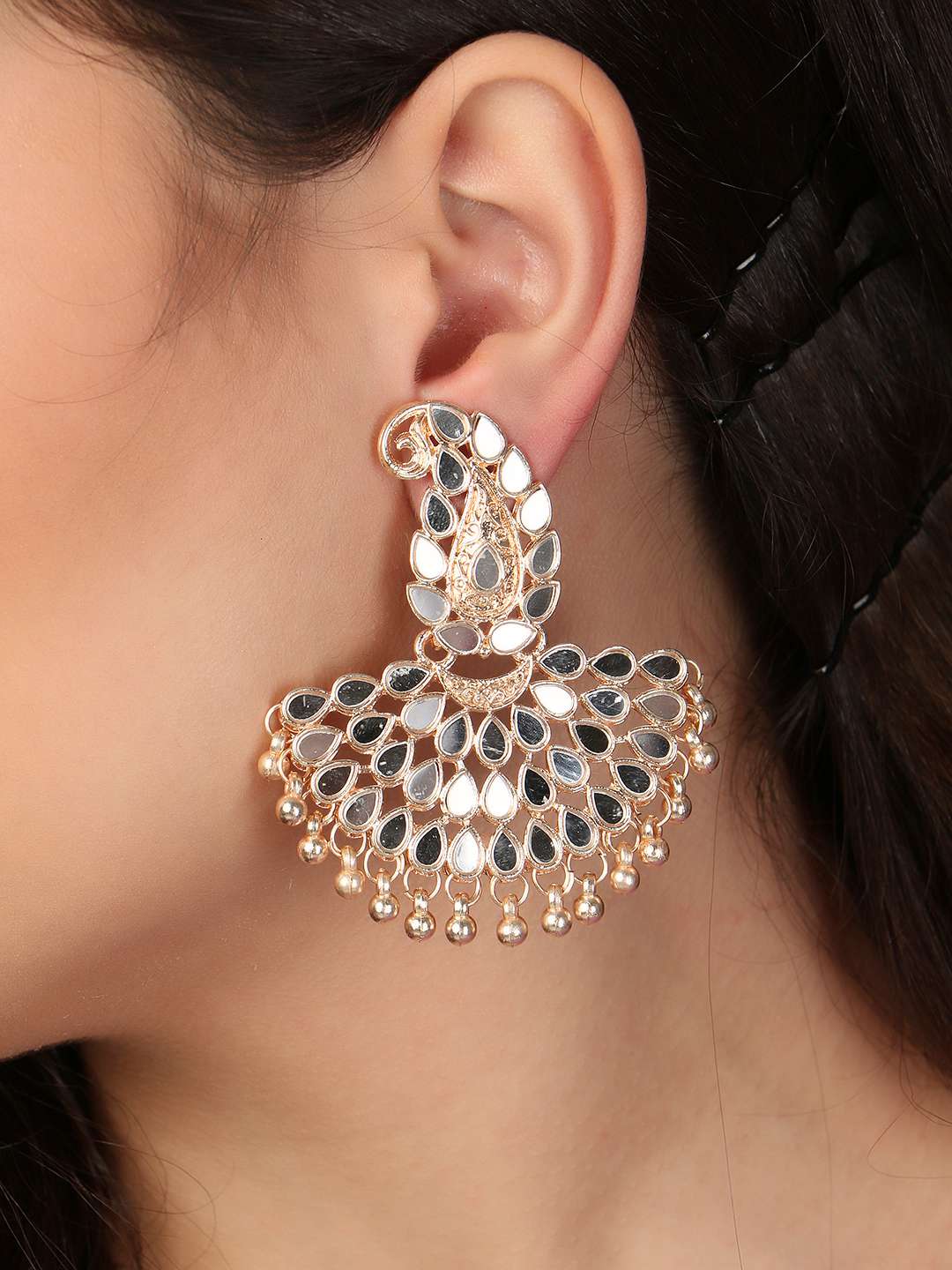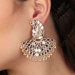 Rosegold-Plated Mirrror-Studded Pearl-Tessel Drop Earrings. Our Rose-Gold plating is long lasting and non allergic to skin,and has artificial stones,Secured with a fraction Back closure.