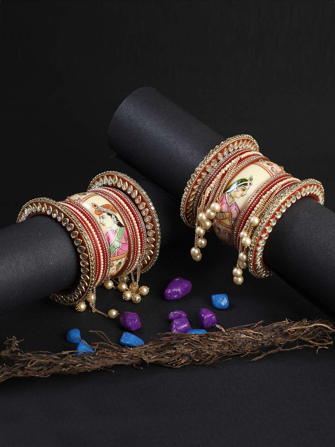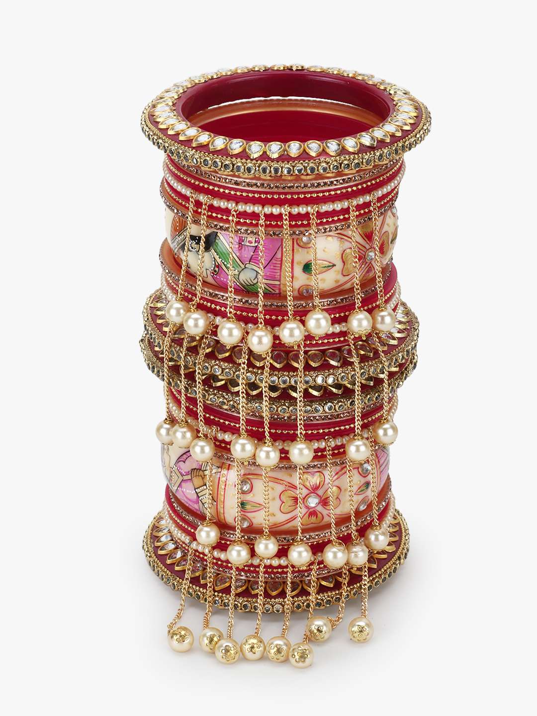 Set of 28 Plastic bangle Gold-plated Stone-Studded red and yellow Minakari Work Kudan Set Wedding Bridal embellished bangles&Chuda with intricate textured and beaded detailing, slip on closure,These are of High quality Stone studded and is long lasting and non allergic to skin.