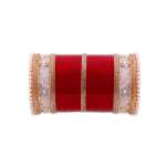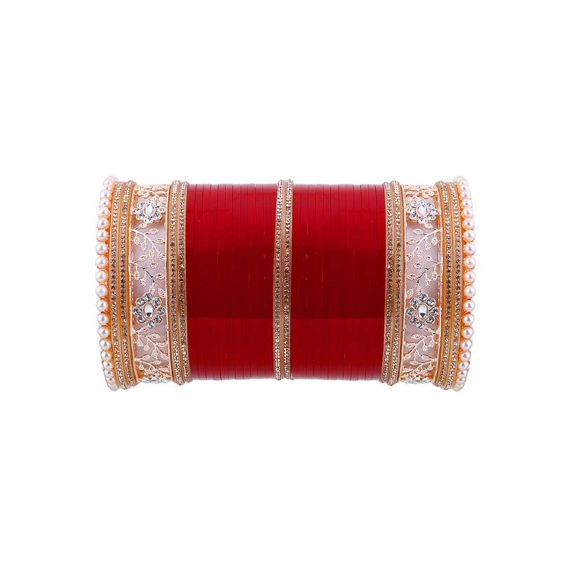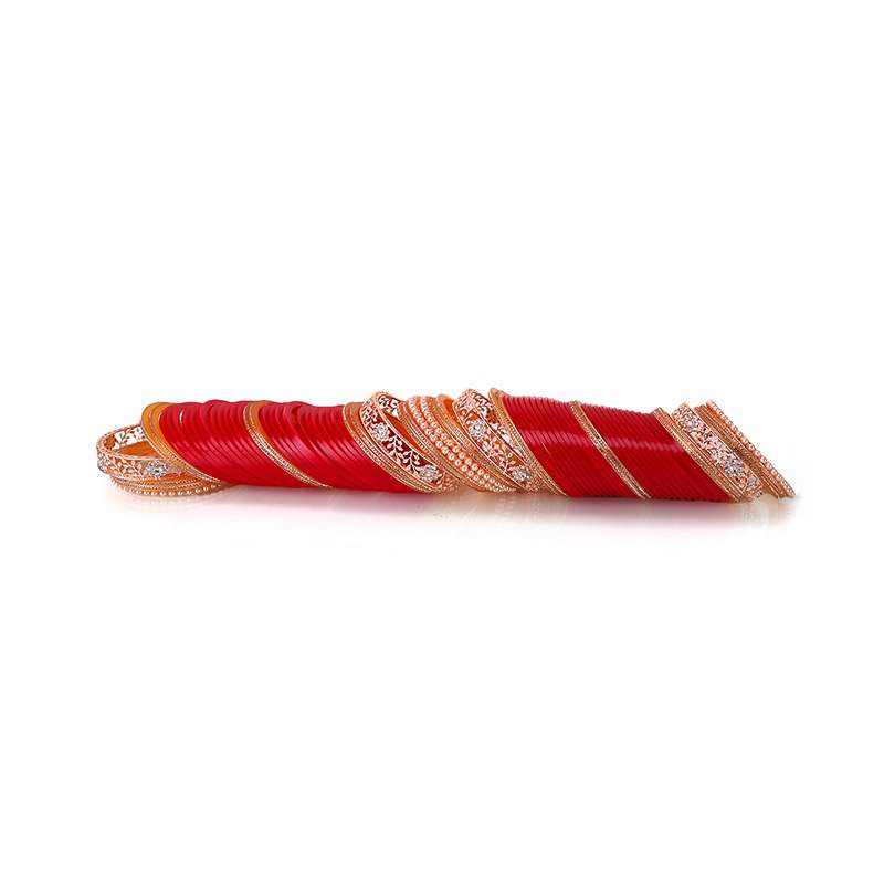 Set of 33 Acrylic bangle Red Gold-plated Stone-Studded Wedding Bridal embellished bangles&Chuda with intricate textured and beaded detailing, slip on closure,These are of High quality Stone studded and is long lasting and non allergic to skin.