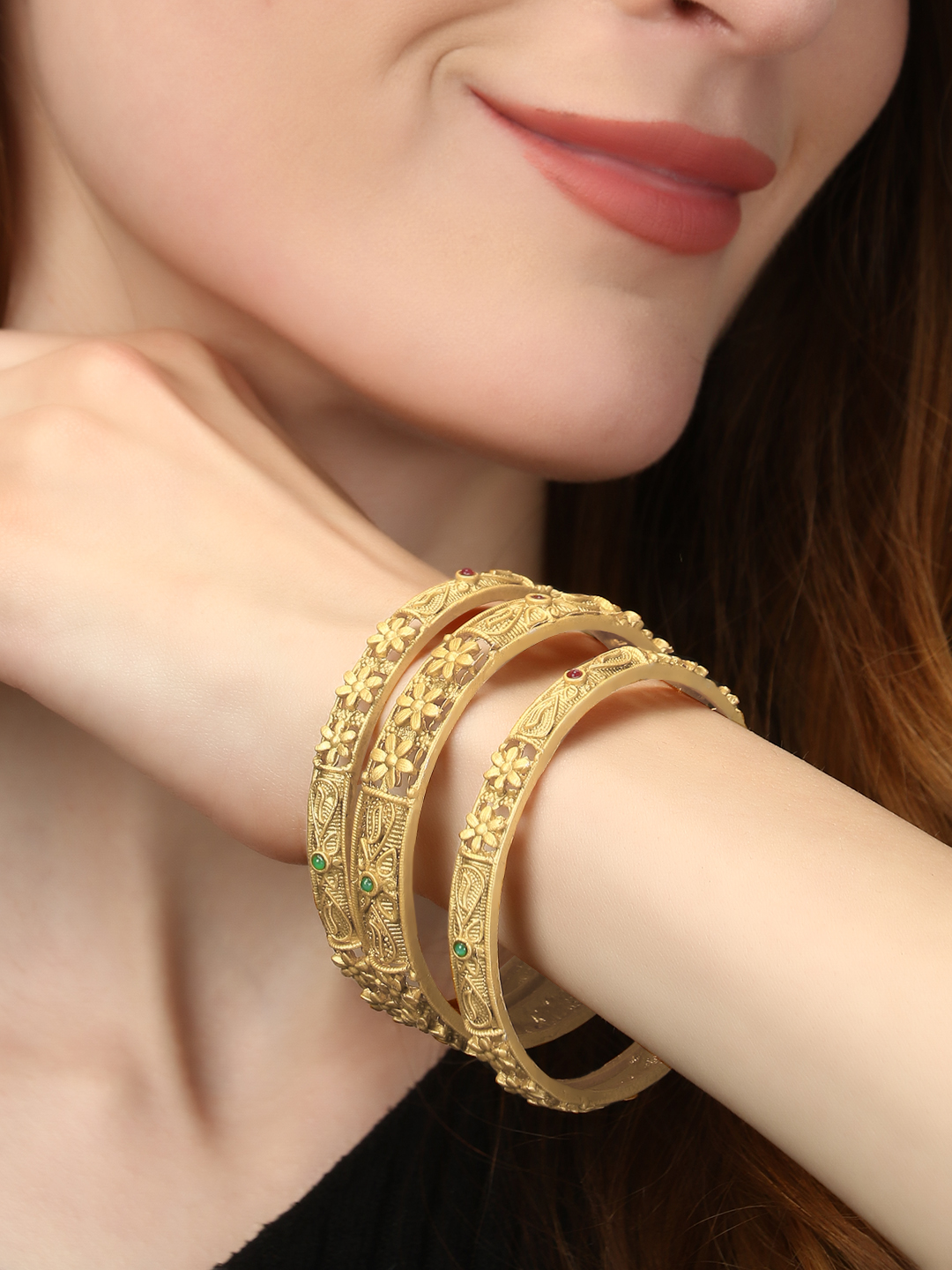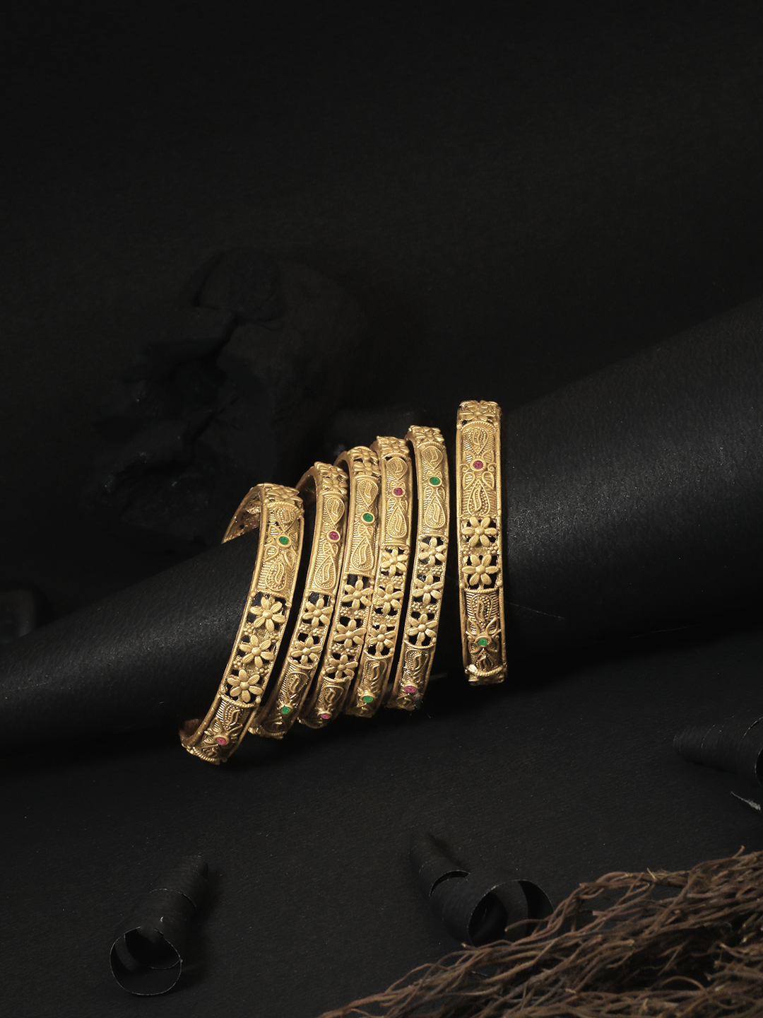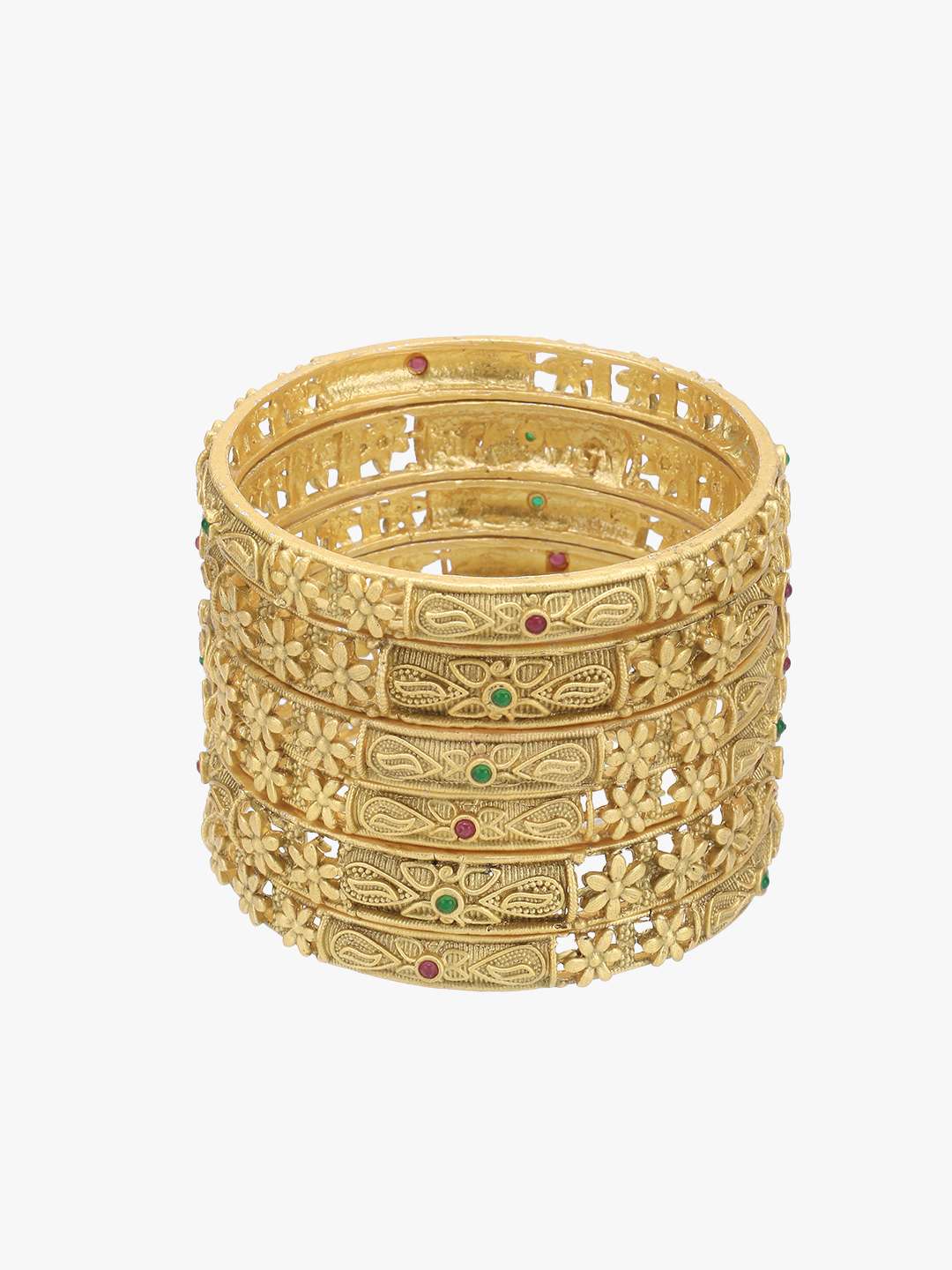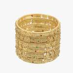 Set of Six 24CT gold-plated Red and GreenStone-studded handcrafted bangles, each has an intricate textured pattern,our gold plating is long lasting and non allergic to skin.