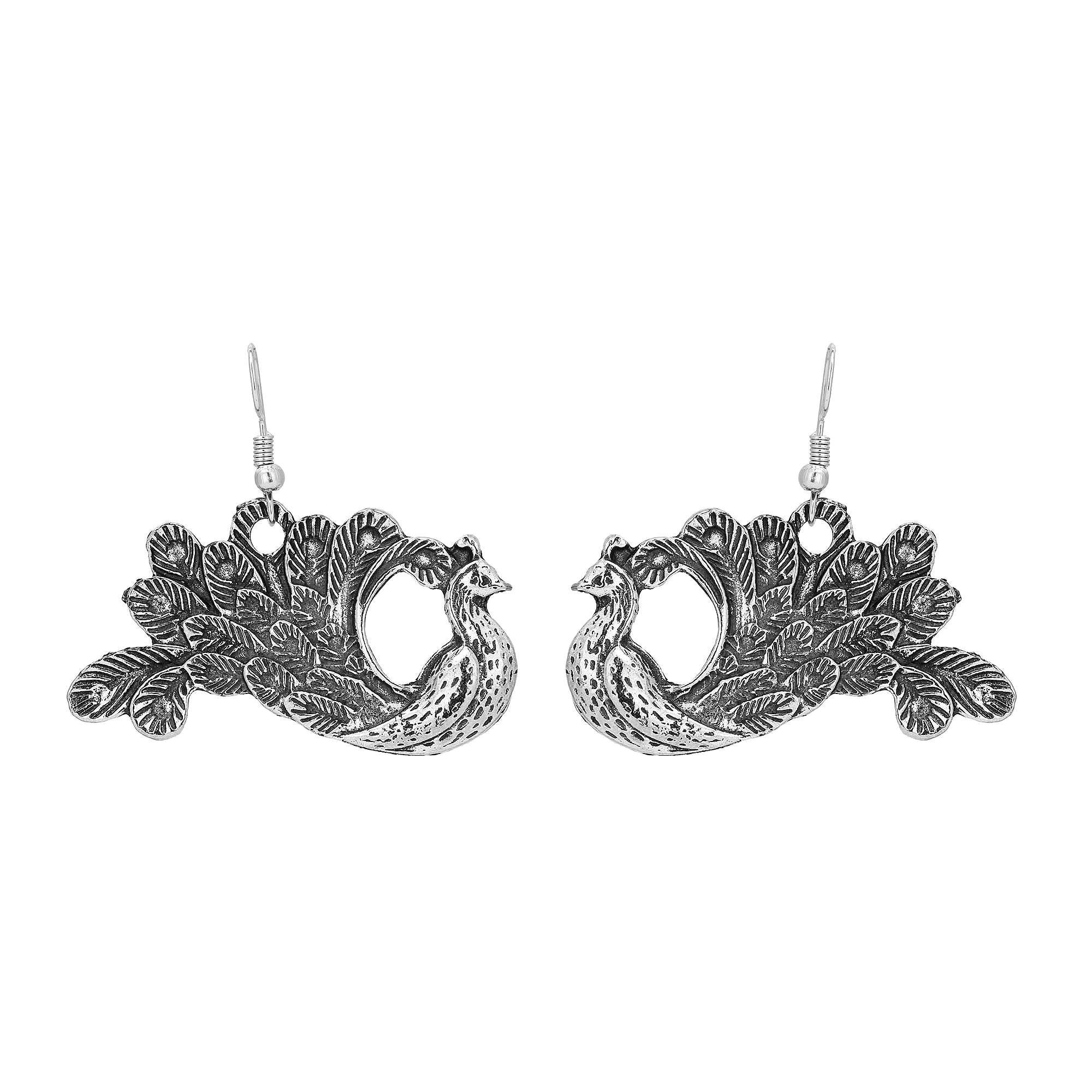 Women Silver Oxidised Dancing Peacock Drop Earring,our Silver plating is long lasting and non allergic to skin,and has artificial stones,Secured with a Fish Hook closure.
