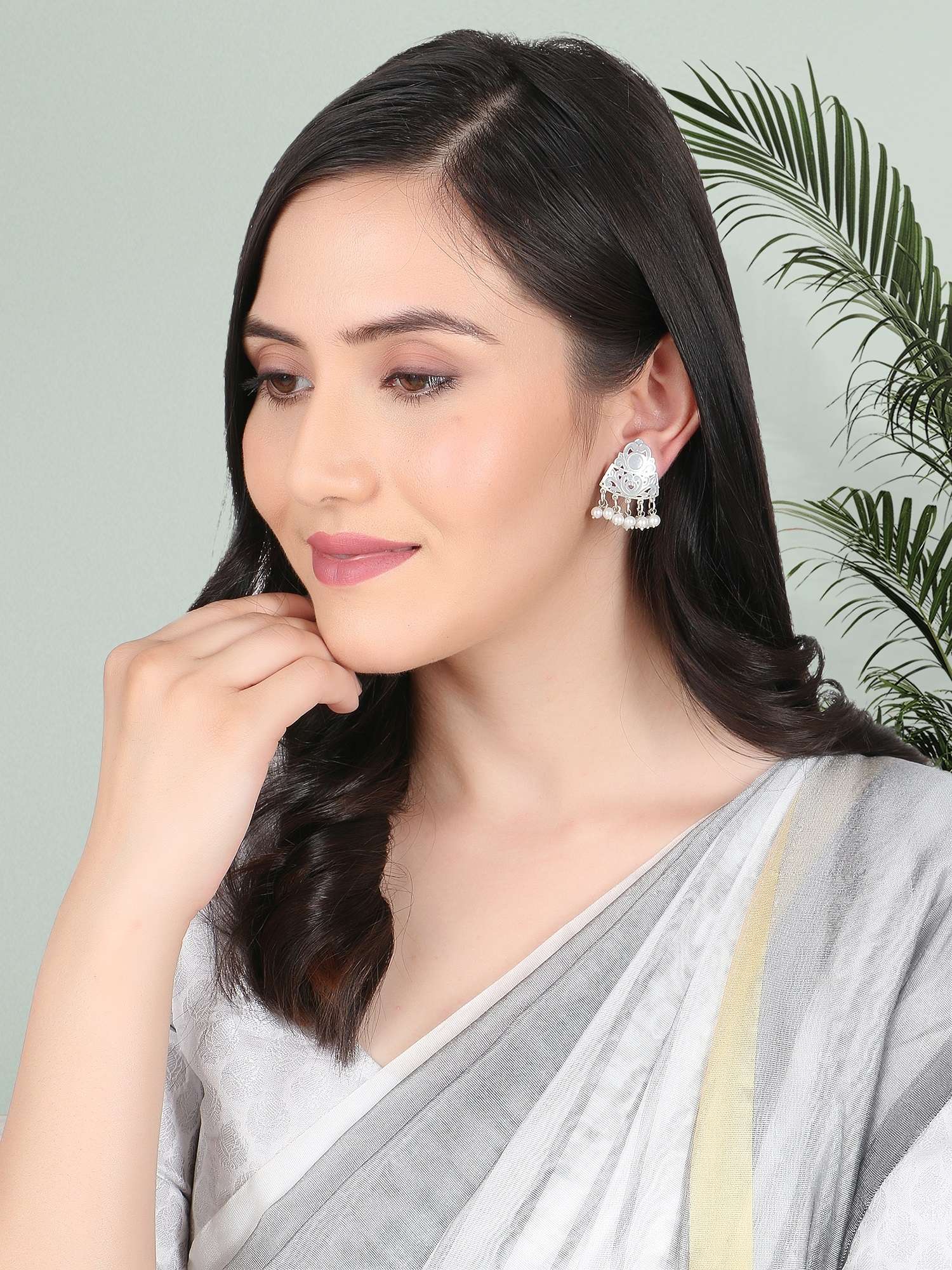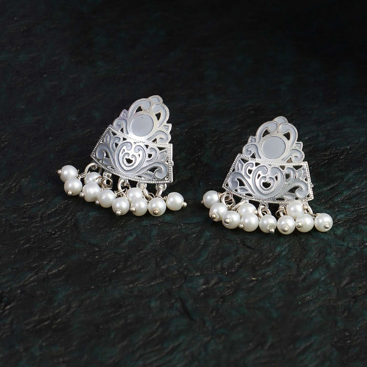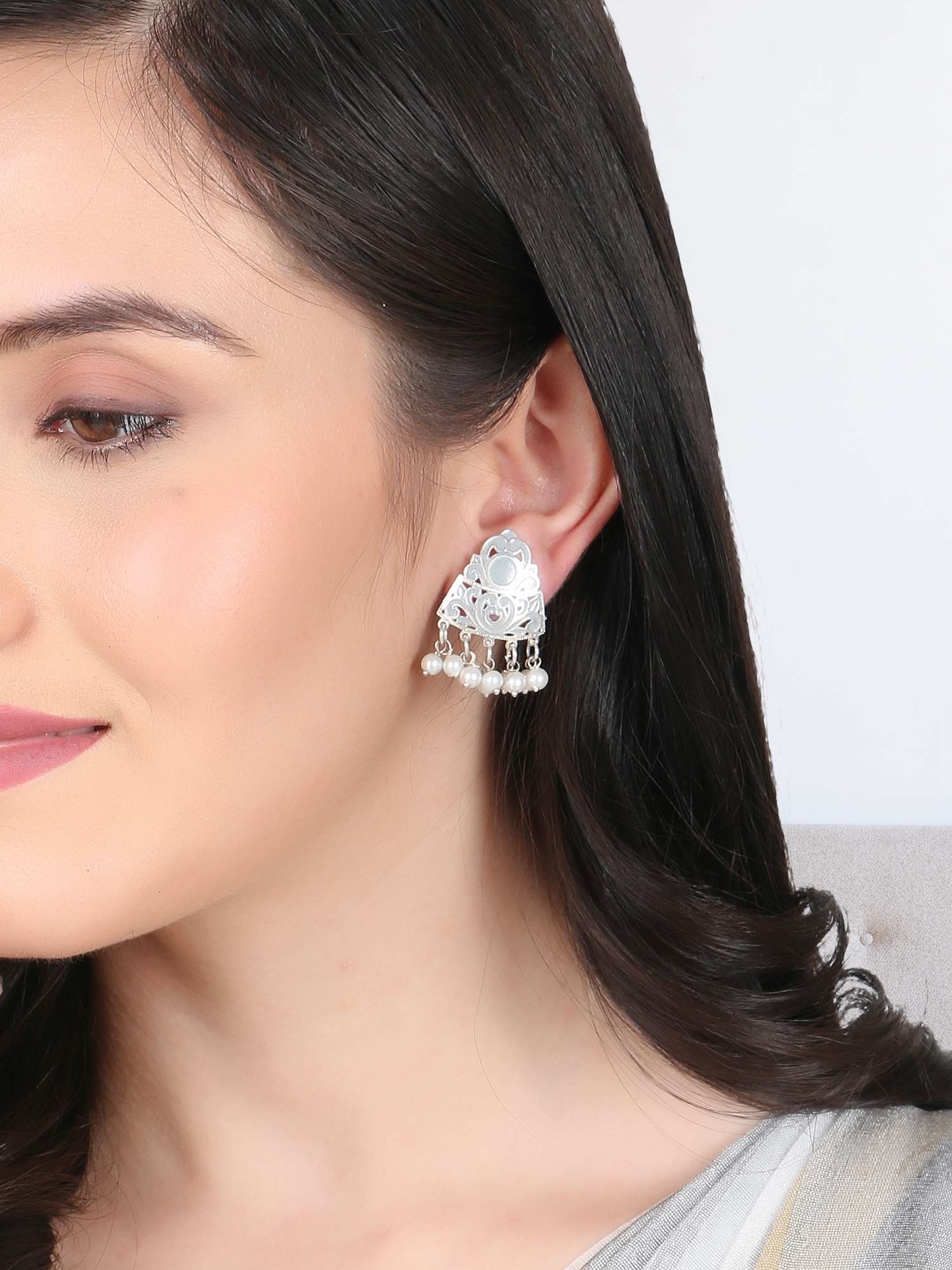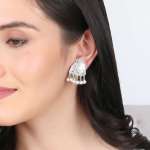 Silver-Plated Pearl-Beaded Handcrafted Earrings. Our Silver plating is long lasting and non allergic to skin,and has artificial stones,Secured with a fraction Back closure.