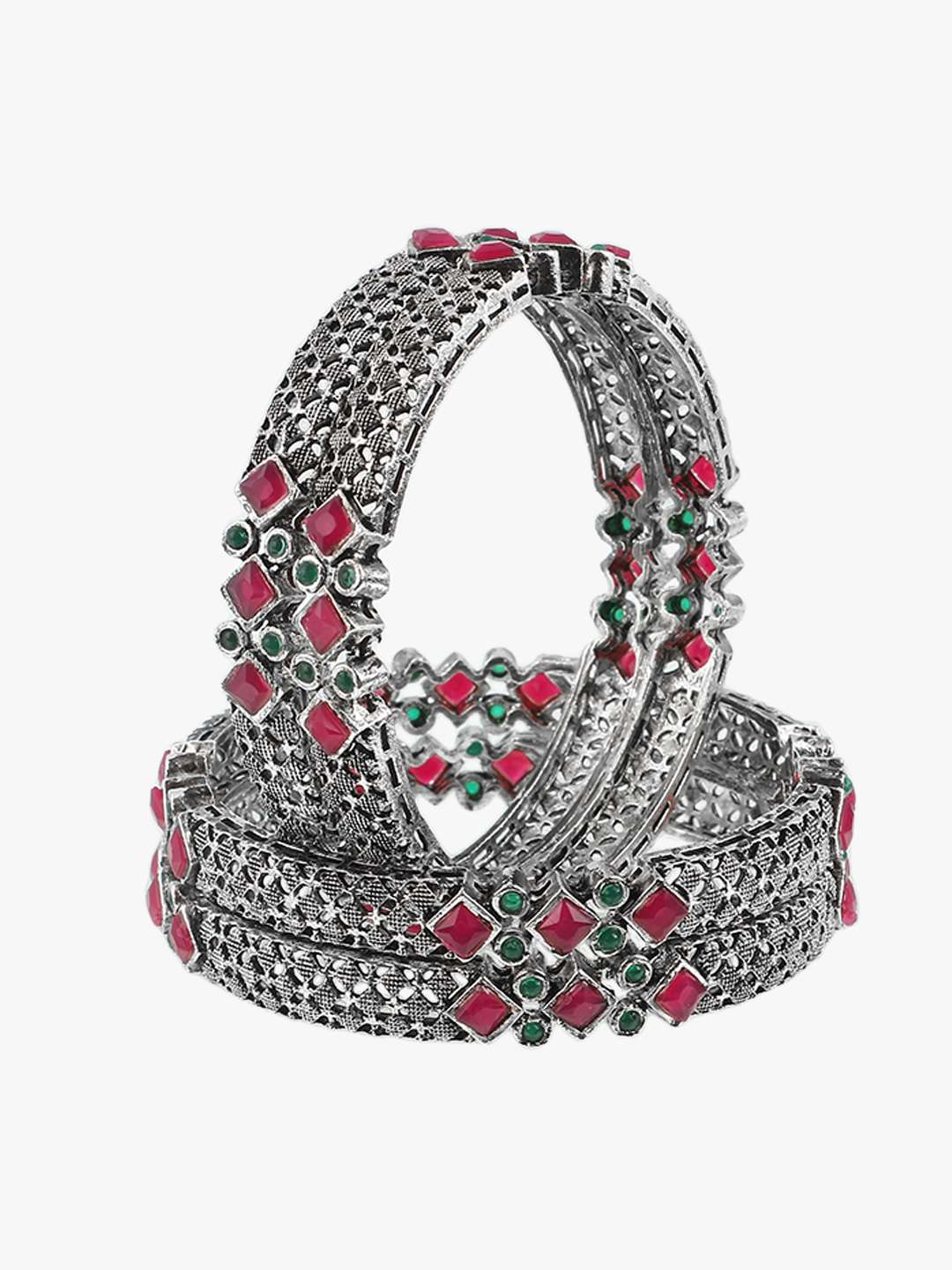 Women Set of 4 24CT Silver-plated Red and Green Stone -Studded handcrafted bangles, has detail each has intricately textured detailing,our Silver plating is long lasting and non allergic to skin.