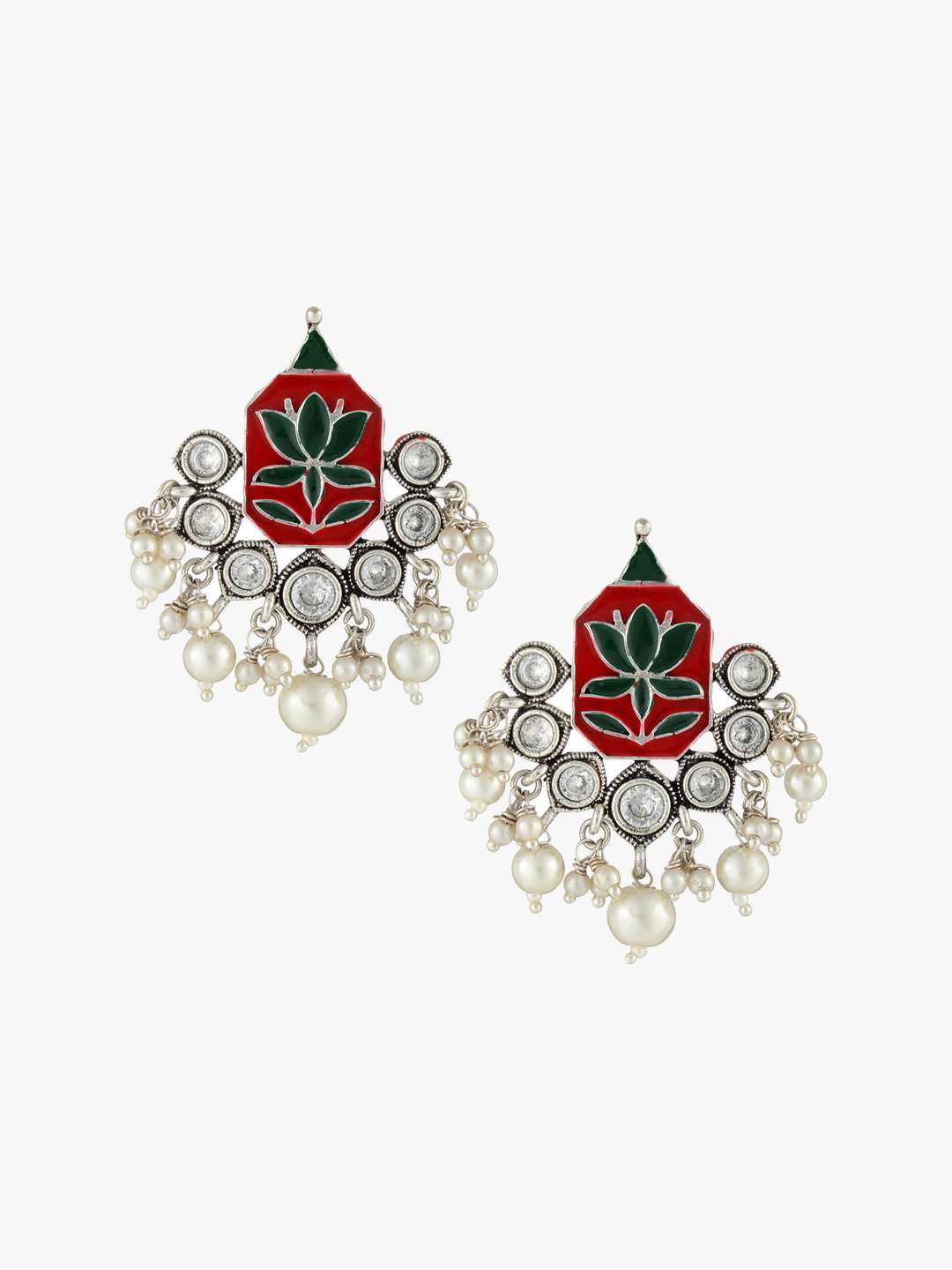 Women Silver-Plated Handcrafted Green and Red Floral Stone-Studded earing Silver-plated,our Silver plating is long lasting and non allergic to skin,and has artificial stones,Secured with a post and back closure.
