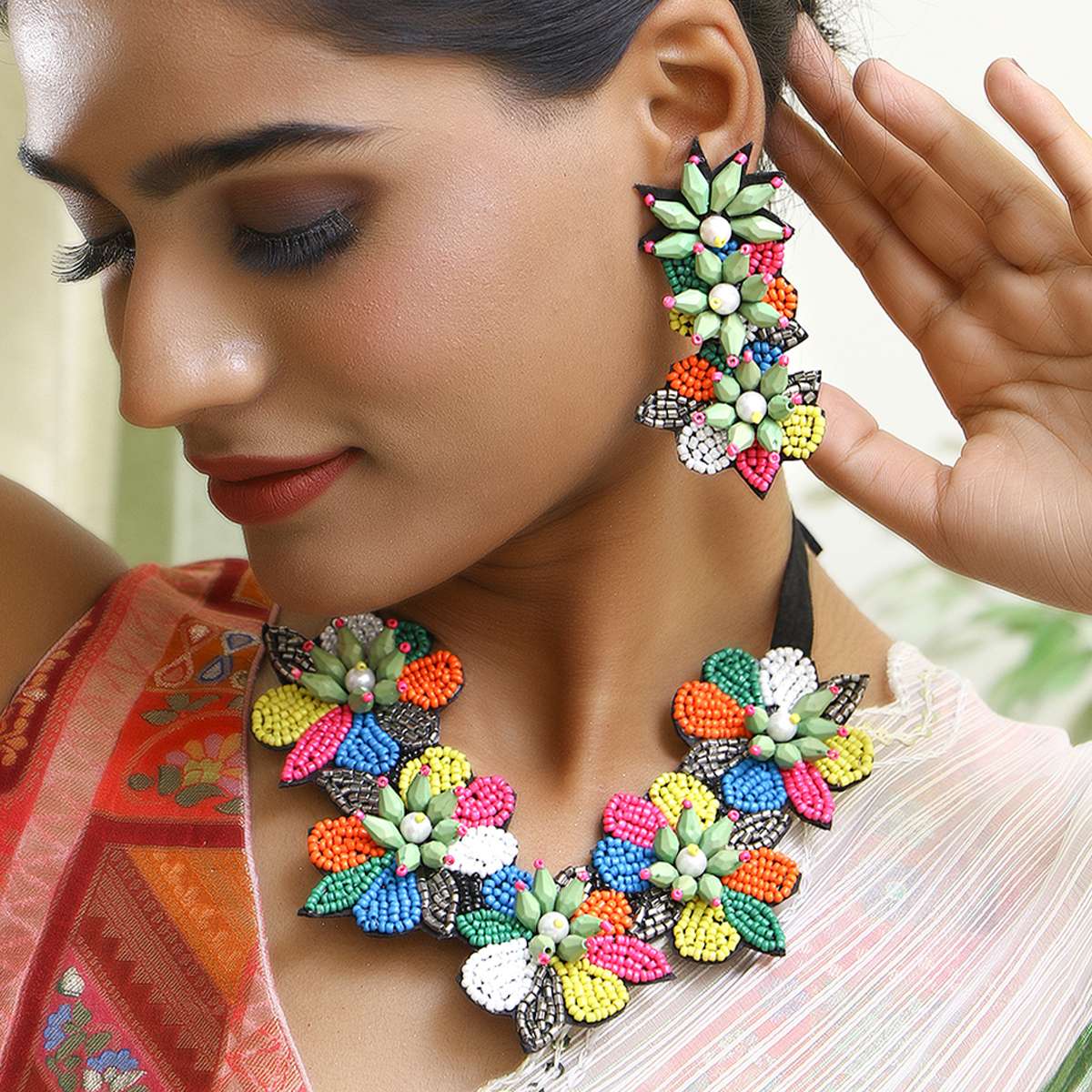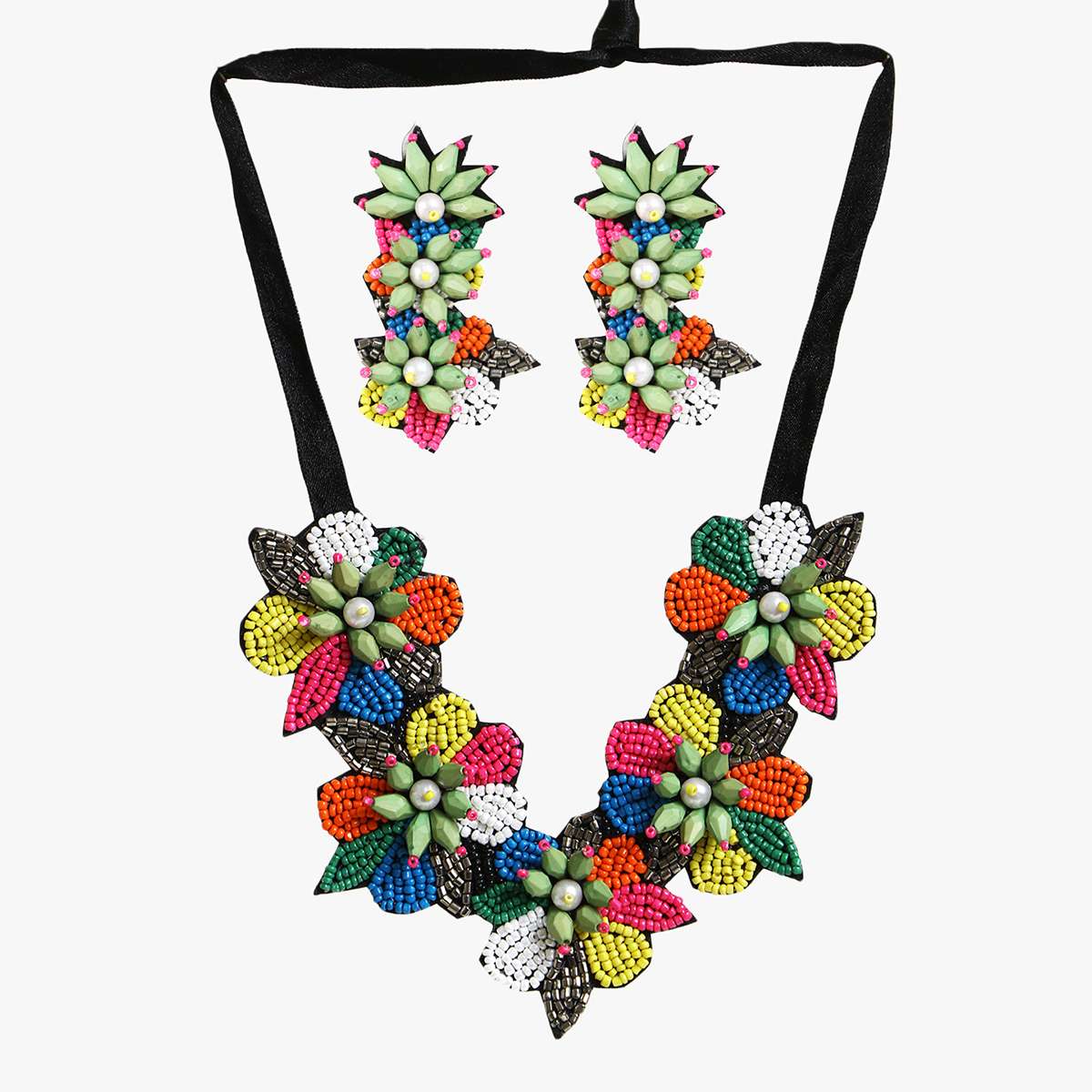 Woman Multi Beaded with Unique Design Handcrafted Jewellery Set,Material and stone type: alloy with artificial stones and beads,secured with a drawstring closure, A pair of matching earrings, secured with a post and back closure, This is long-lasting and non-allergic to skin