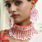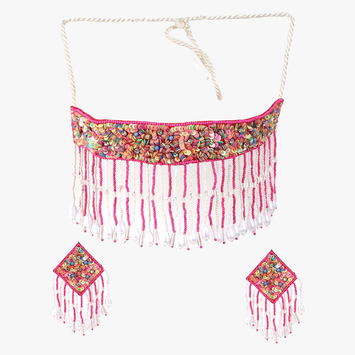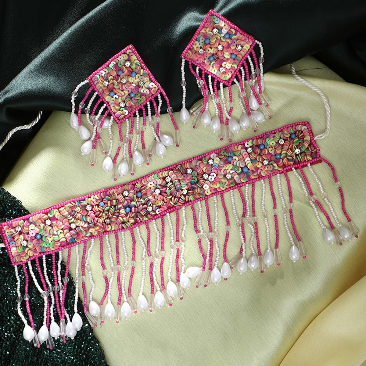 Woman Pink Beaded with Unique Design Handcrafted Jewellery Set,Material and stone type: alloy with artificial stones and beads,secured with a drawstring closure, A pair of matching earrings, secured with a post and back closure, This is long-lasting and non-allergic to skin