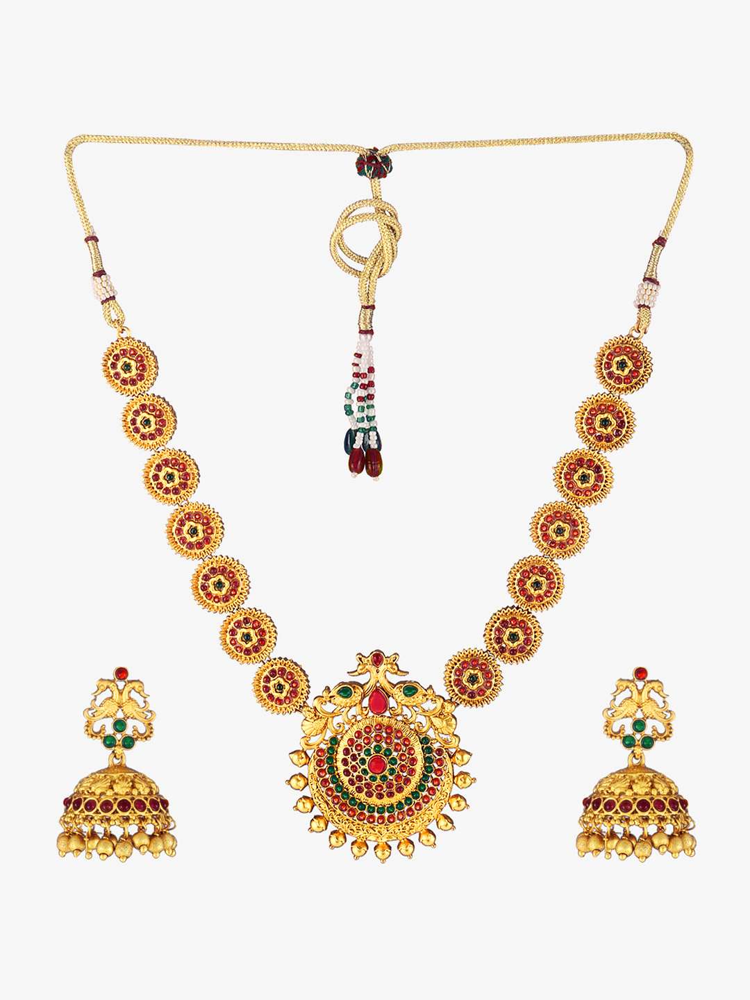 This jewellery set consists of a necklace and a pair of earrings Gold-plated and stranded necklace with Drawstring closure, A pair of matching earrings, secured with a post and back closure, Gold plating is long-lasting and non-allergic to skin.