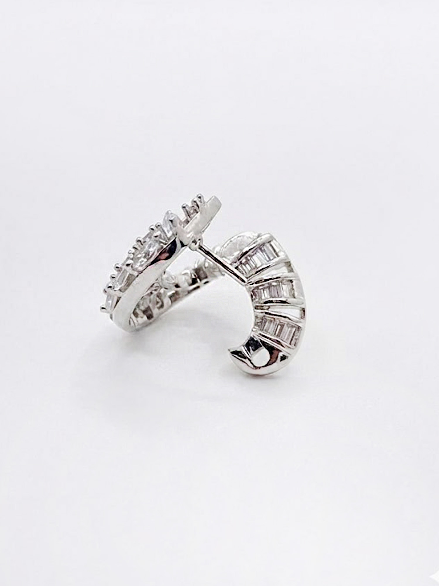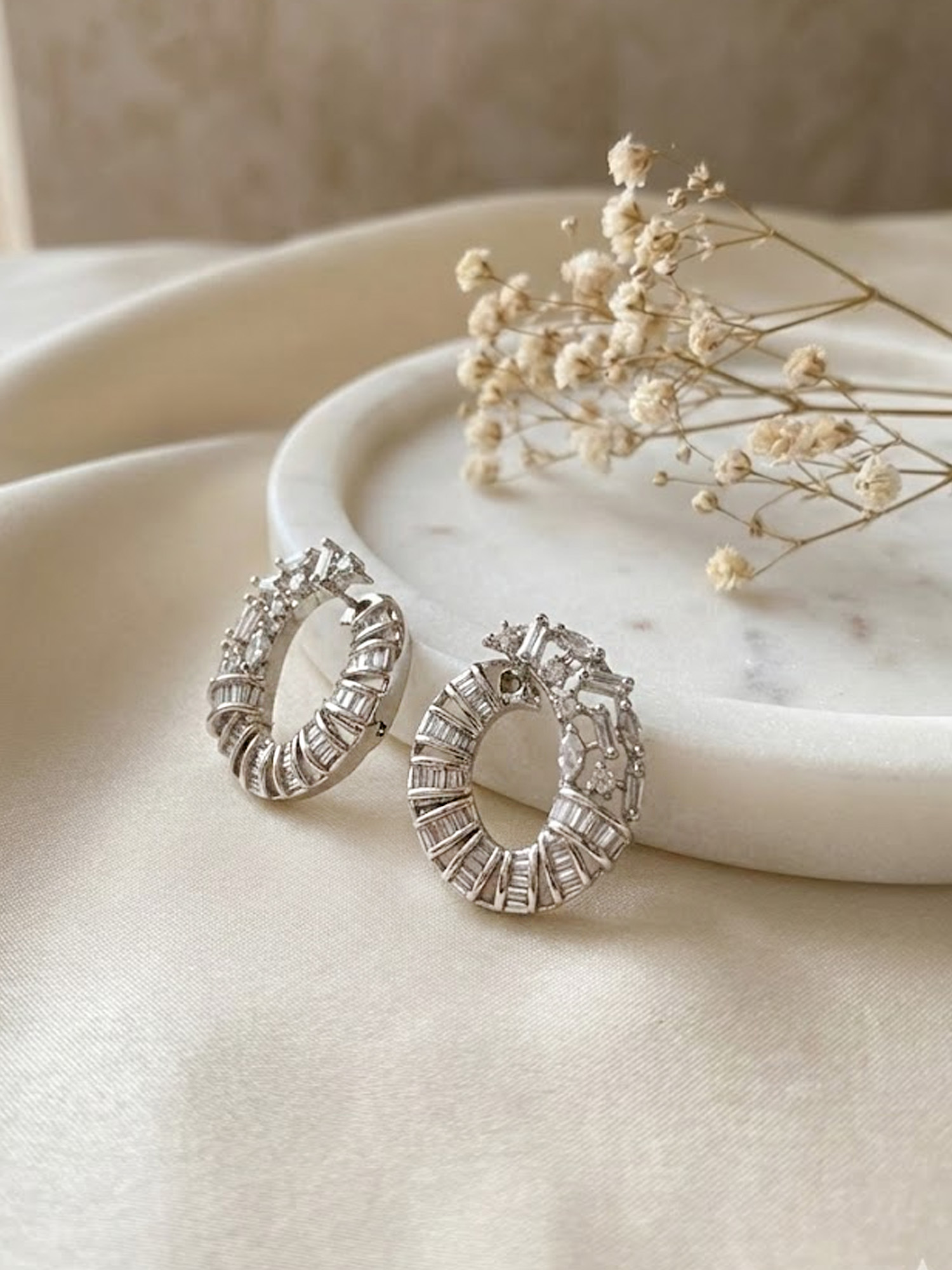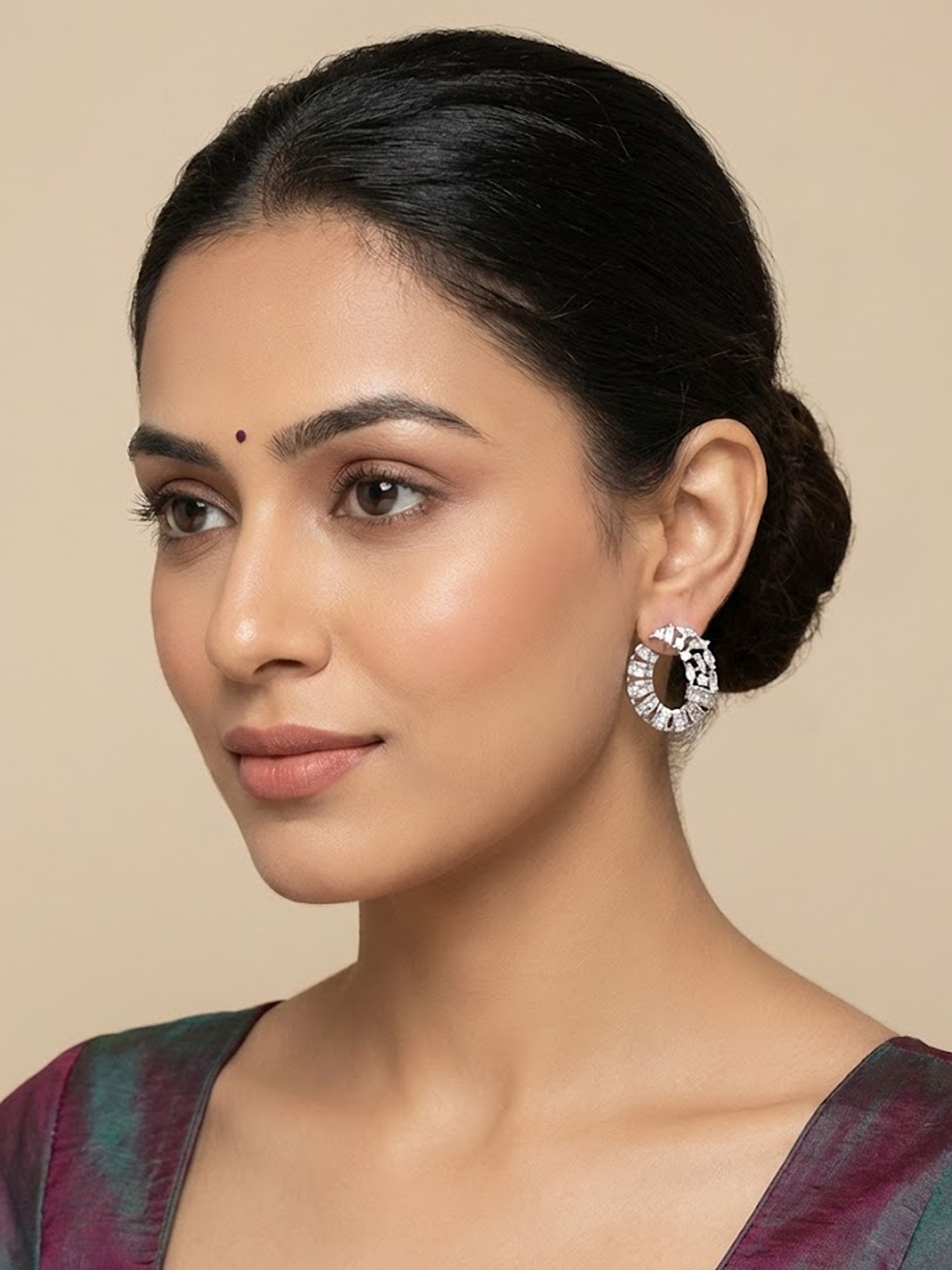 Classic Tri-Row Hoop Earrings featuring sparkling diamonds in mixed cuts. The three-row design creates a dazzling effect, catching the light from every angle for an elegant, luxurious look. Perfect for weddings, parties, festive occasions, or evening events, these earrings complement both traditional and contemporary outfits. Lightweight and comfortable, they add sophistication and sparkle to any ensemble.