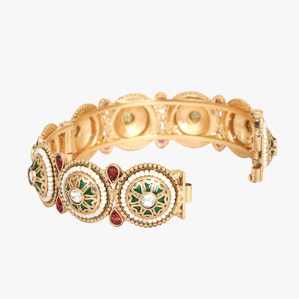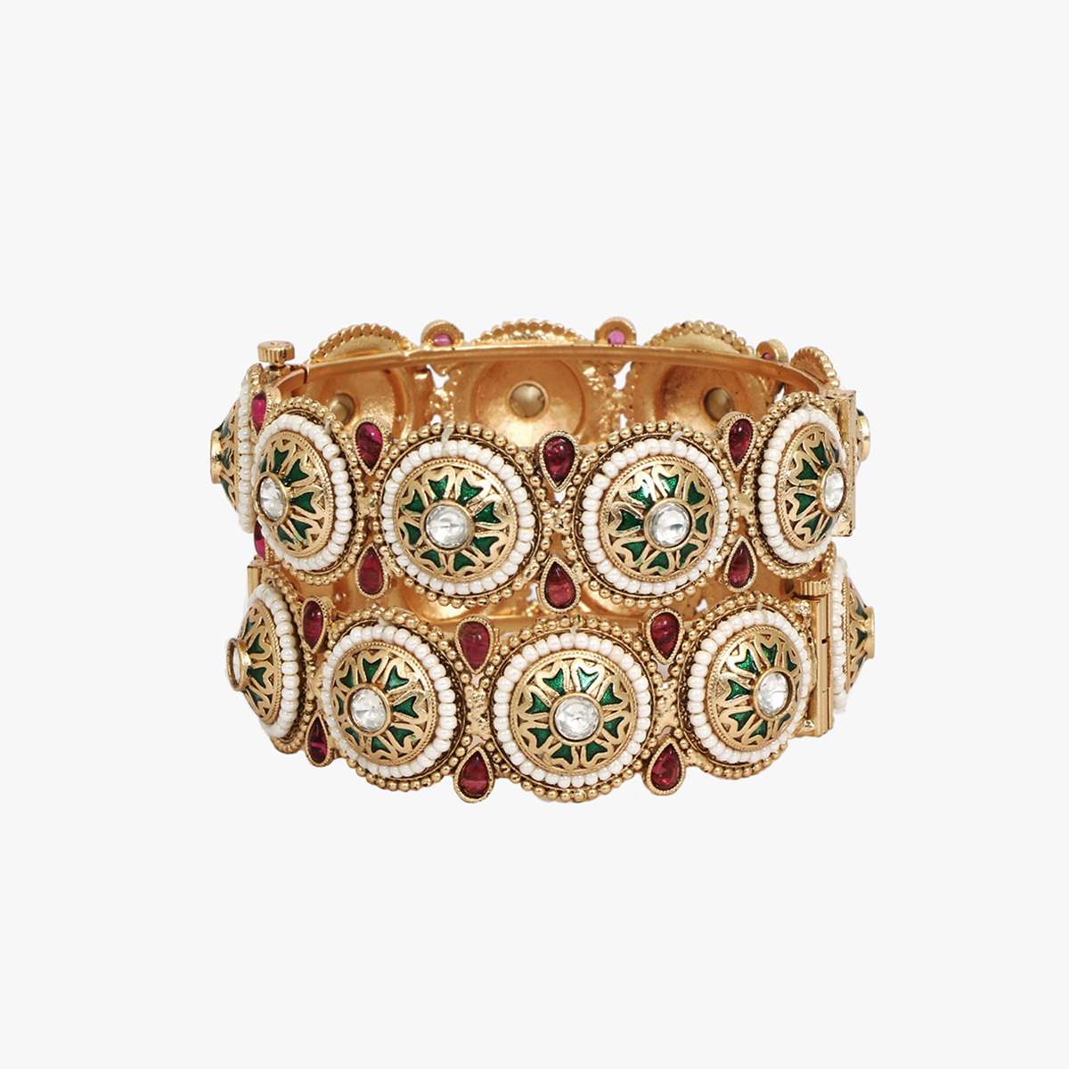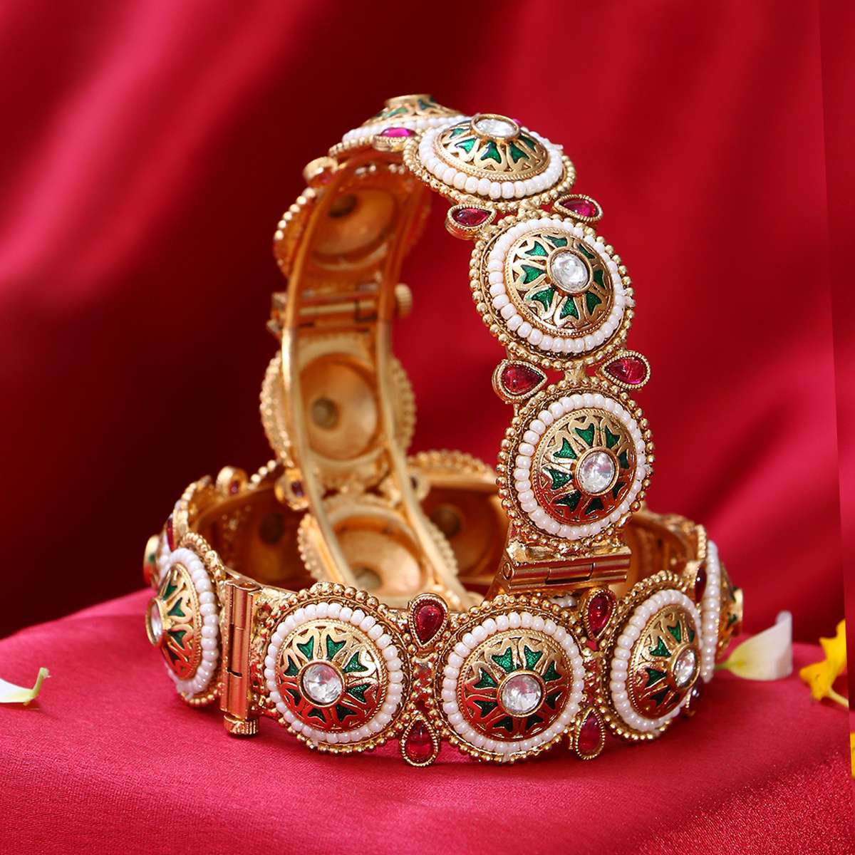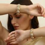 Women Gold Plated Kundan and Red Stone Studded White Pearl Beaded Designer Bangles. Our Gold Plating is long lasting and non-allergic to skin