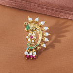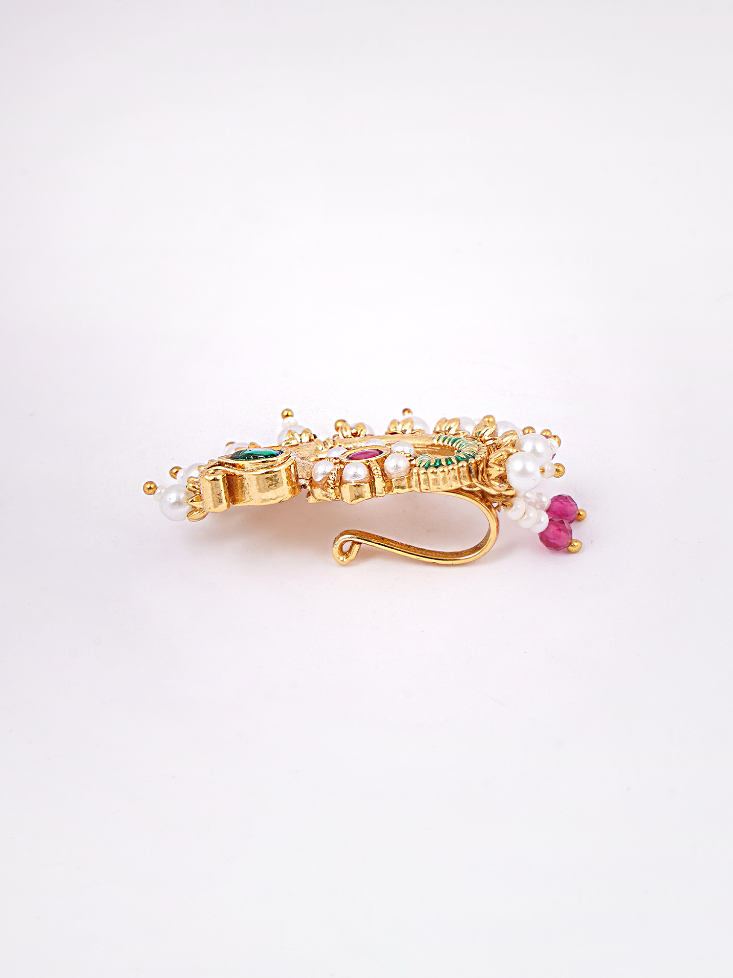 Our exclusive collection of finest quality crafted Fashion Jewellery in various colors. 24CT Gold-Plated Marathi Pink and Green Stone Studded with White Pearl Beaded, with non-piercing closure. our Gold-plating is long lasting and non allergic to skin.This Nose Ring Can Look Elegant And Stylish When Worn With Anarkali, Lehengas, And Sarees.This piece is crafted using high quality raw material.
