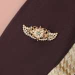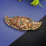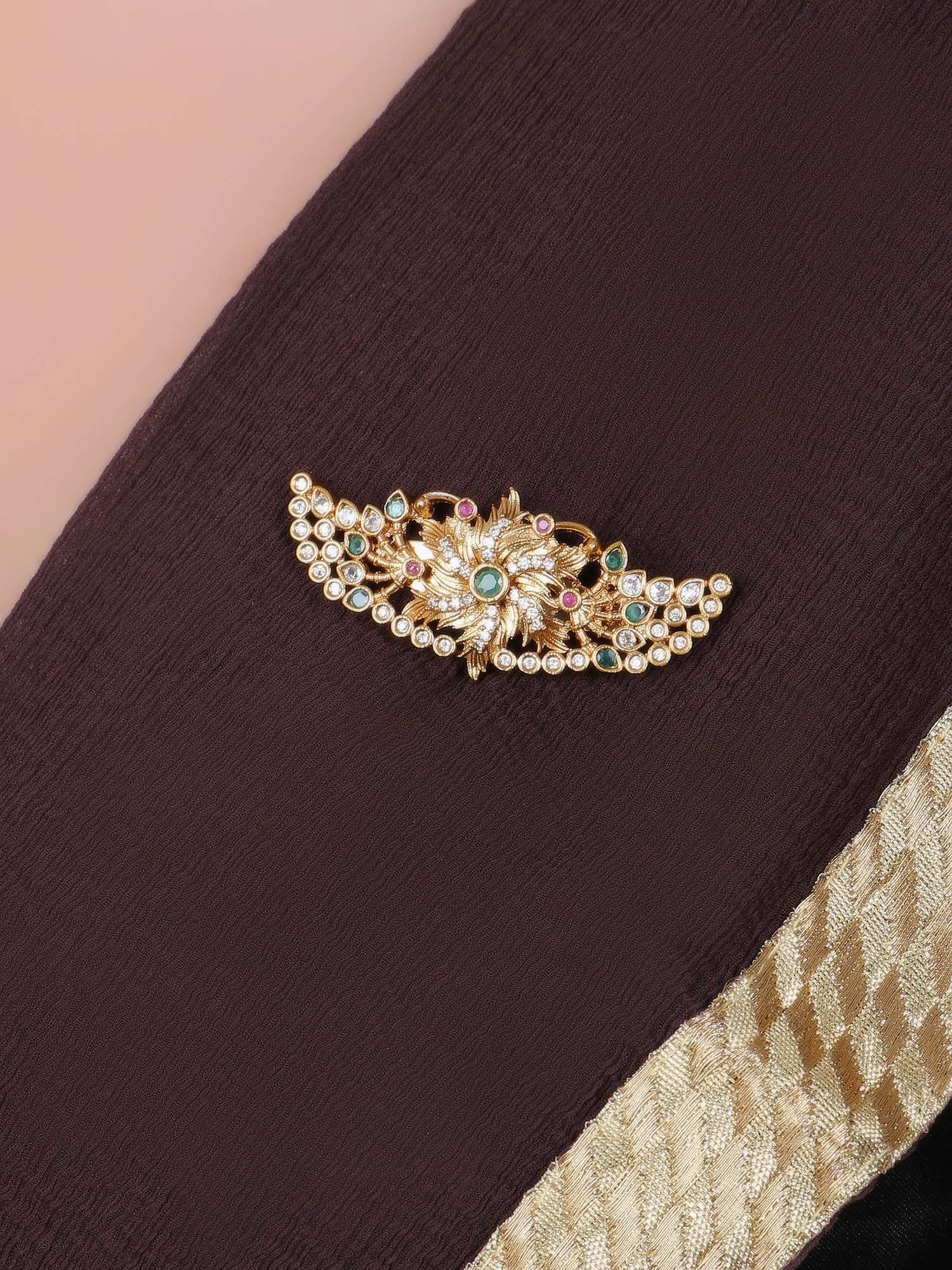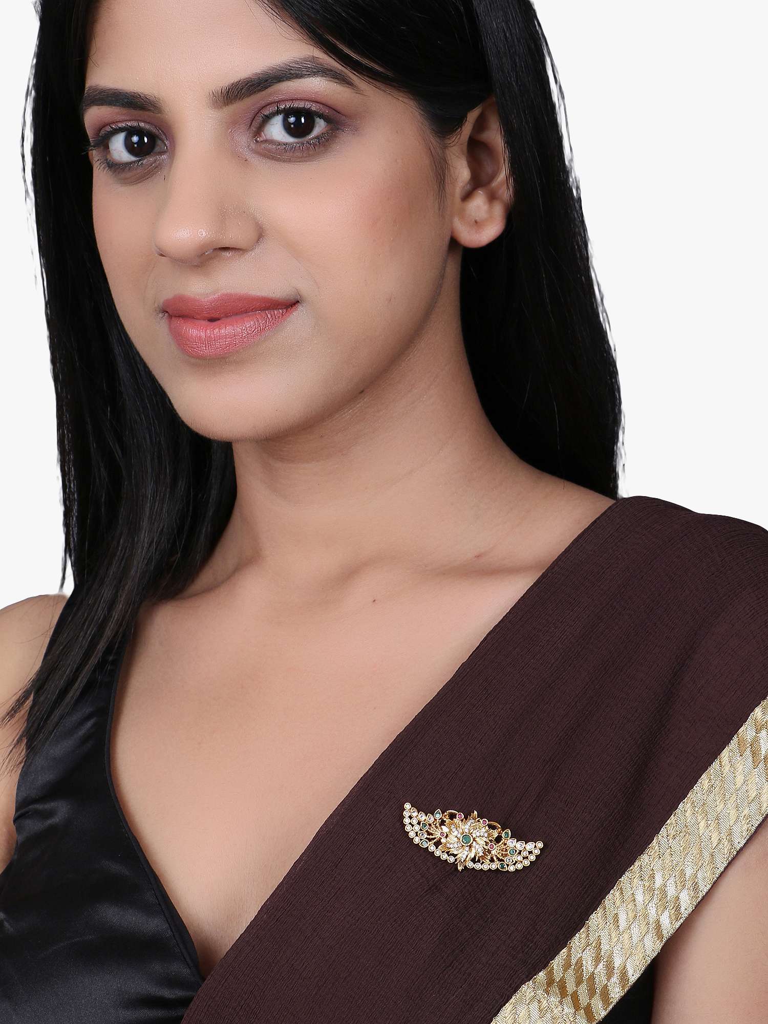 Women Gold Plated White Green and Red Stone Studded all around Flower Design Brooch. This Brooch is of Gold-plated with Pin Closure. Our Gold plating is long lasting and non allergic to skin.