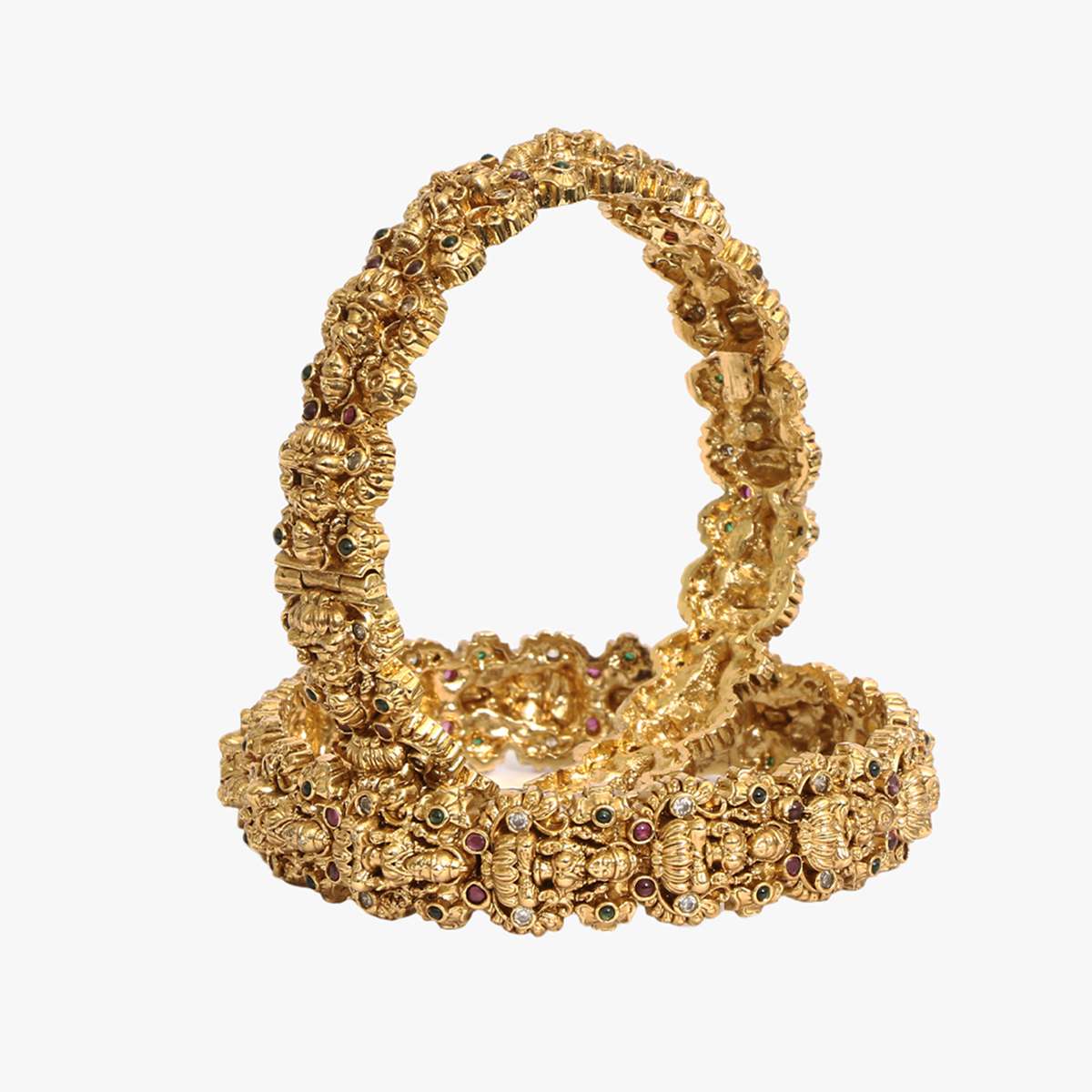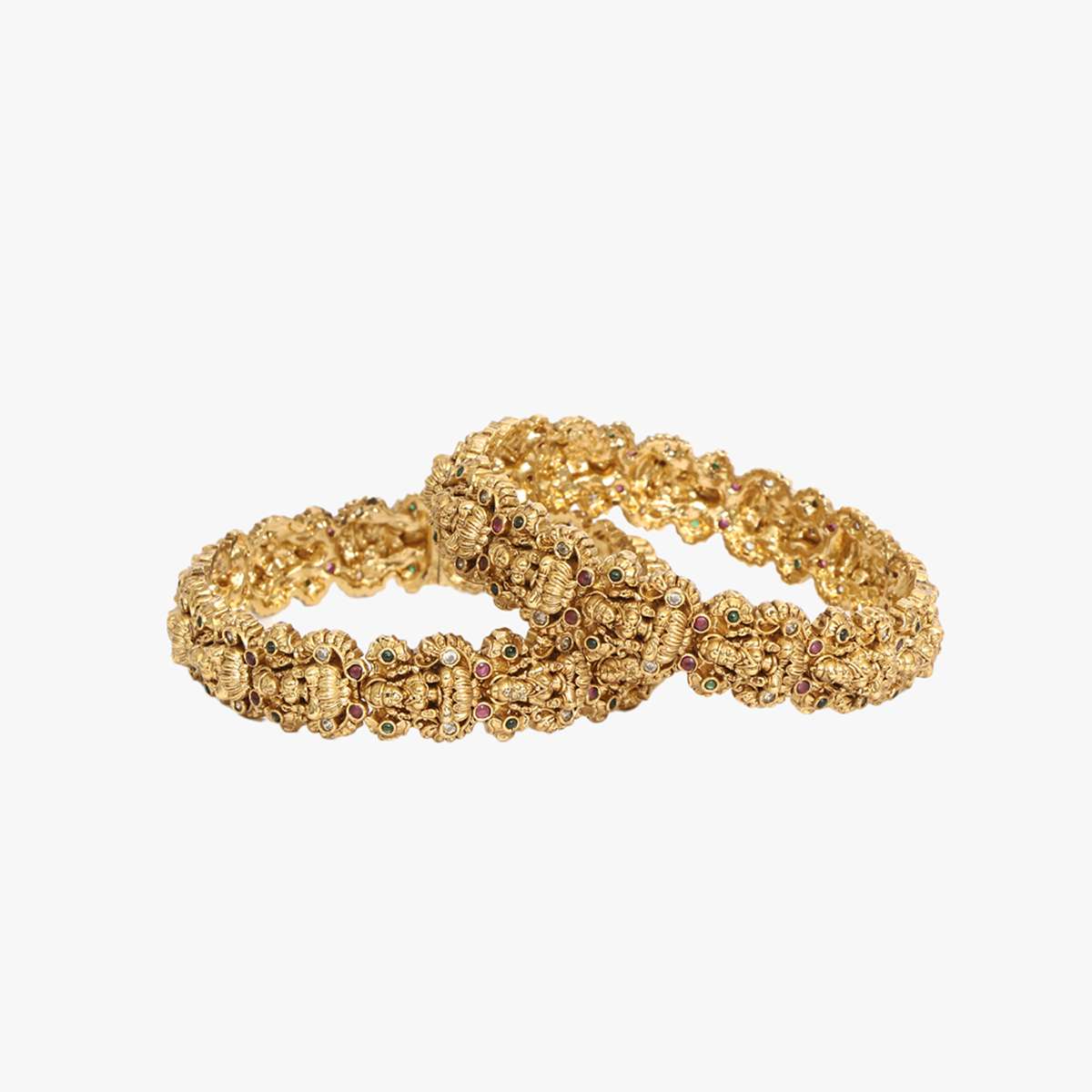 Women Gold Plated Red and Green Stone Studded Kundan Godess Laxmi Temple Traditional Designer Bangles. Our Gold Plating is long lasting and non-allergic to skin