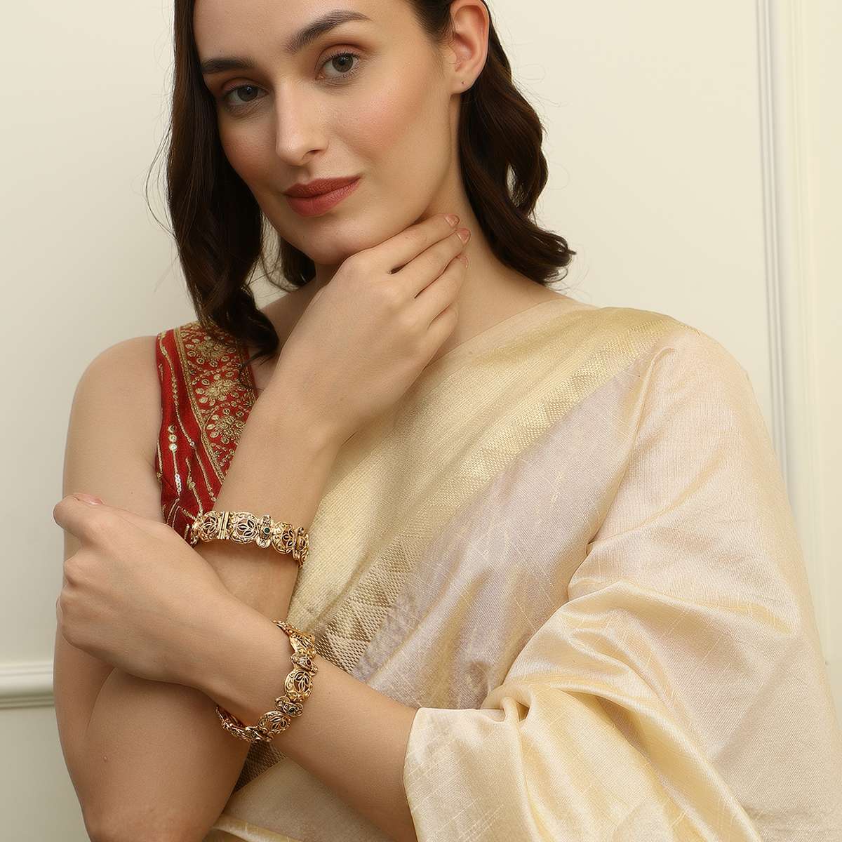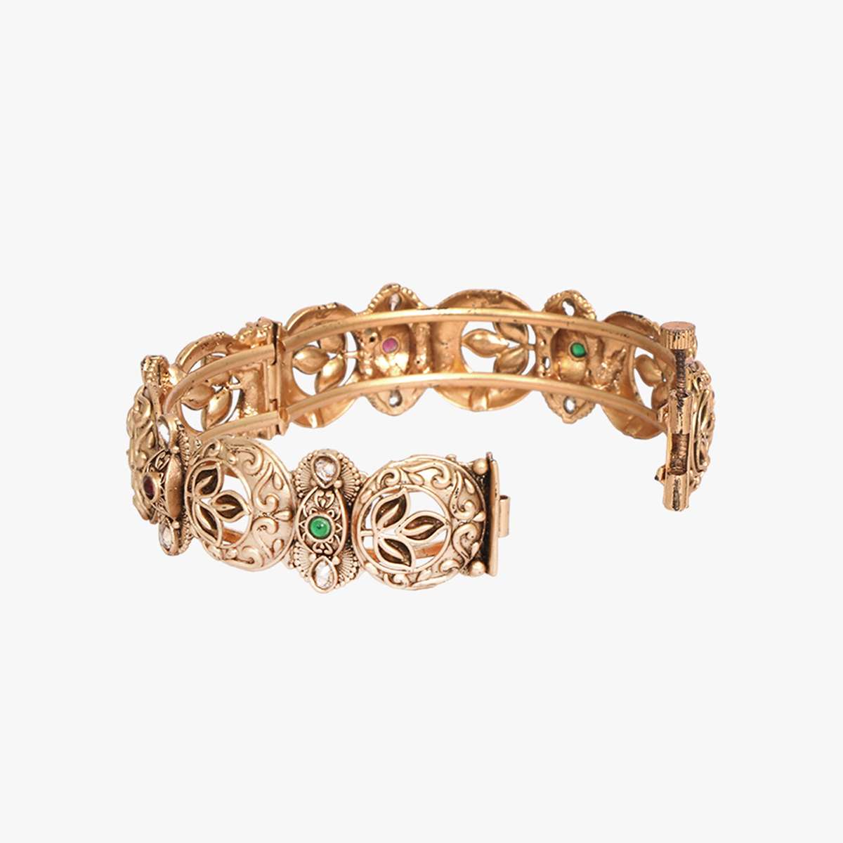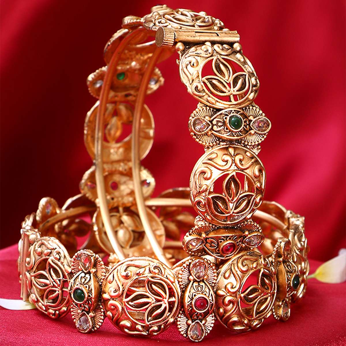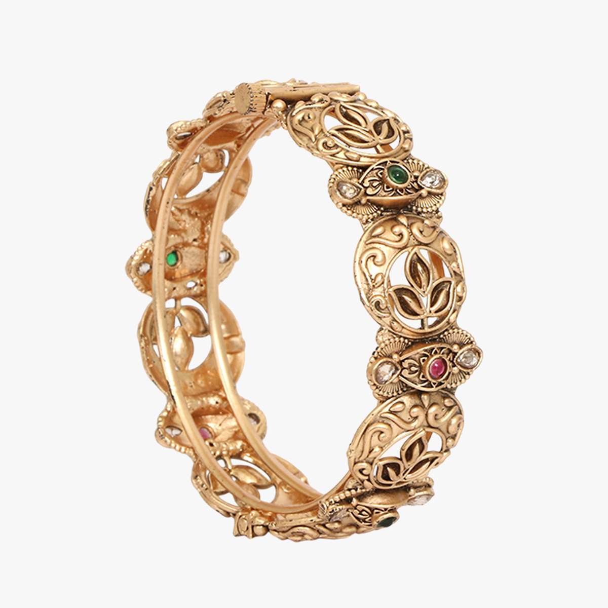 Women Gold Plated Red and Green Stone and Kundan Studded Brown Leaf Design Beautiful Handcrafted Designer Bangles. Our Gold Plating is long lasting and non-allergic to skin