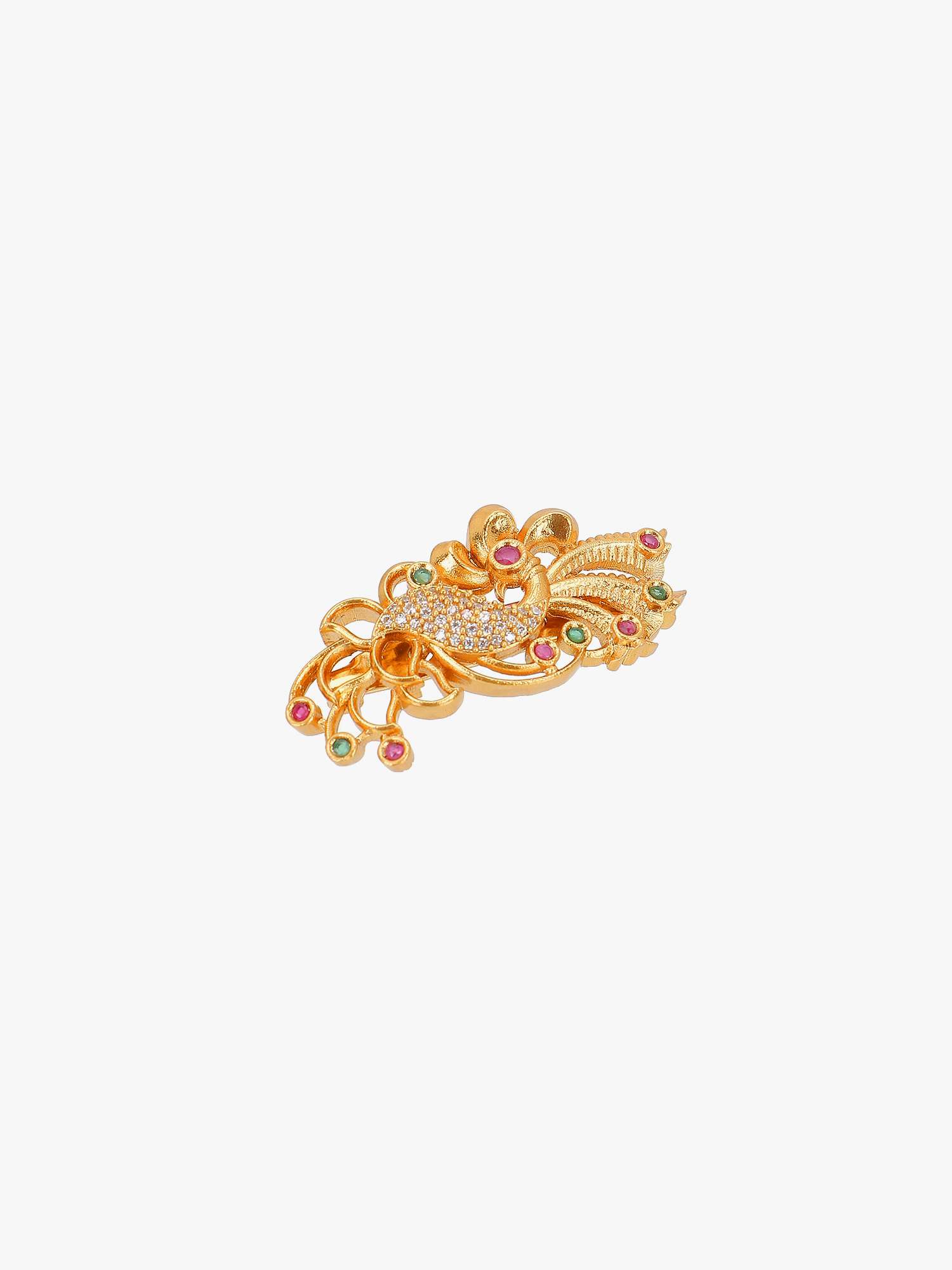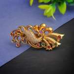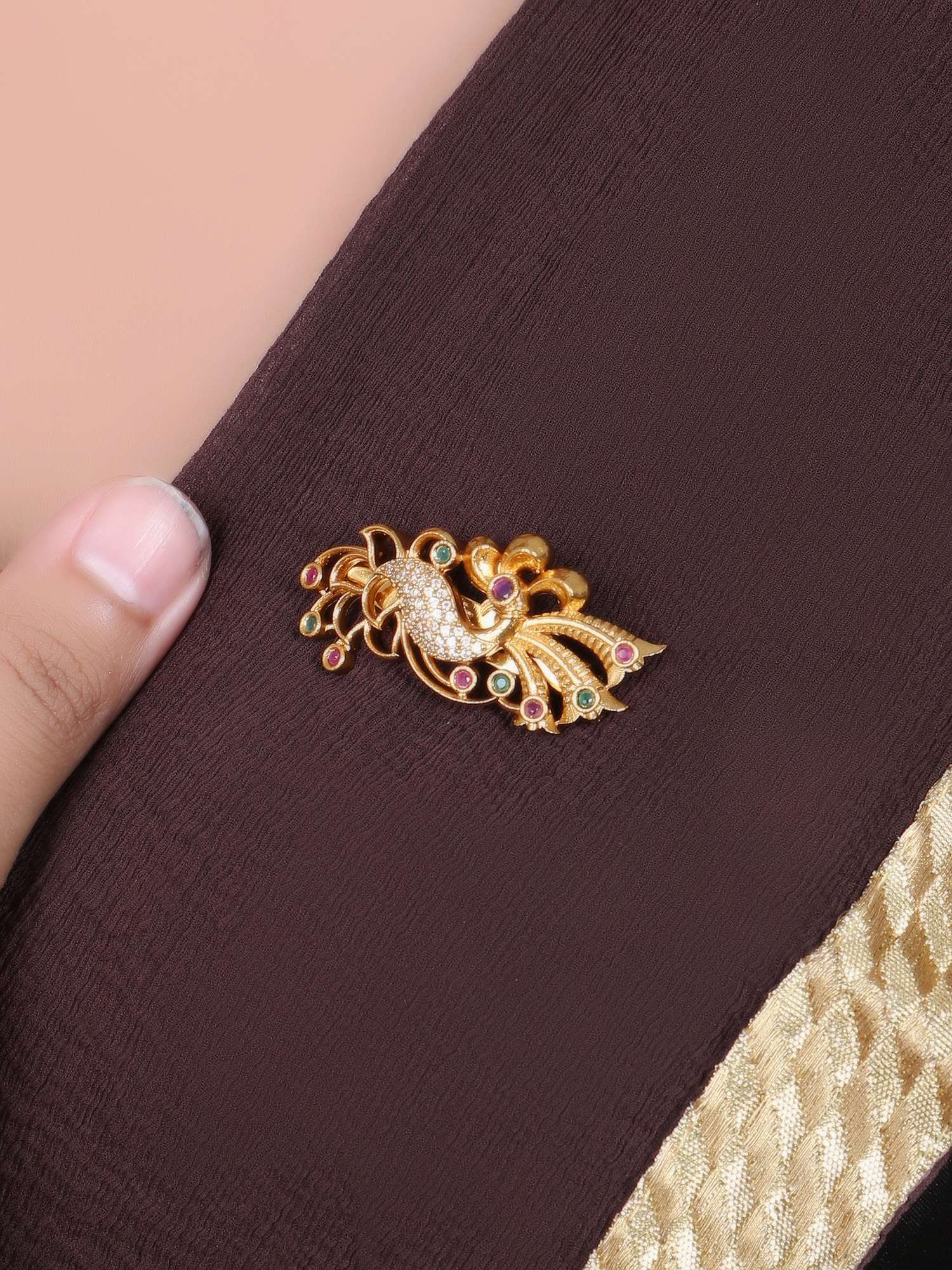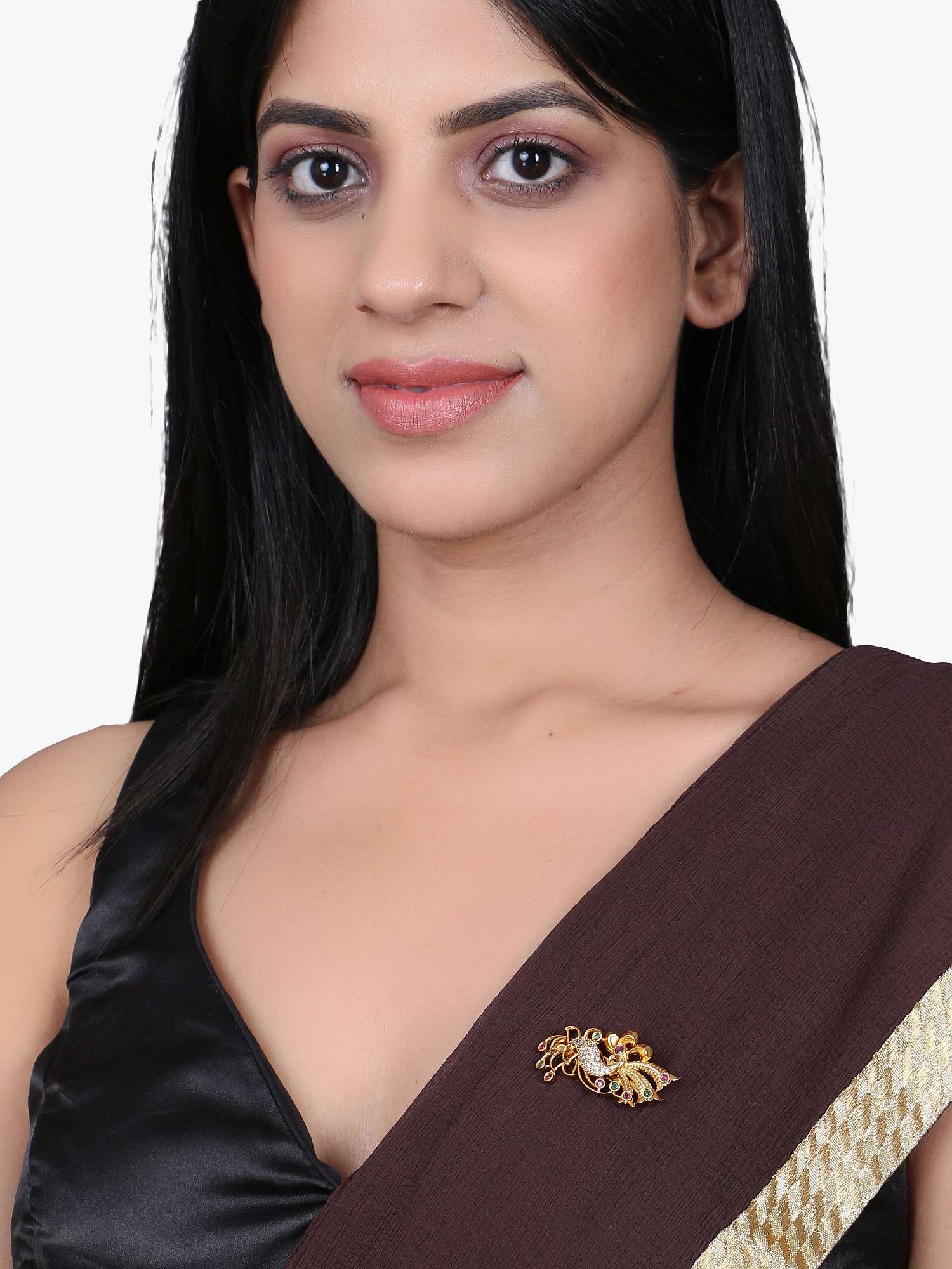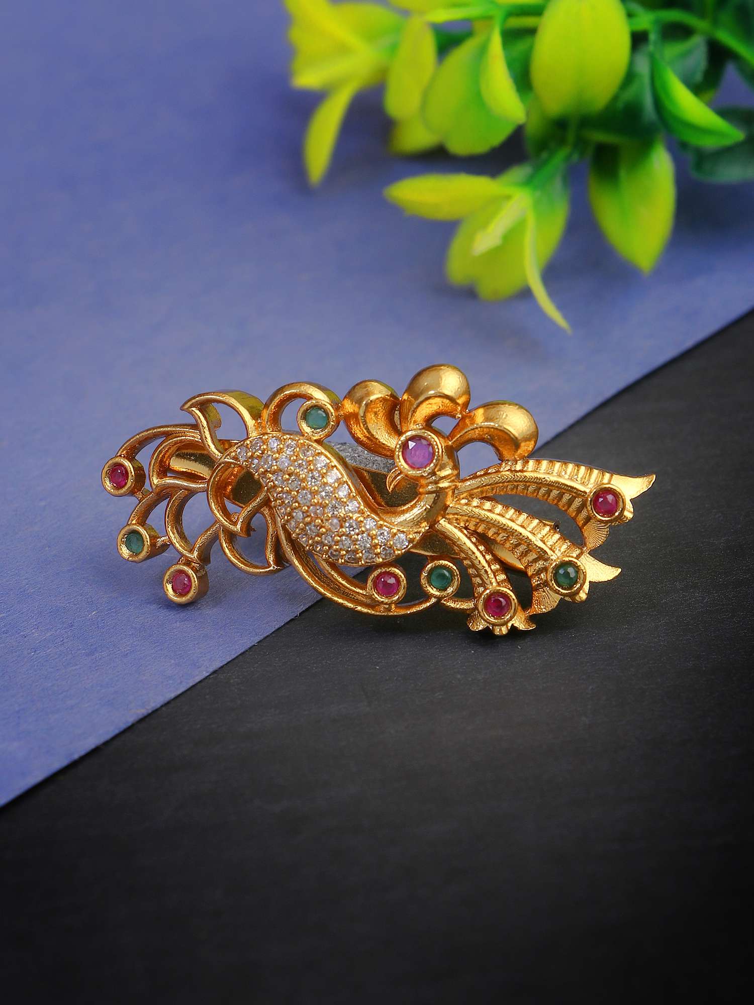 Women Gold Plated White Green and Red Stone Studded all around Peacock Design Brooch. This Brooch is of Gold-plated with Pin Closure. Our Gold plating is long lasting and non allergic to skin.