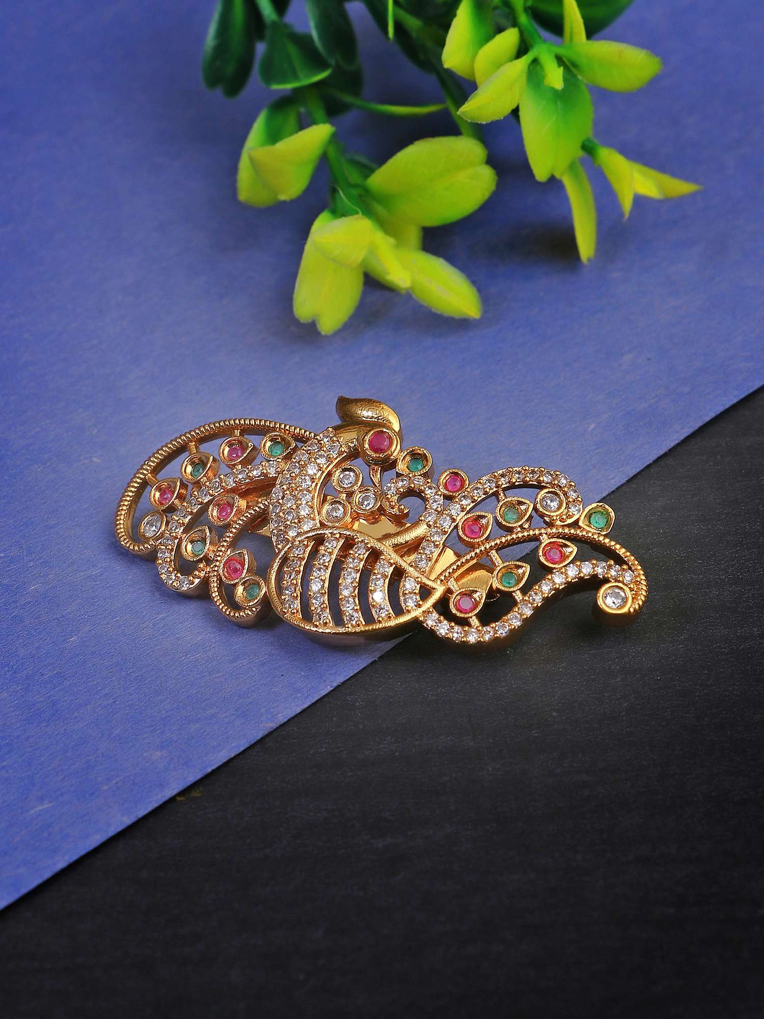 Women Gold Plated White Green and Red Stone Studded all around Peacock Design Brooch. This Brooch is of Gold-plated with Pin Closure. Our Gold plating is long lasting and non allergic to skin.