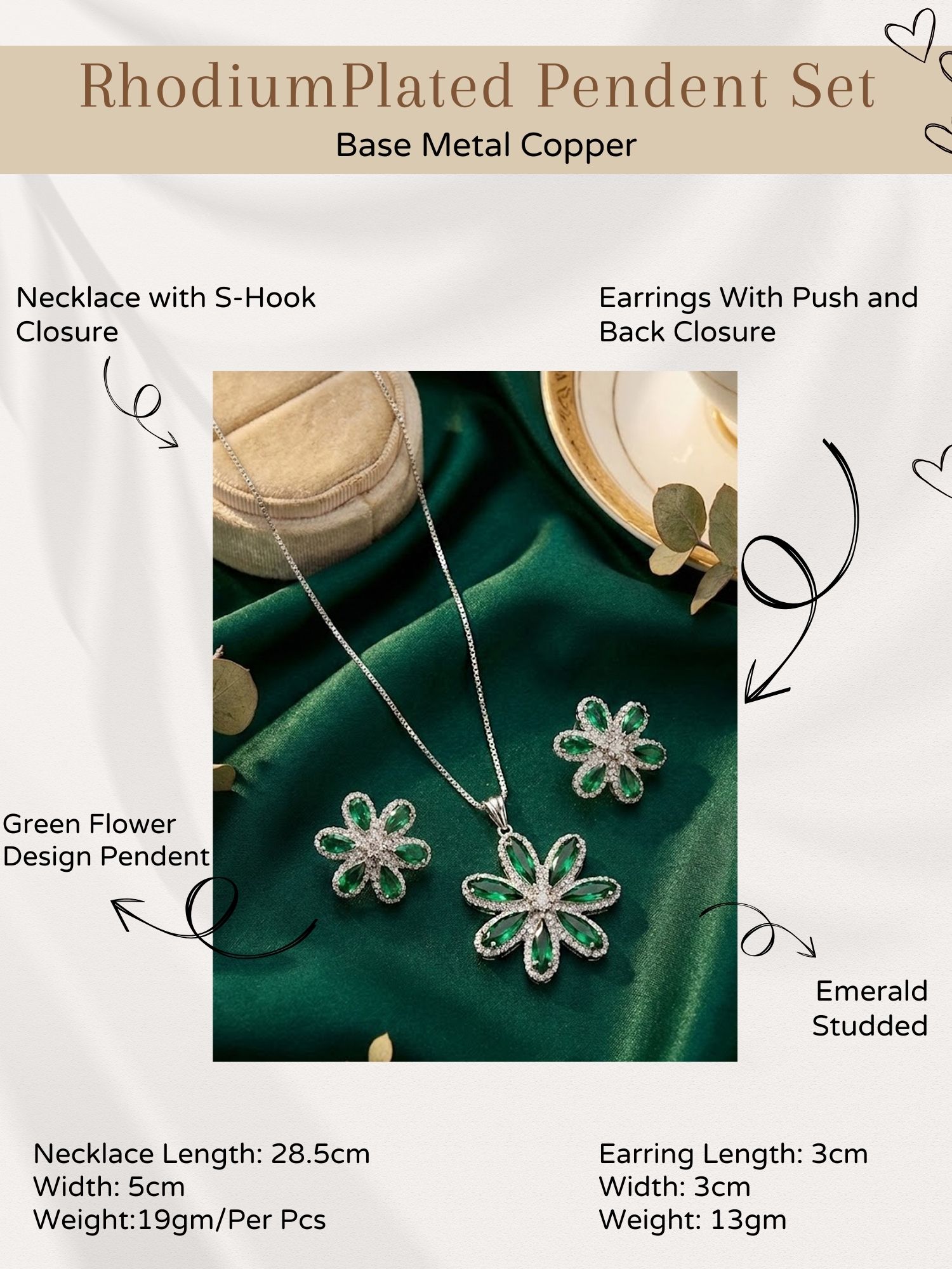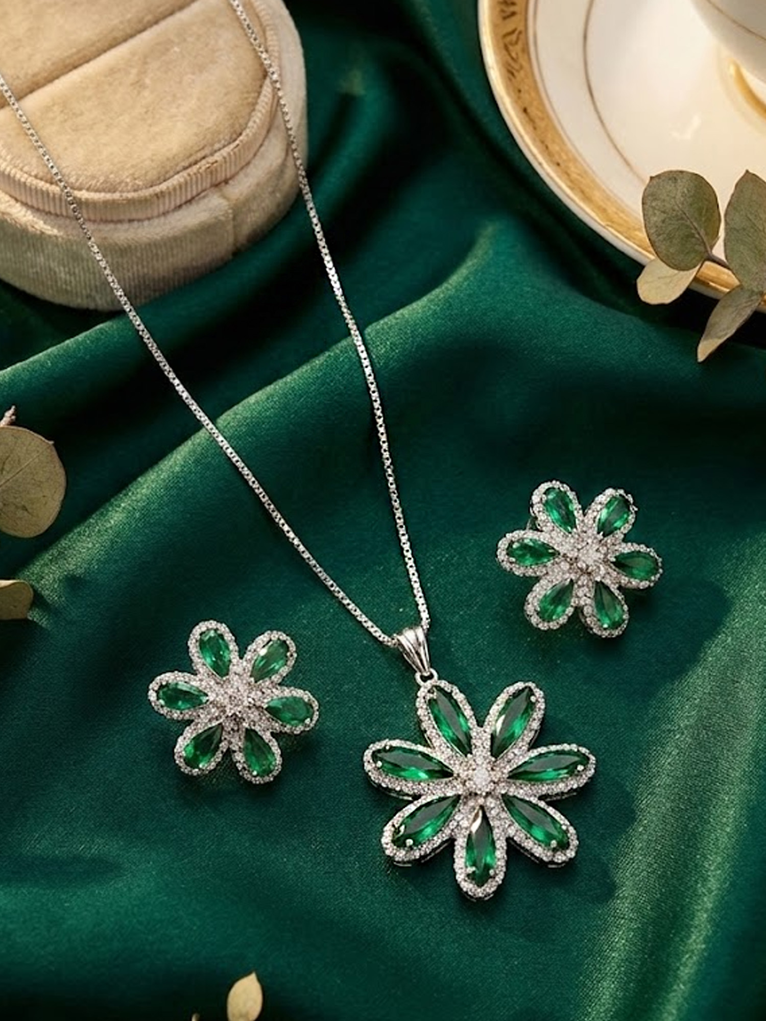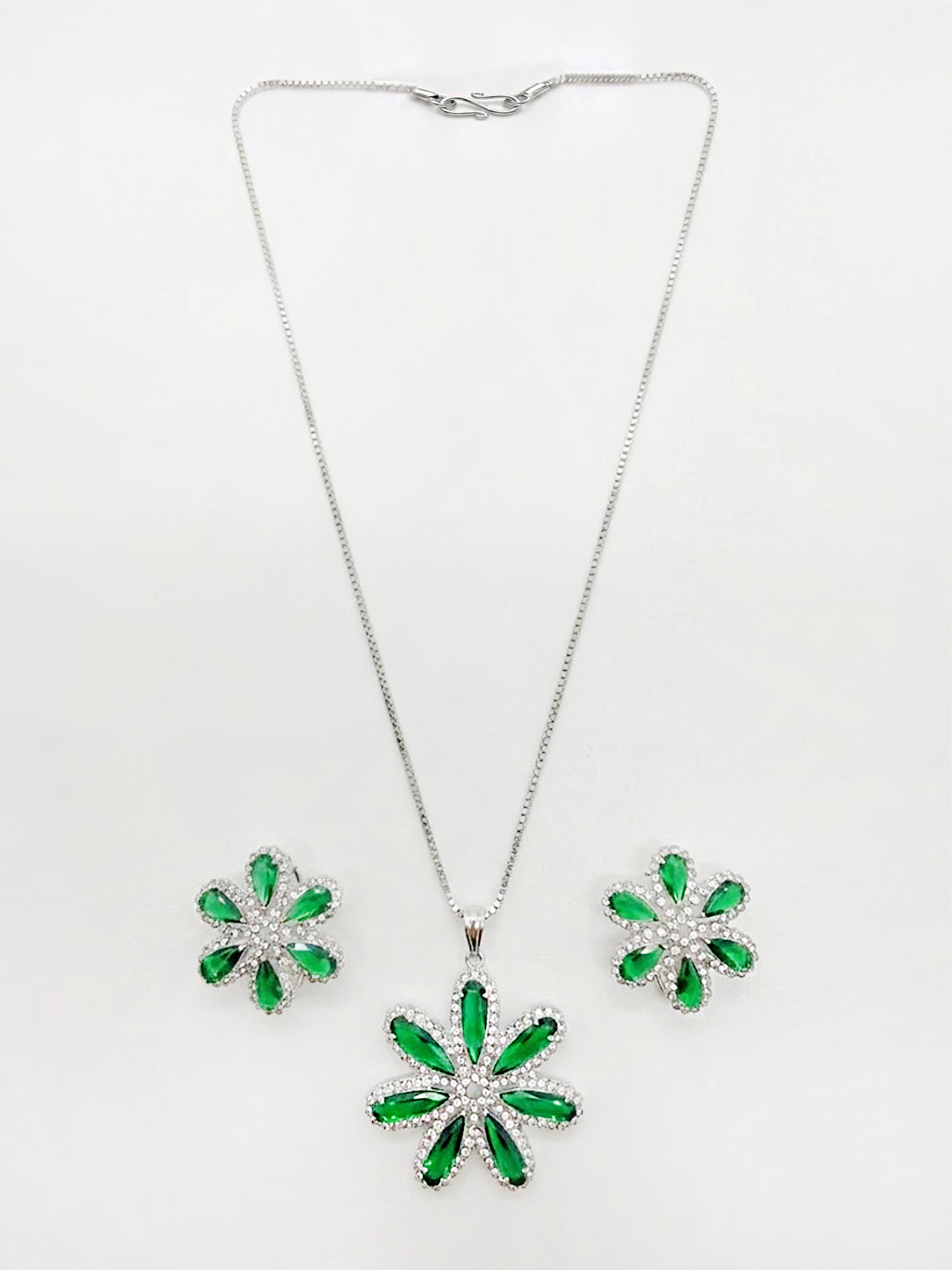 Featuring a delicate floral motif in soothing green tones, this pendant set exudes elegance and natural charm. The intricately crafted pendant is complemented by matching earrings, creating a harmonious and stylish ensemble. Perfect for casual outings, festive occasions, or special gatherings, this set adds a graceful and refreshing sparkle to both traditional and contemporary outfits.