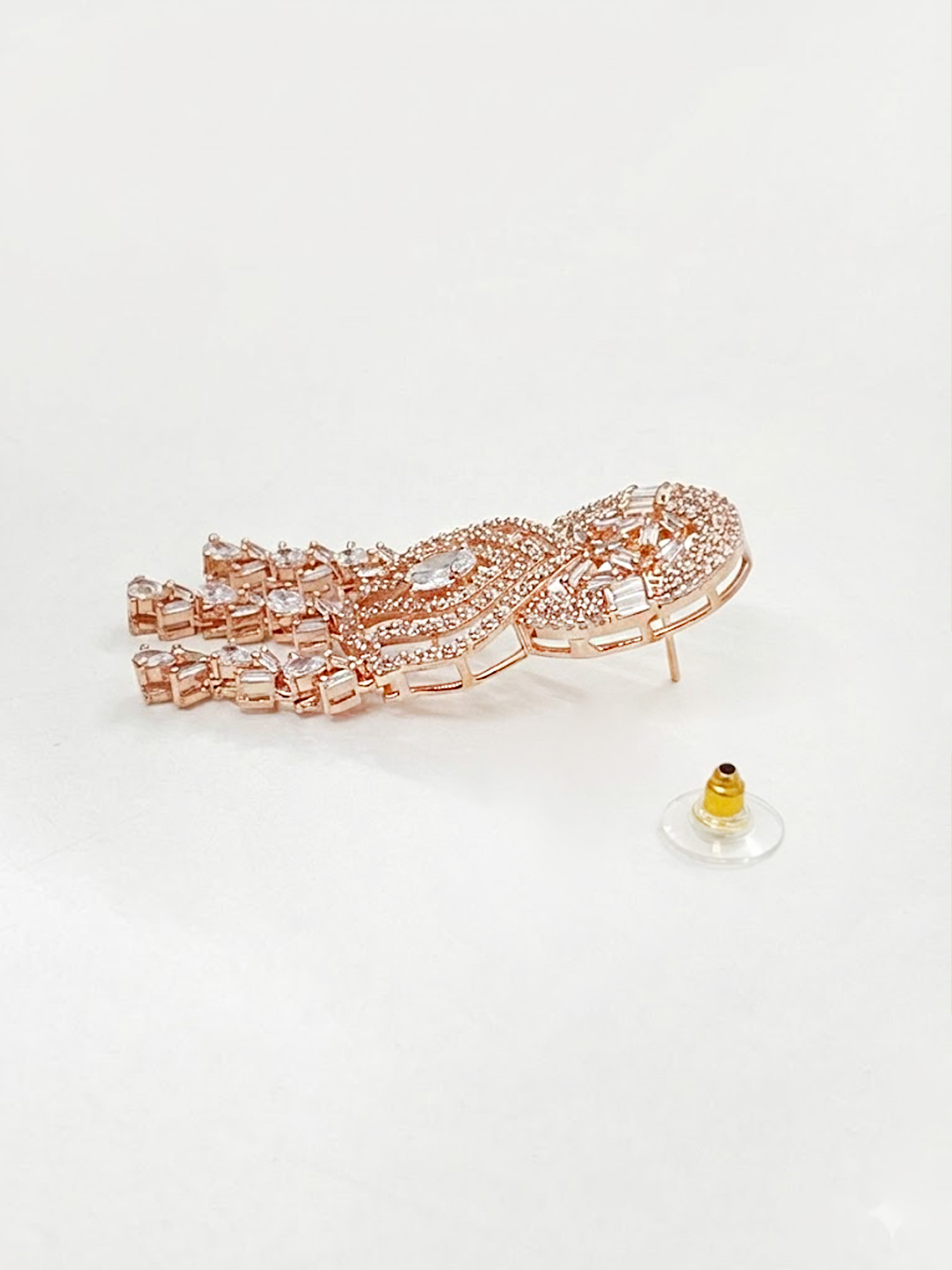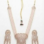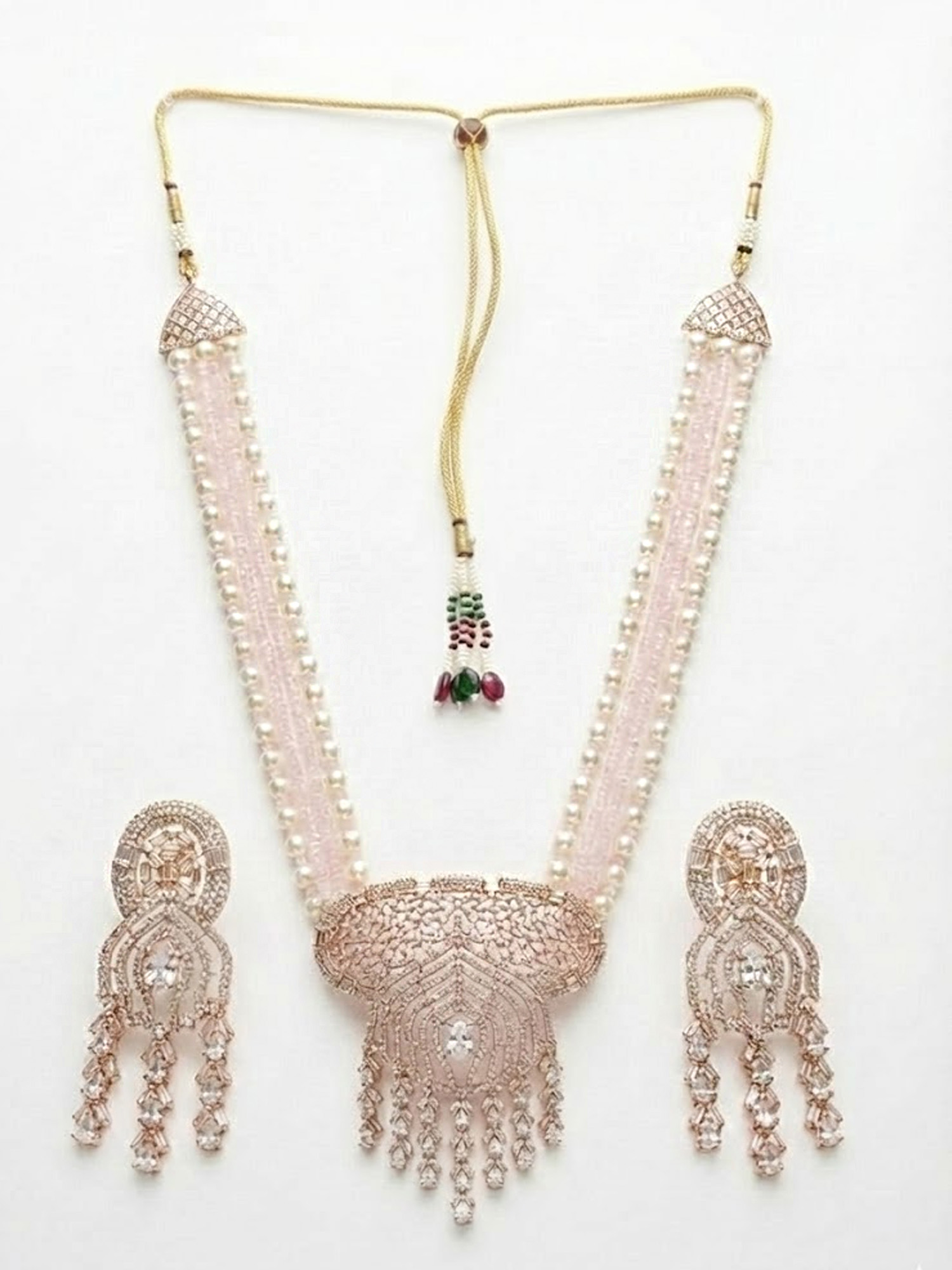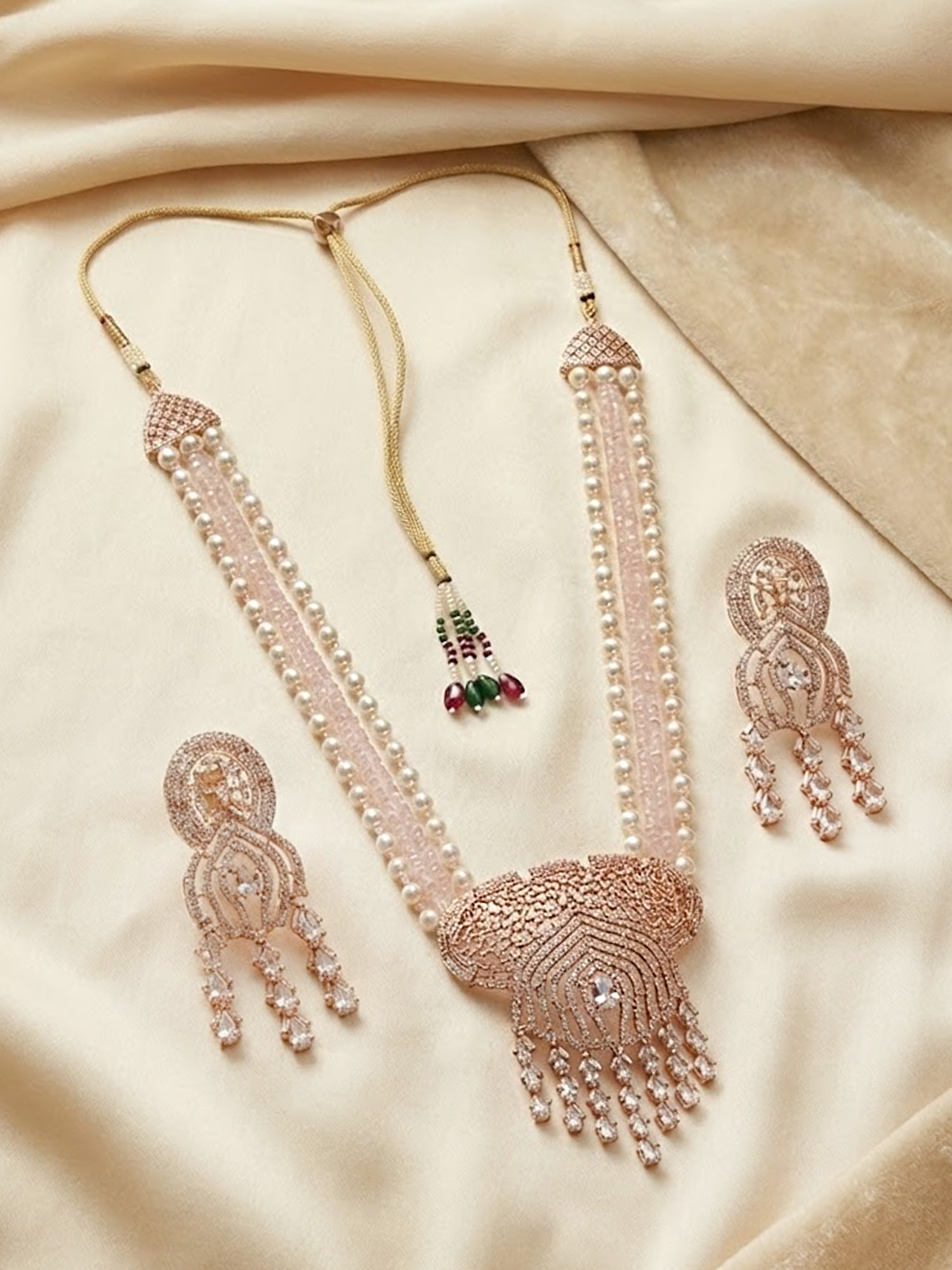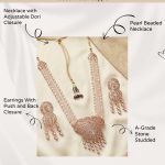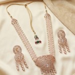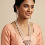 Featuring lustrous pearls combined with sparkling American Diamond (AD) accents, this long necklace exudes timeless elegance and regal charm. The gold-plated finish adds a luxurious touch, while the matching earrings complete the coordinated ensemble. Perfect for weddings, festive occasions, or formal celebrations, this exquisite set enhances traditional bridal outfits and contemporary ethnic wear alike.