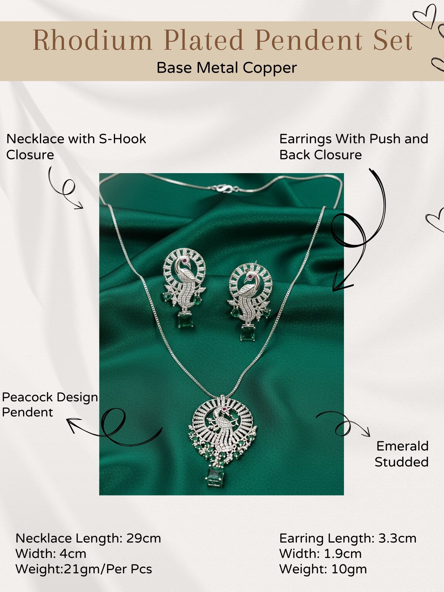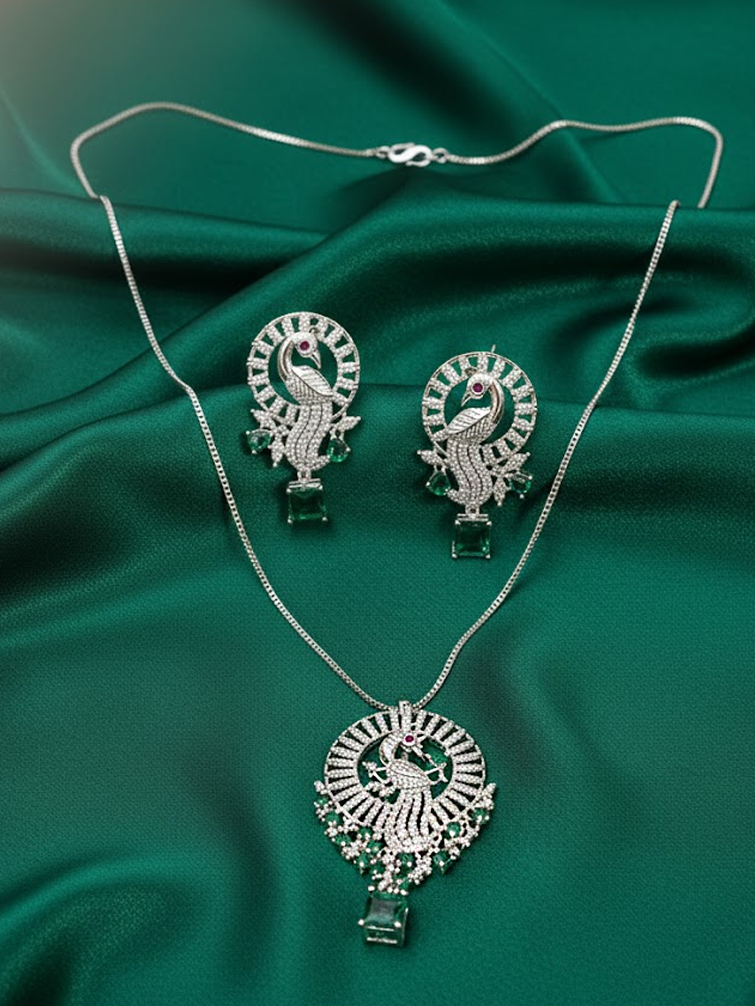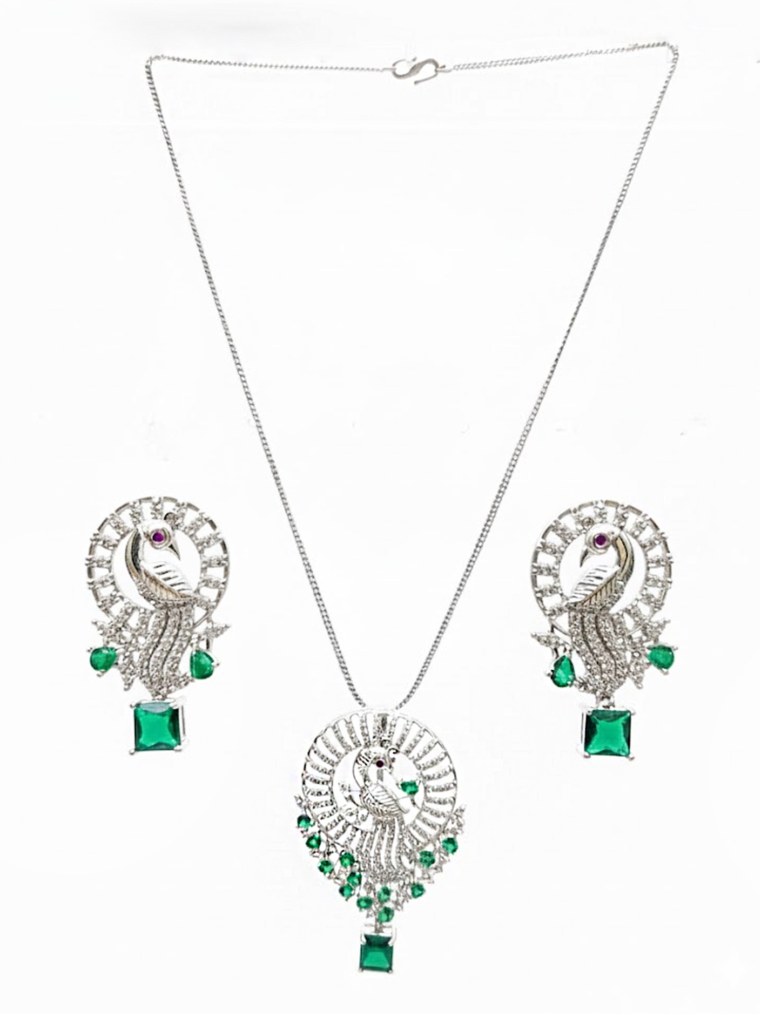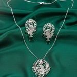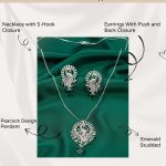 Inspired by the elegance of the peacock, this pendant set showcases intricate detailing that reflects grace, tradition, and charm. The silver-finish pendant hangs beautifully from a sleek chain, while the matching earrings complete the coordinated look. Ideal for festive occasions, cultural events, or everyday elegance, this jewelry set pairs effortlessly with ethnic as well as contemporary outfits.