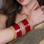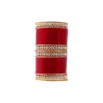 Set of 33 Acrylic bangle Red Gold-plated Stone-Studded Wedding Bridal embellished bangles&Chuda with intricate textured and beaded detailing, slip on closure,These are of High quality Stone studded and is long lasting and non allergic to skin.