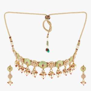 This Pendent set consist of Green stone-studded pendent, secured with a Locked-Hook closure,A pair of matching embellished Stud earrings, secured with post and back closure.