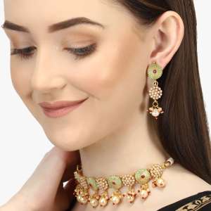 This Pendent set consist of Green stone-studded pendent, secured with a Locked-Hook closure,A pair of matching embellished Stud earrings, secured with post and back closure, Note: Rhodium-Plating is long lasting and non allergic to skin