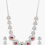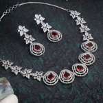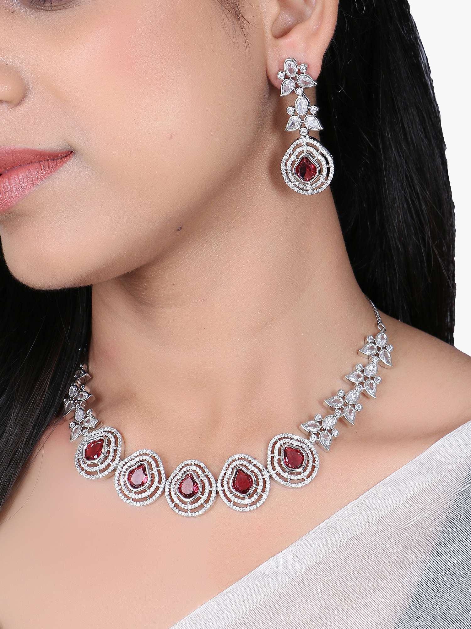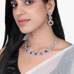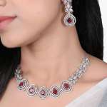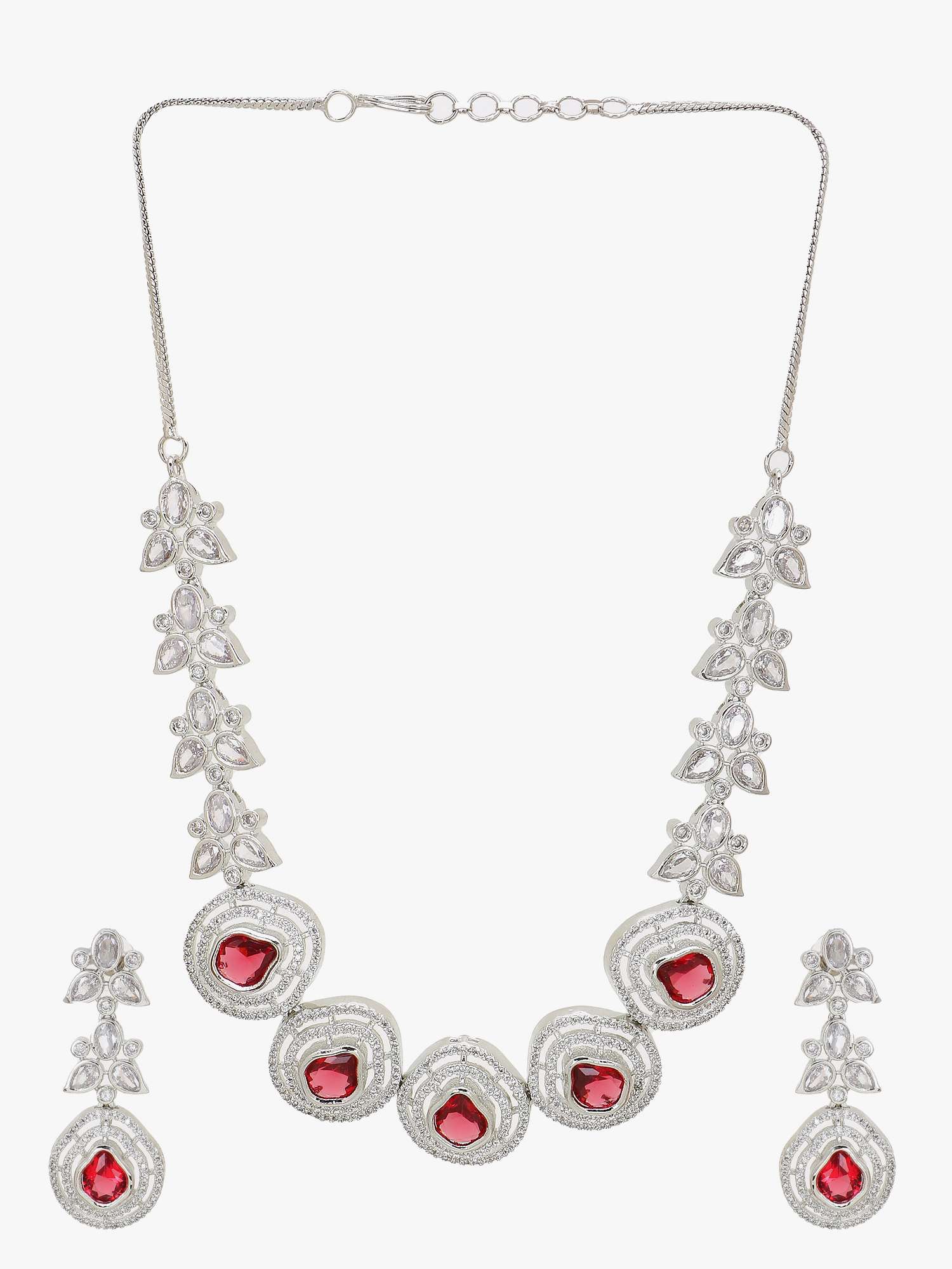 This Necklace set stone-studded , secured with a Locked-Hook closure,A pair of matching embellished Drop earrings, secured with post and back closure,Note: Rhodium-Plating is long lasting and non allergic to skin