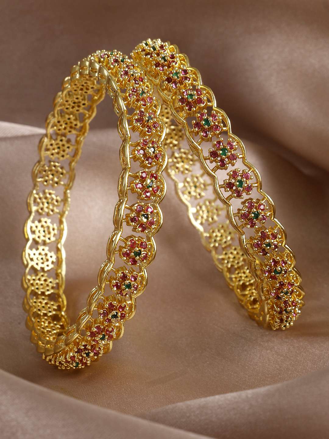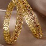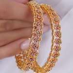The gold-plated multicolor pattern bangles and kada are stunning jewelry pieces that combine traditional artistry with modern flair. Crafted from high-quality metal and adorned with intricate Flower designs, these accessories feature vibrant colors that add a lively touch. Perfect for festive occasions or everyday wear, they can be worn individually or stacked for a bold statement. Their lightweight construction ensures comfort, making them a versatile addition to any jewelry collection.