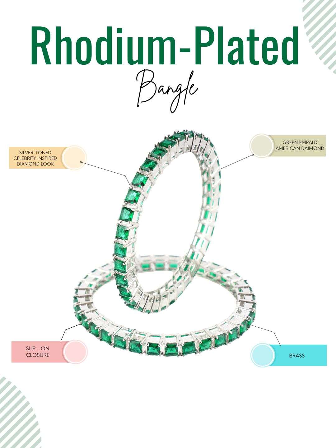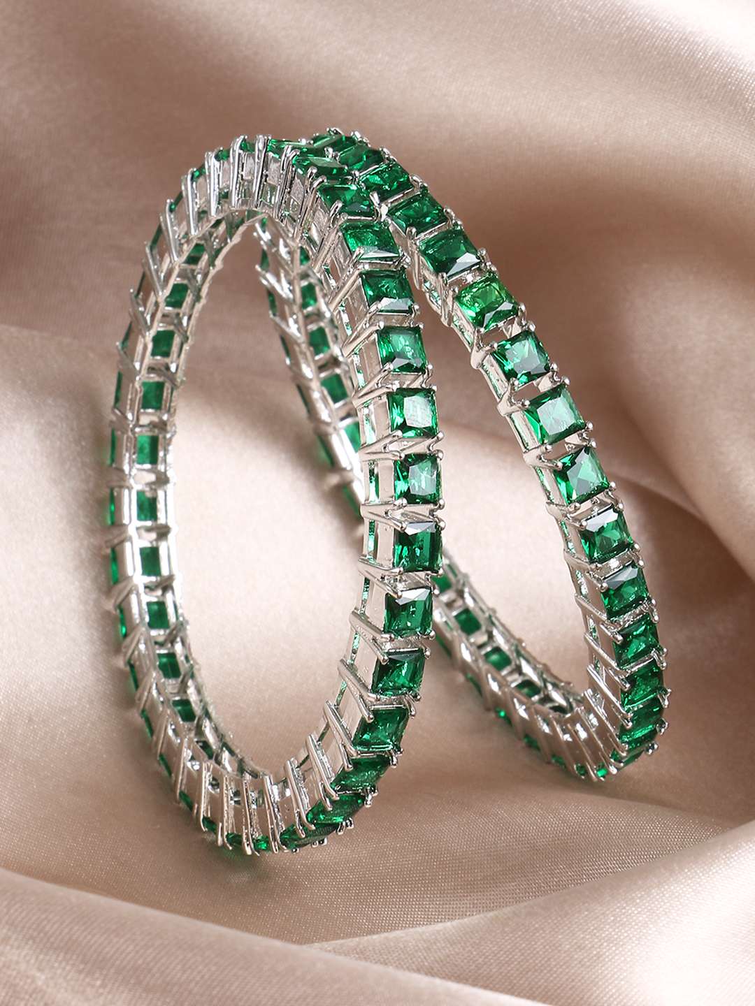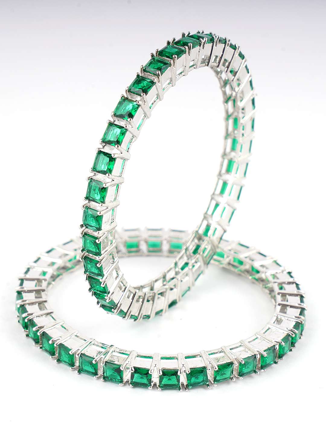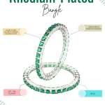 Rhodium-plated bangles are jewelry pieces made from a base metal coated with a layer of rhodium, a precious metal from the platinum family. The rhodium plating gives the bangles a shiny, reflective finish, enhancing durability and tarnish resistance and adding a white, mirror-like luster. This plating also helps prevent skin irritation for sensitive wearers. Rhodium-plated bangles are popular for their elegant, high-end appearance and long-lasting shine.