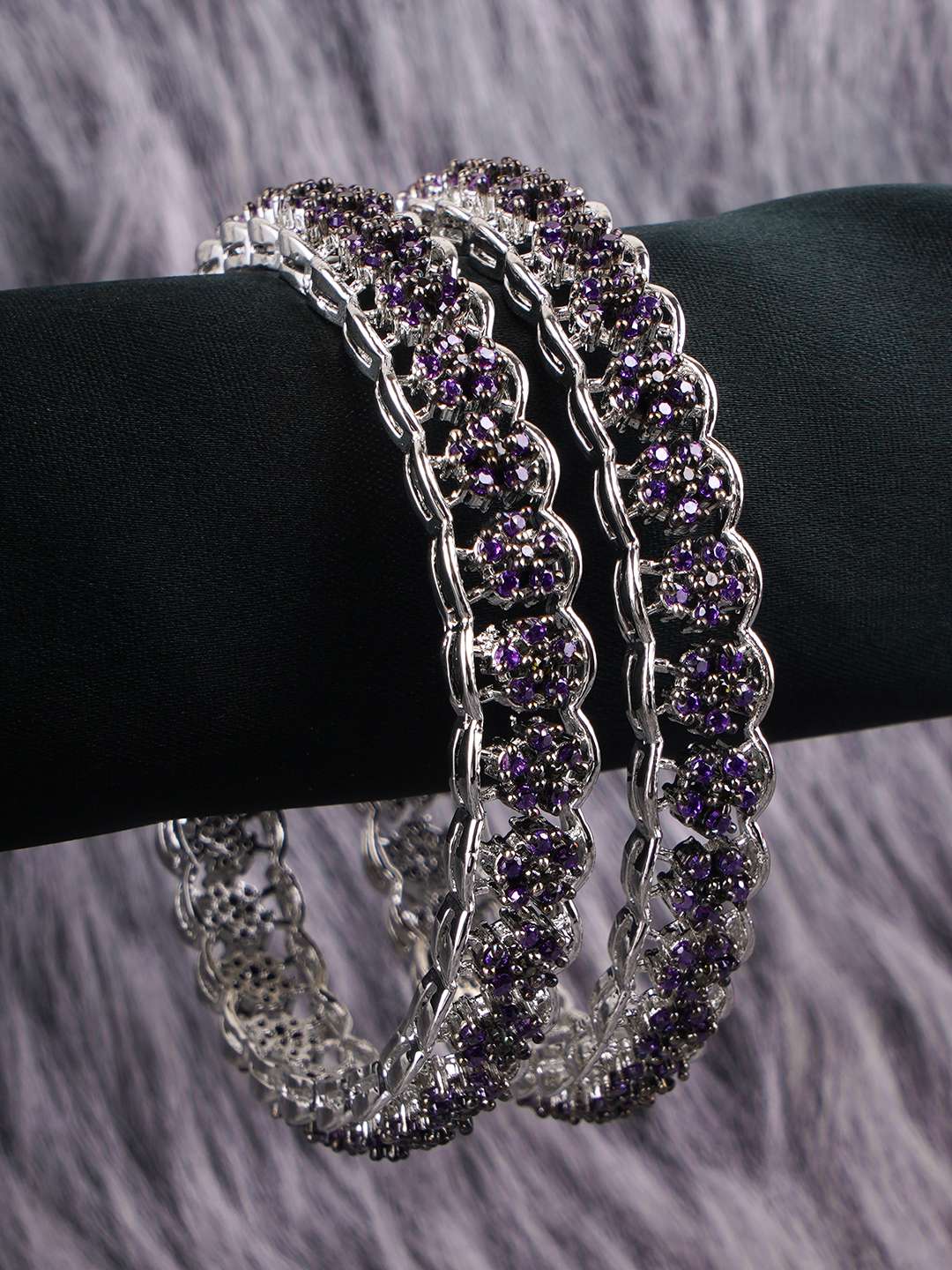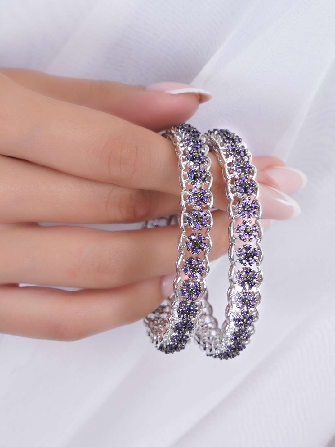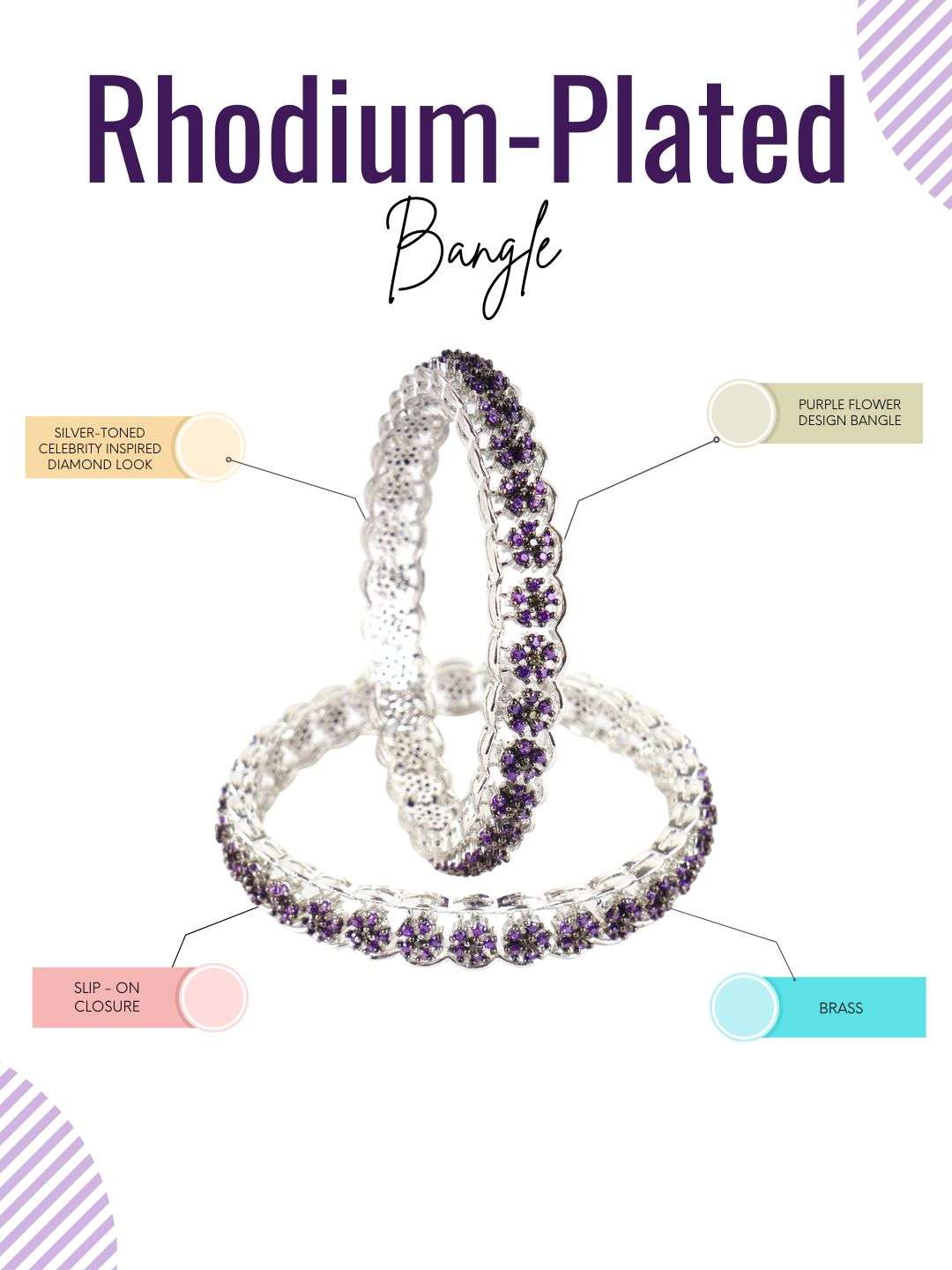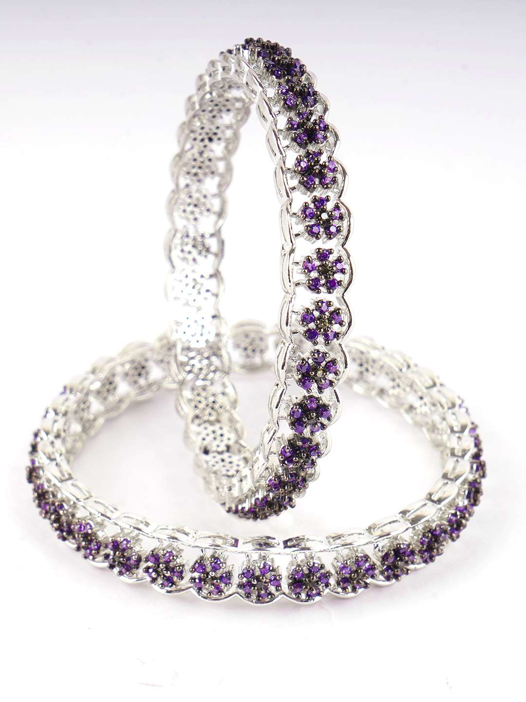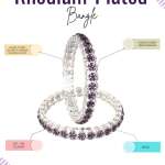 Rhodium-plated bangles are jewelry pieces made from a base metal coated with a layer of rhodium, a precious metal from the platinum family. The rhodium plating gives the bangles a shiny, reflective finish, enhancing durability and tarnish resistance and adding a white, mirror-like luster. This plating also helps prevent skin irritation for sensitive wearers. Rhodium-plated bangles are popular for their elegant, high-end appearance and long-lasting shine.