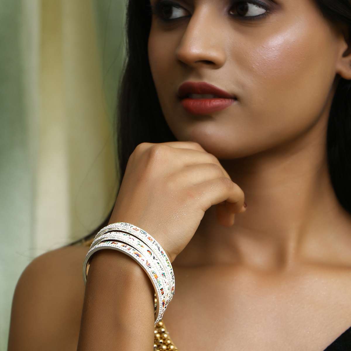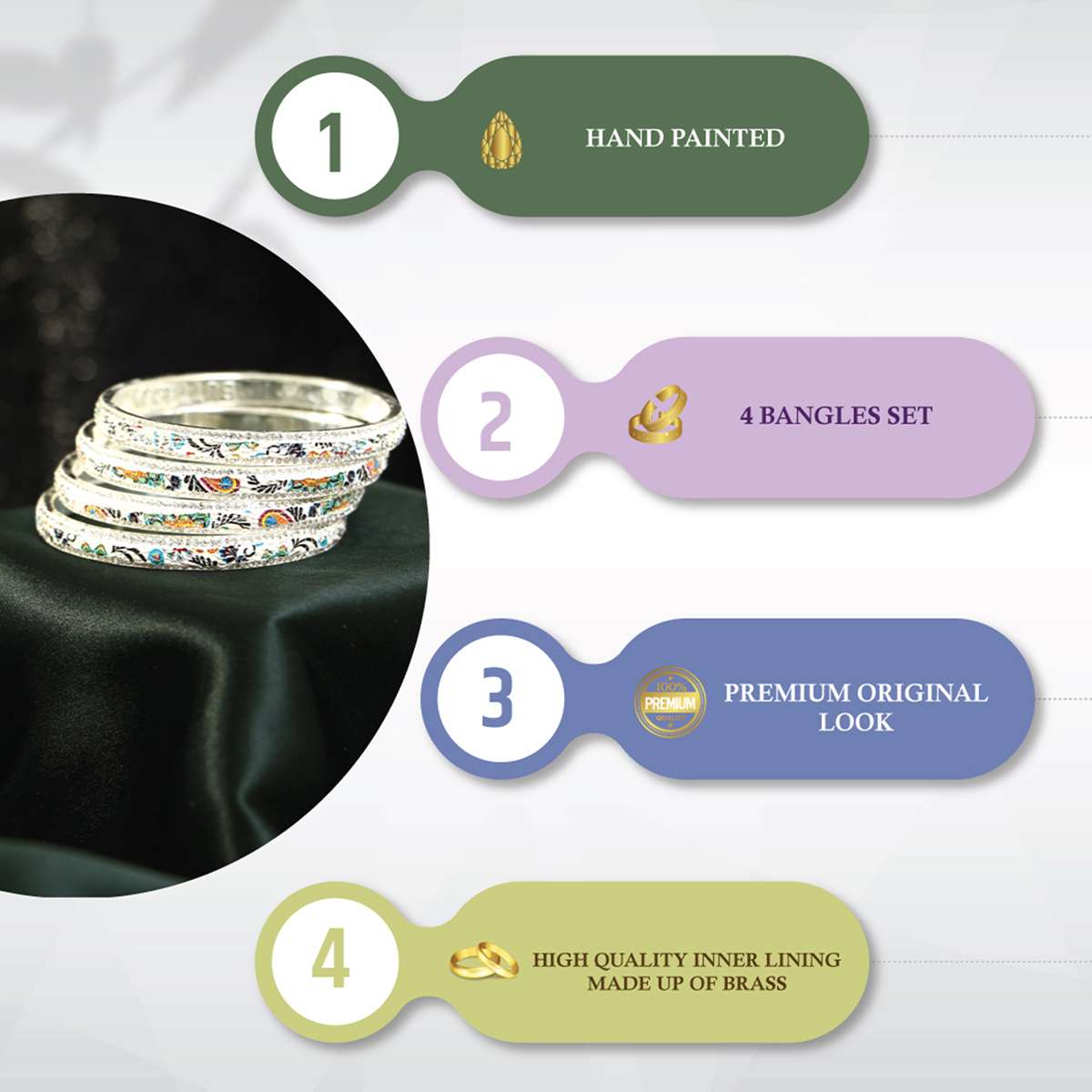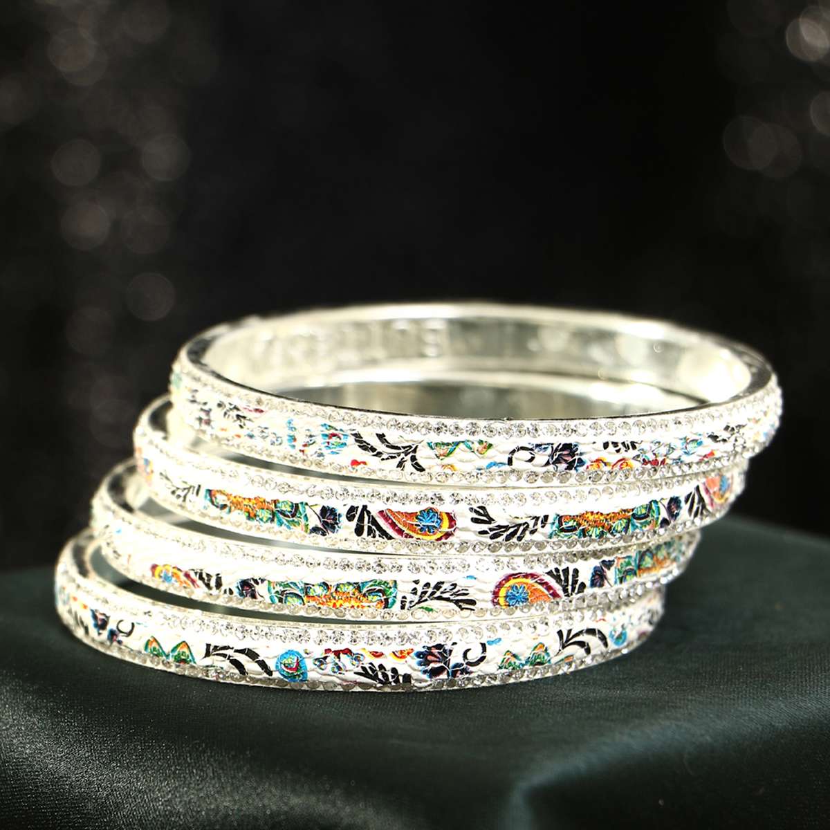 Women Set of 4 Gold Plated Stone Studded Printed White Lac Bangles. Our Gold Plating is long lasting and non-allergic to skin