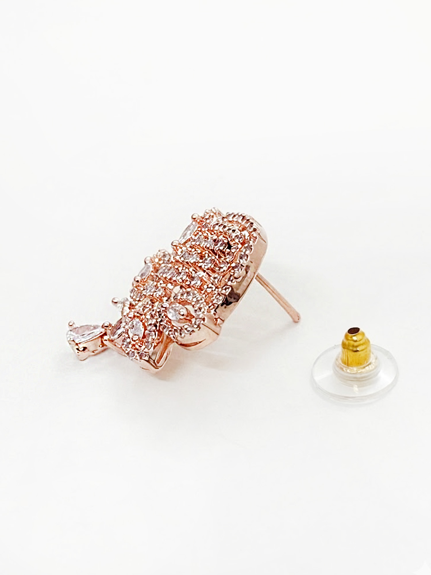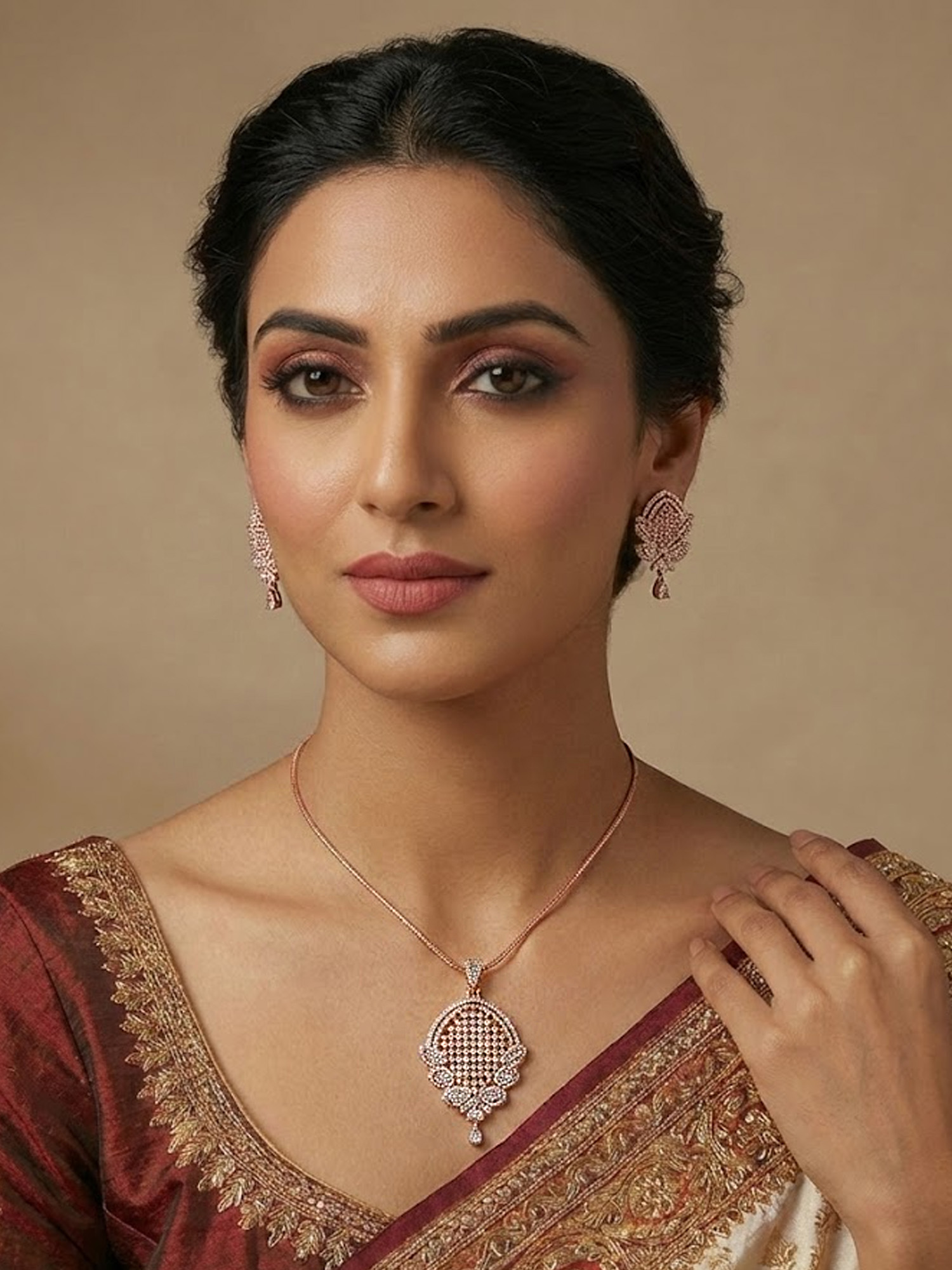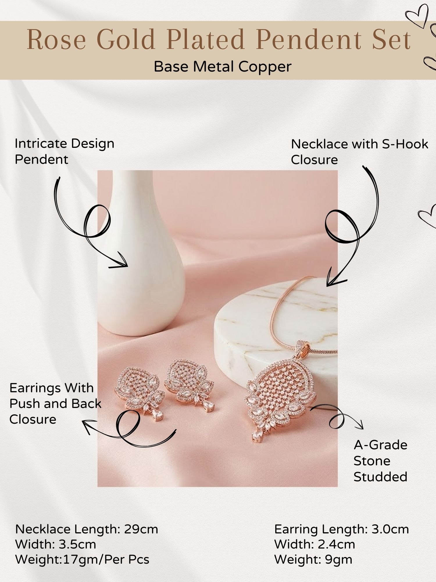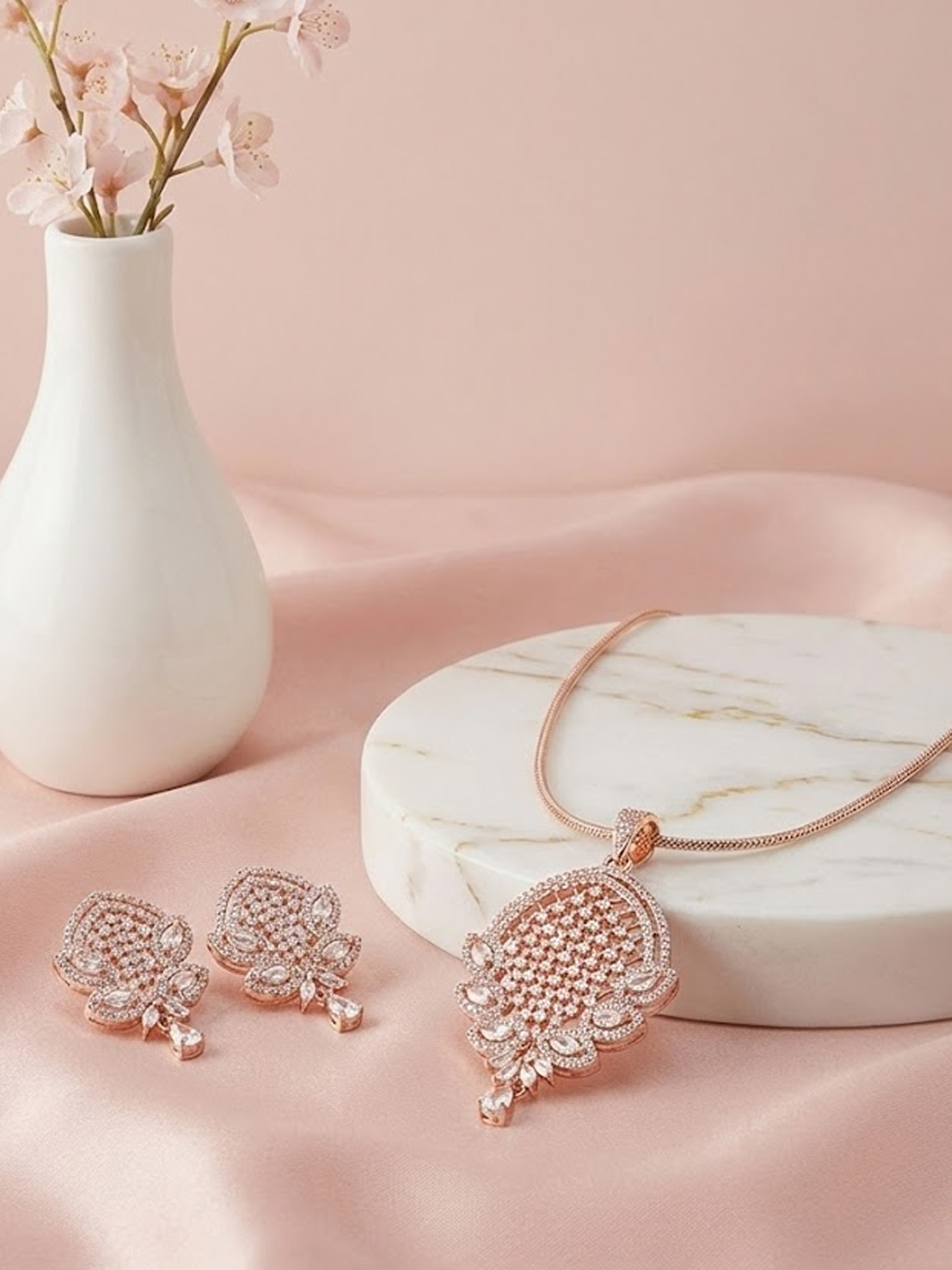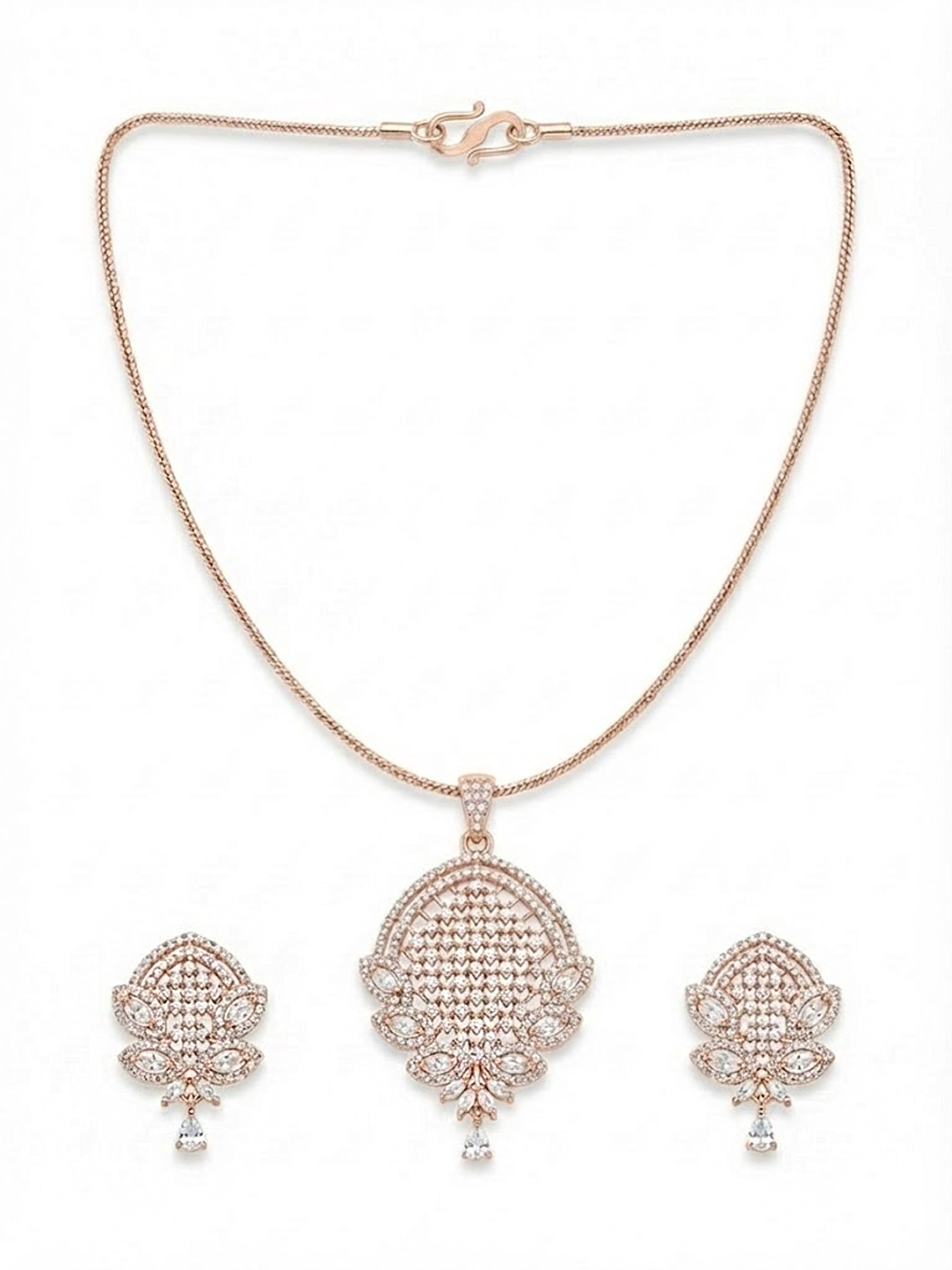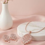 Beautifully crafted with a warm rose gold finish, the pendant and earrings are adorned with sparkling zircon stones that catch the light effortlessly. The sleek chain enhances the pendant’s delicate design, making this set perfect for everyday elegance as well as special occasions. Pair it with ethnic or western outfits for a graceful and modern appeal.