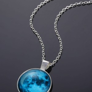 Eclipse Glow-in-the-Dark Pendant with Blue Moonstone Charm ? Silver-Plated Stainless Steel Chain