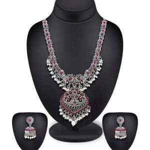 Women Silver Plated AD Stone and Pink Pearl Beaded Traditional long Jewellery Set, get secured with drawstring closure. Our Silver Plating is Long Lasting and non-allergic to skin.