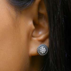 Women Rhodium plated bomber studs with cubic zirconia stones, Our Rhodium plating is long lasting and non allergic to skin,and has artificial stones,Secured with a fraction Back closure.