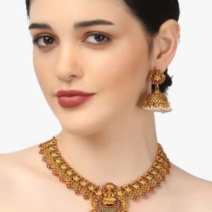 Gold-Plated Laxmi Godess-Temple Red and Green Stone White Pearl Antique Jewellery Set This jewellery set consist Stone Gold-plated and stranded with Drawstring closure.,