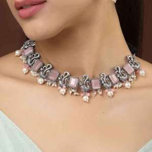 Oxidized Silver-Toned Pink Peacock Shaped Pearl Choker Necklace